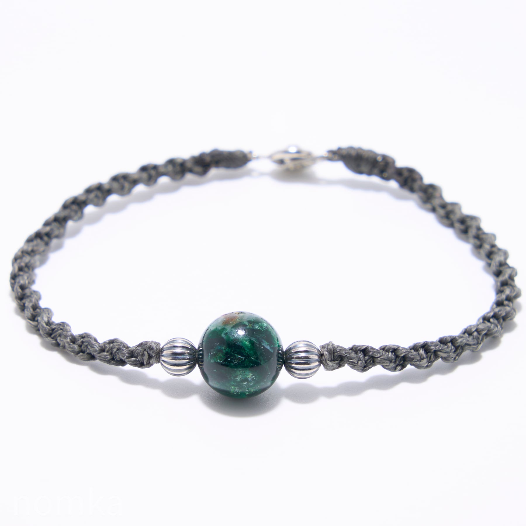 中心の天然石以外は編み紐なので一本で着けてもよし、時計やバングルなどとの組み合わせも楽しめるアイテムです。