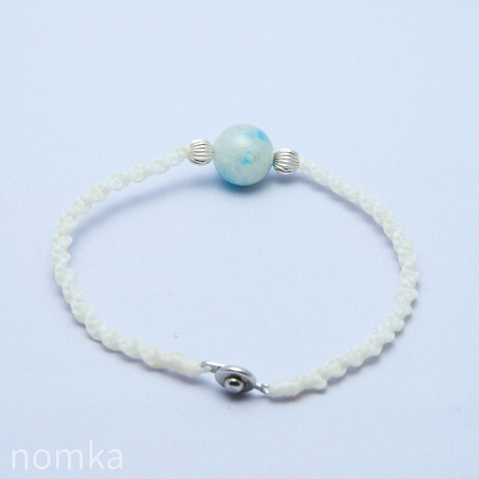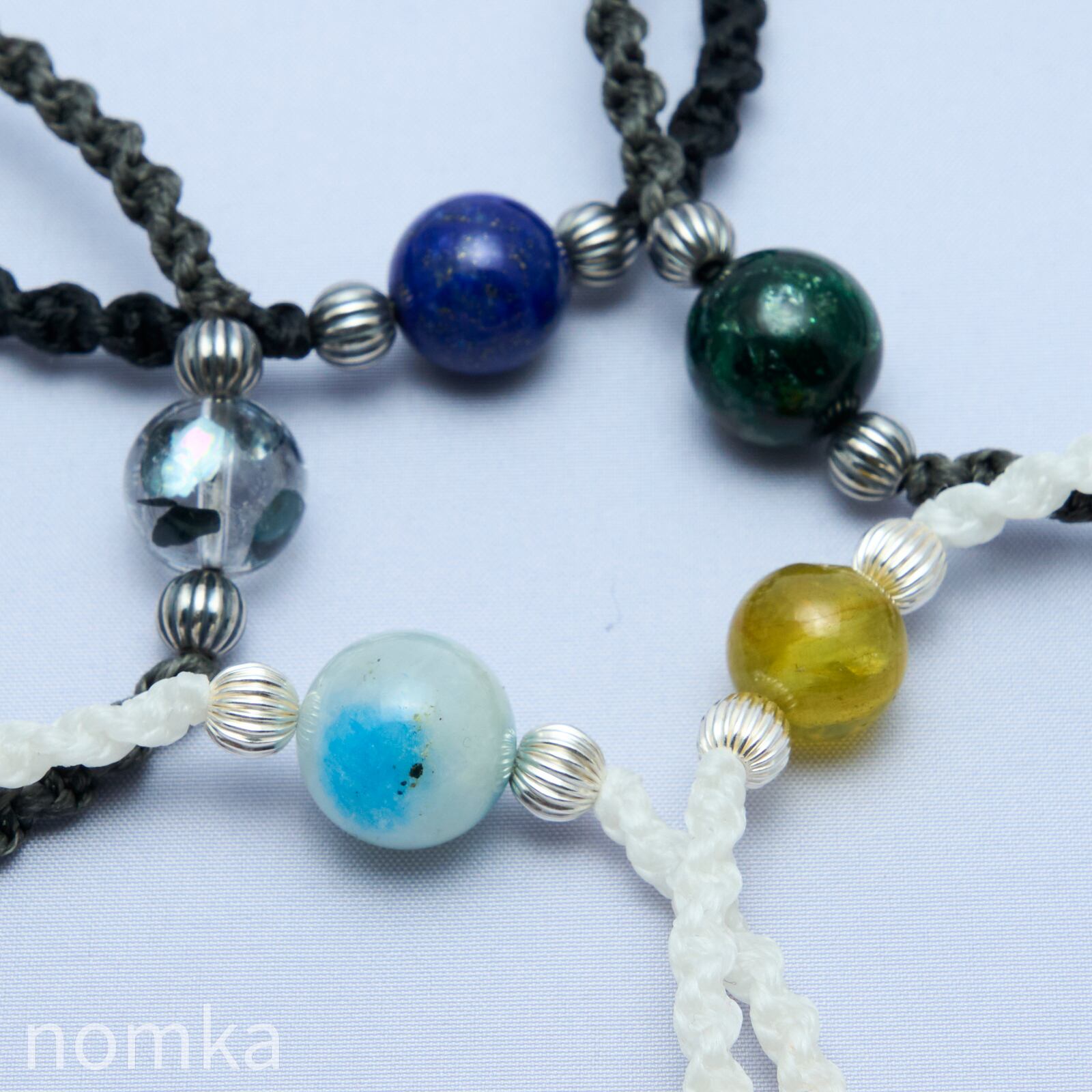 中心の天然石以外は編み紐なので一本で着けてもよし、時計やバングルなどとの組み合わせも楽しめるアイテムです。