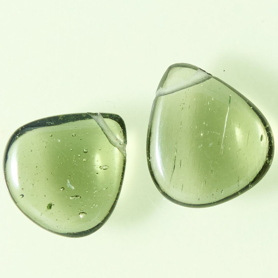 ほとんどが黒色のテクタイトの中でも、リビアングラスやモルダバイトは色を持つ希少な宝飾品として美しい彩りをみせます。モルダバイトの色の特徴である透明感の緑〜深緑、オリーブグリーンの色味は鉄などの不純物を含む事に起因します。