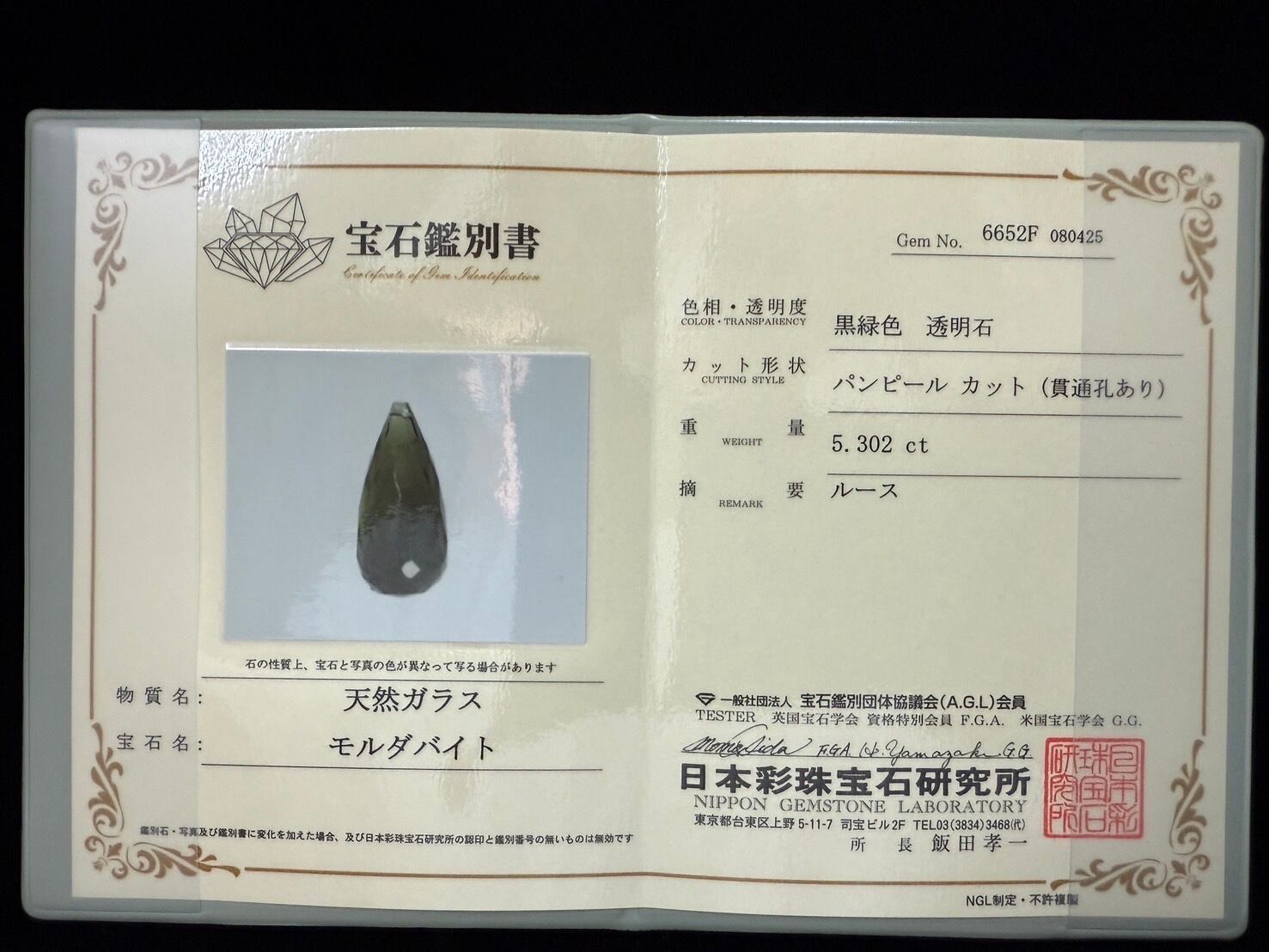 【稀少石】(1pic/鑑定書付) モルダバイト 5.302ct/ブリオレットカット/穴あり【チェコ共和国】