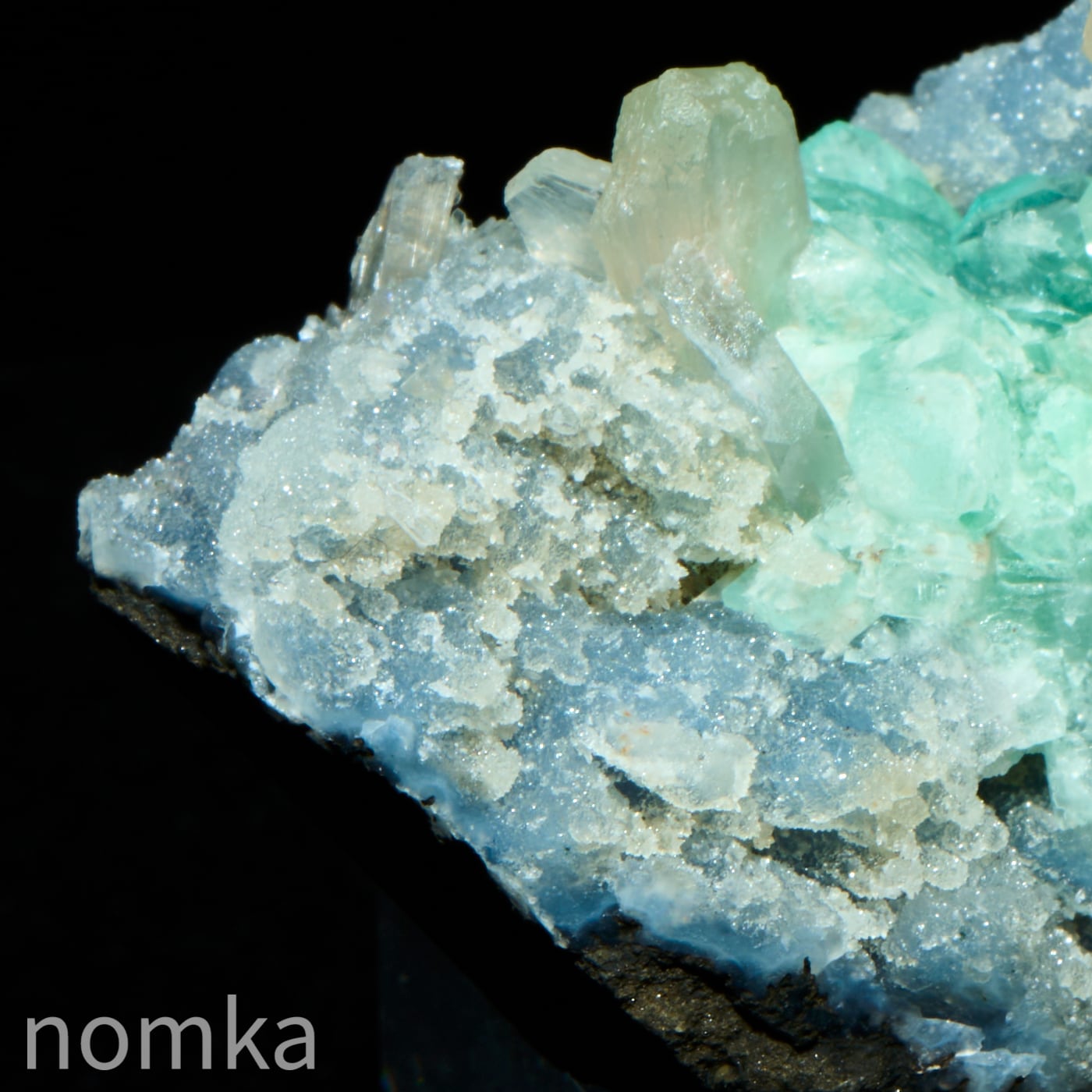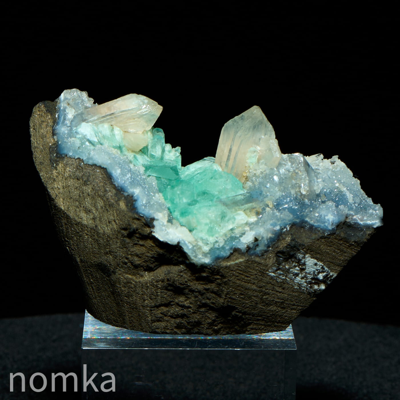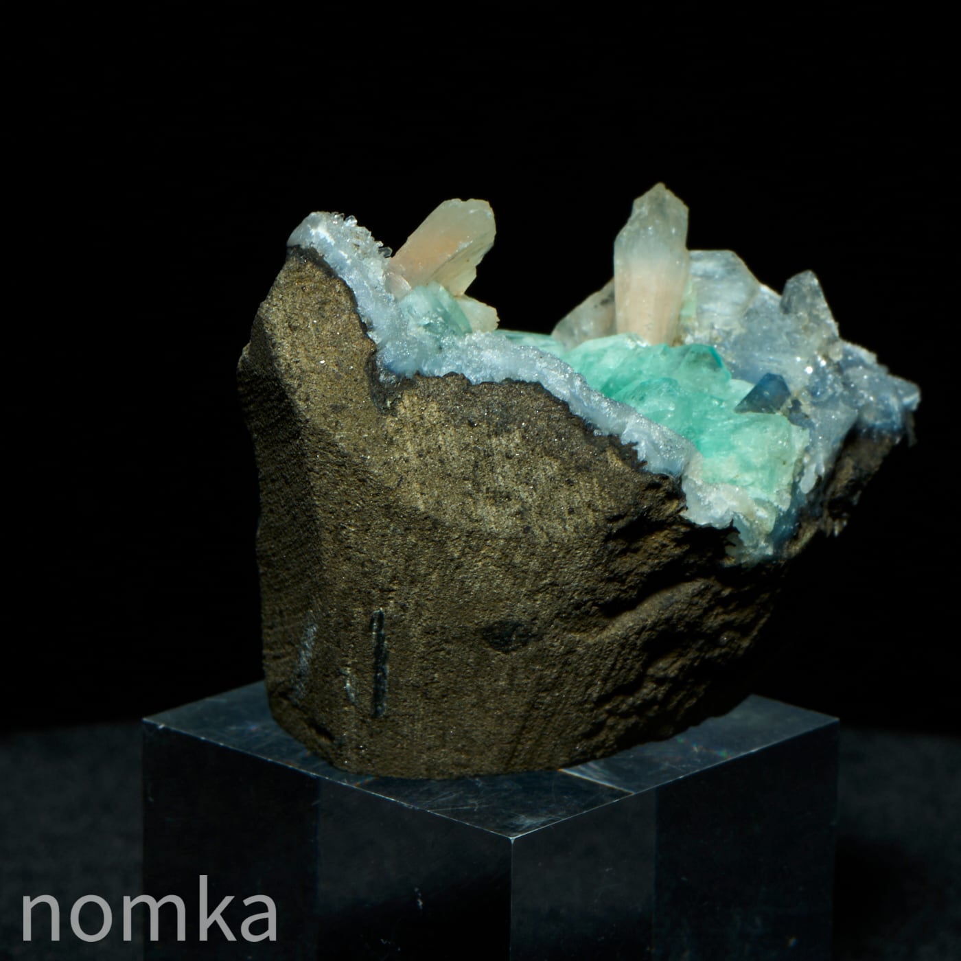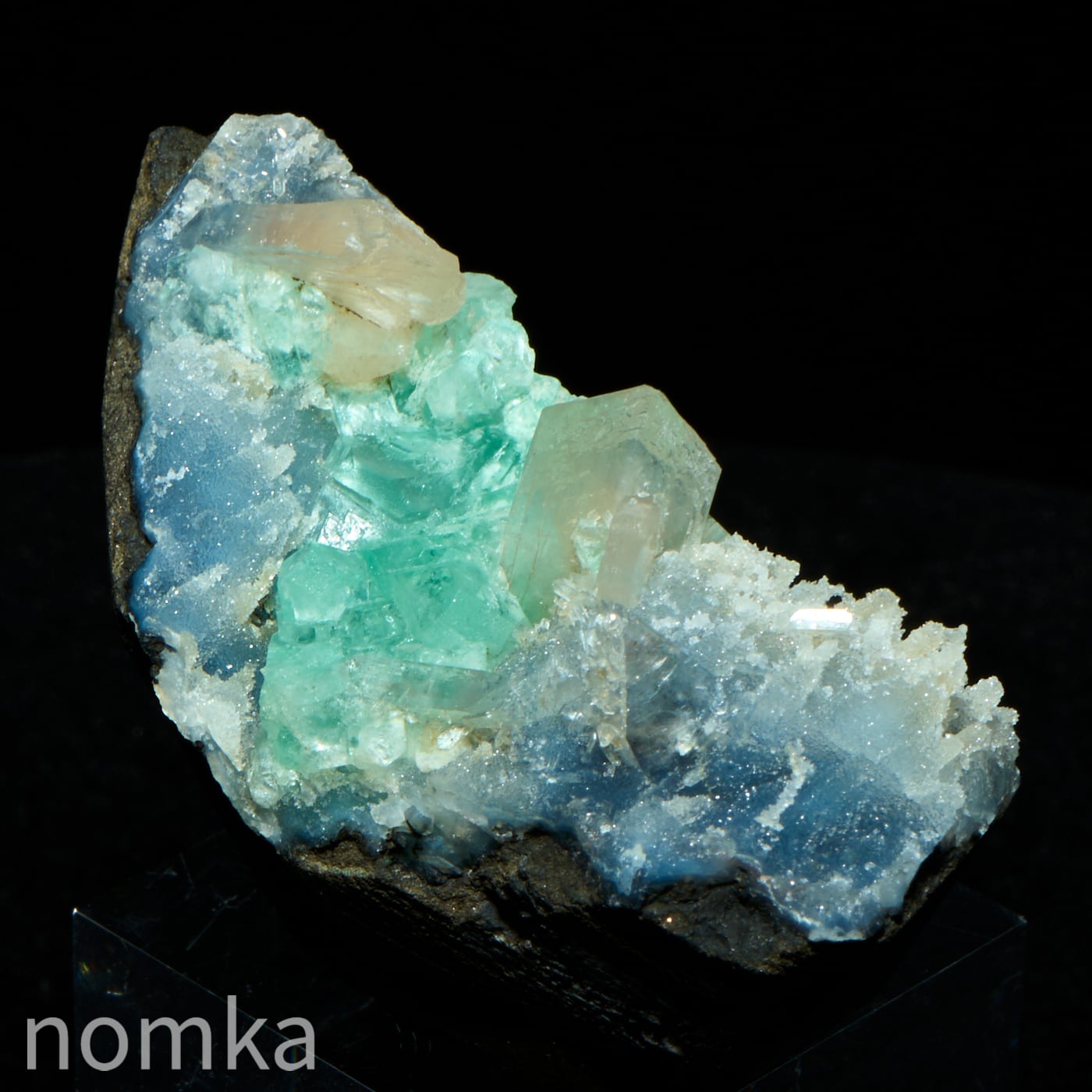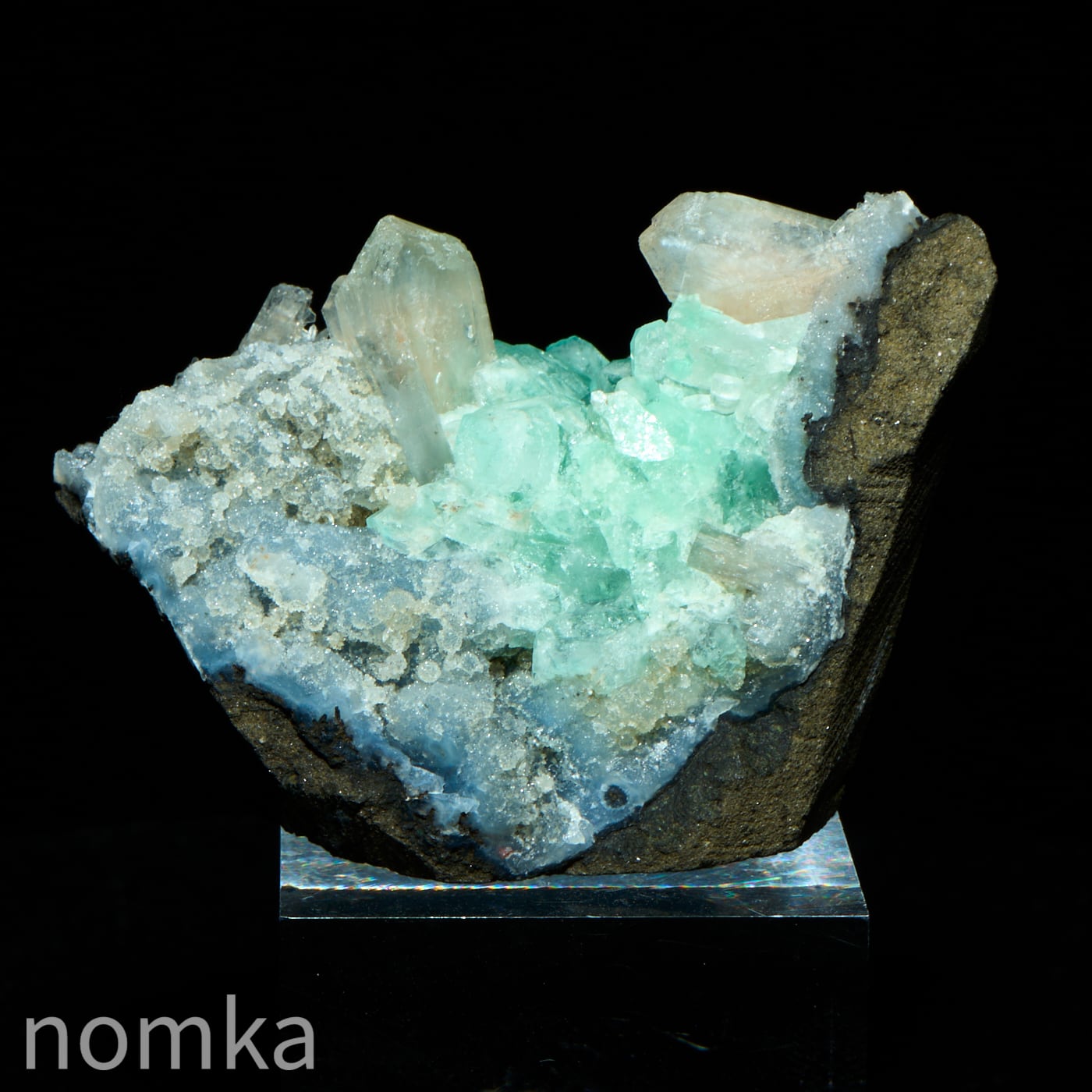 ペールカラーのグリーンアポフィライトとスティルバイトとゼオライトが綺麗に共生した原石です。