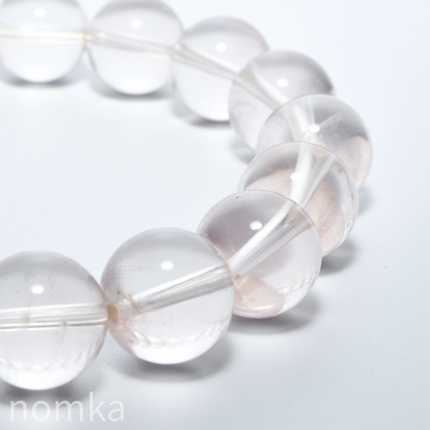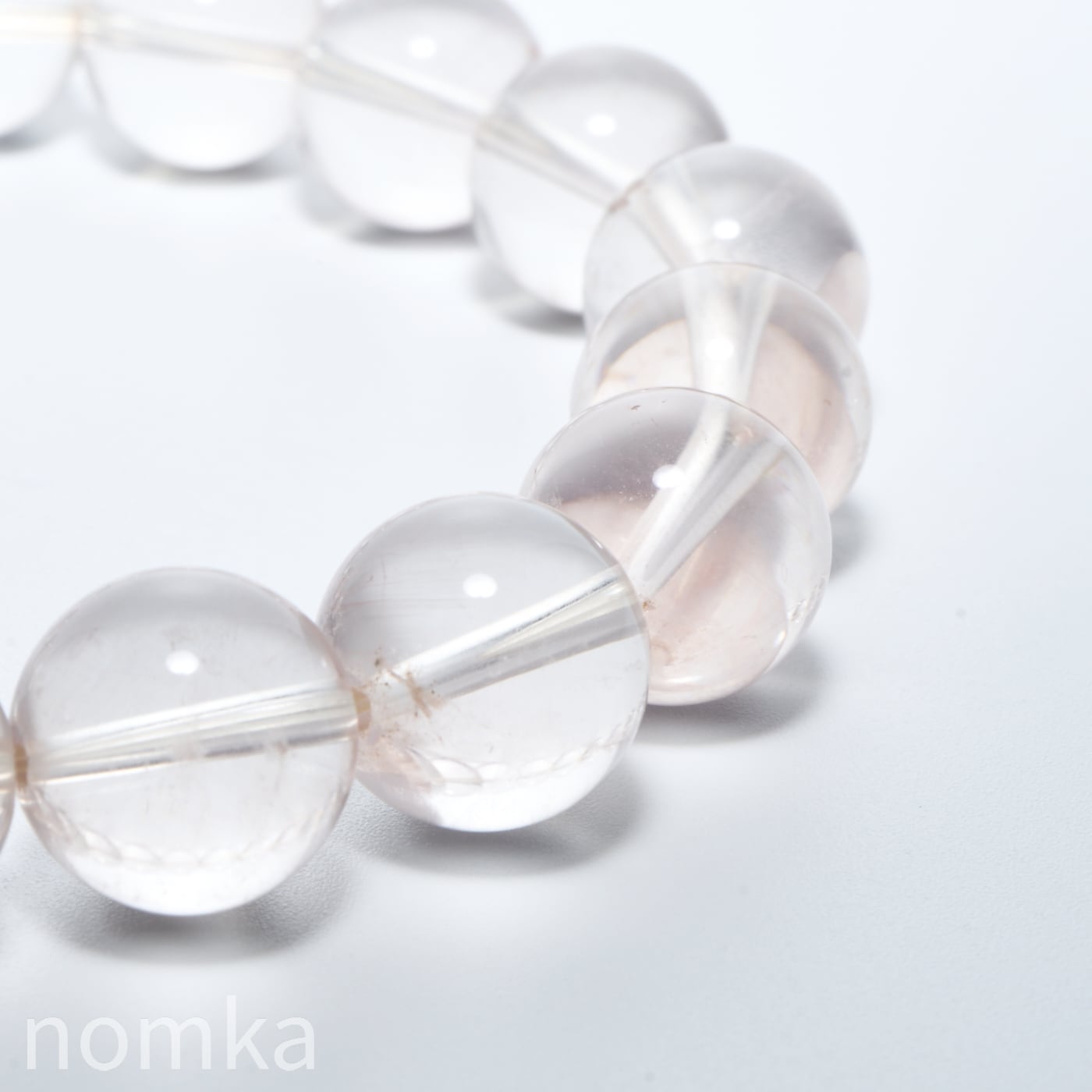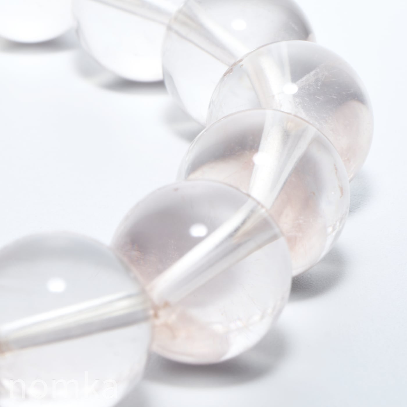 透明度の高い水晶の中に淡く美しい赤ピンク色のラダーが確認出来る、不思議な魅力の『ピンクエンジェルラダークォーツ』の一連ブレスレットです。ピンク色の中に、ほのかに青白く光るものも混在して見られます。またエンジェルフェザーのような羽根模様が見えるものもあります。肌の上に置くと肌色と同化して見づらいですが、グレーや黒のマットの上に置いてあげると、全体的に赤ピンク色の水晶に見えます。粒によってはピンクと青白いバイカラーに見えるピースもある不思議な魅力満載のブレスレットです。