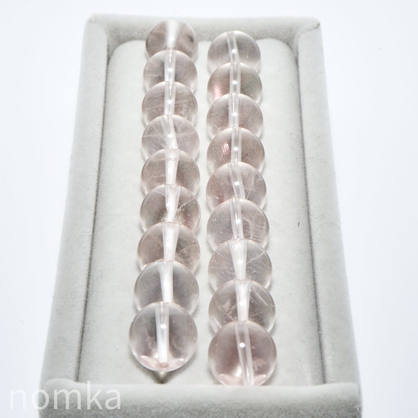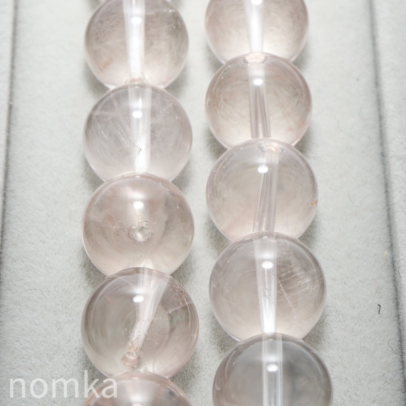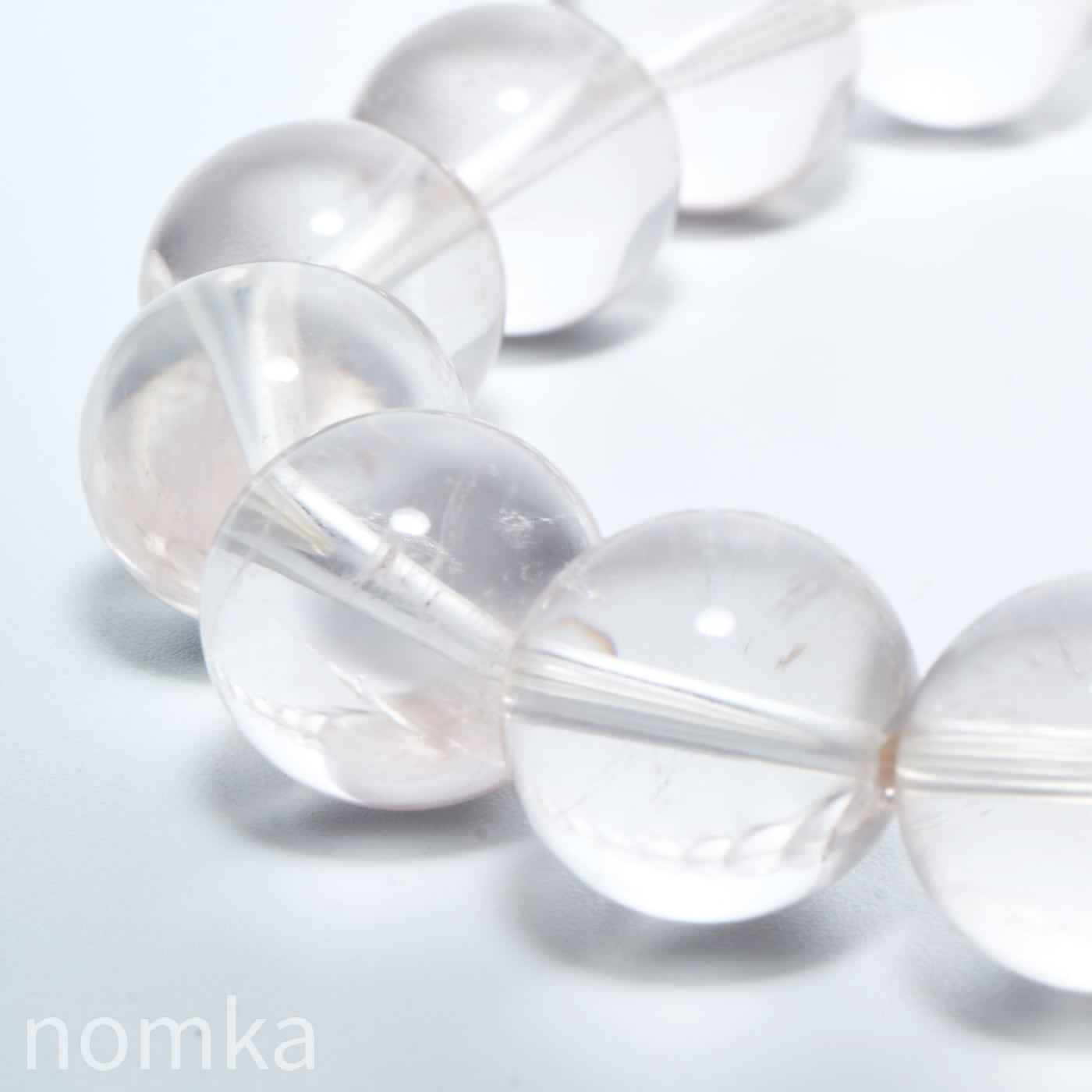 透明度の高い水晶の中に淡く美しい赤ピンク色のラダーが確認出来る、不思議な魅力の『ピンクエンジェルラダークォーツ』の一連ブレスレットです。ピンク色の中に、ほのかに青白く光るものも混在して見られます。またエンジェルフェザーのような羽根模様が見えるものもあります。肌の上に置くと肌色と同化して見づらいですが、グレーや黒のマットの上に置いてあげると、全体的に赤ピンク色の水晶に見えます。粒によってはピンクと青白いバイカラーに見えるピースもある不思議な魅力満載のブレスレットです。