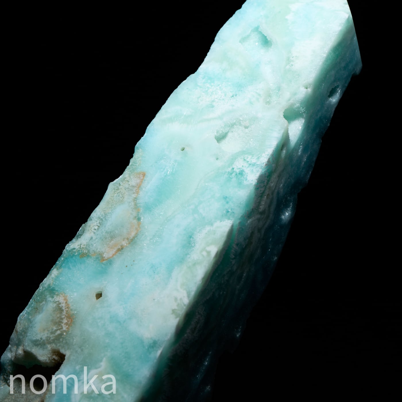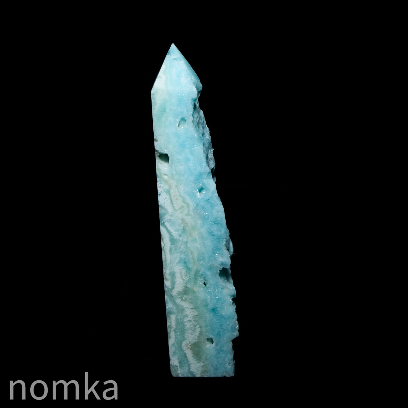 華やかなスカイブルーが美しいブルーアラゴナイトの原石の良さを残しつつ、ポイントに仕上げた美しいポイントタワーです。表面のゴツゴツした原石の表情も楽しめ、裏側のポリッシュした側では白い部分と水色の部分の原石の層が楽しめる魅力的なポイントです。
