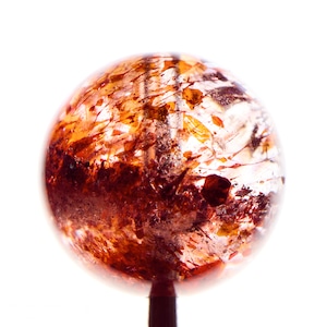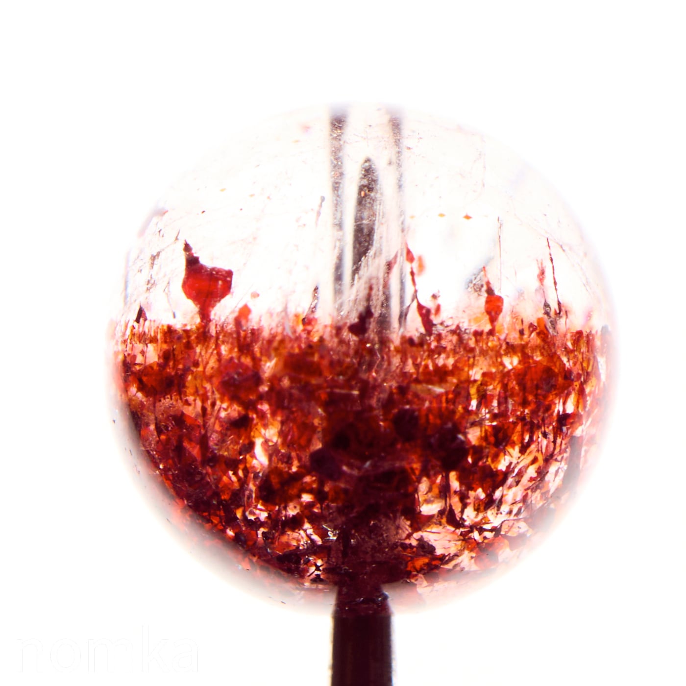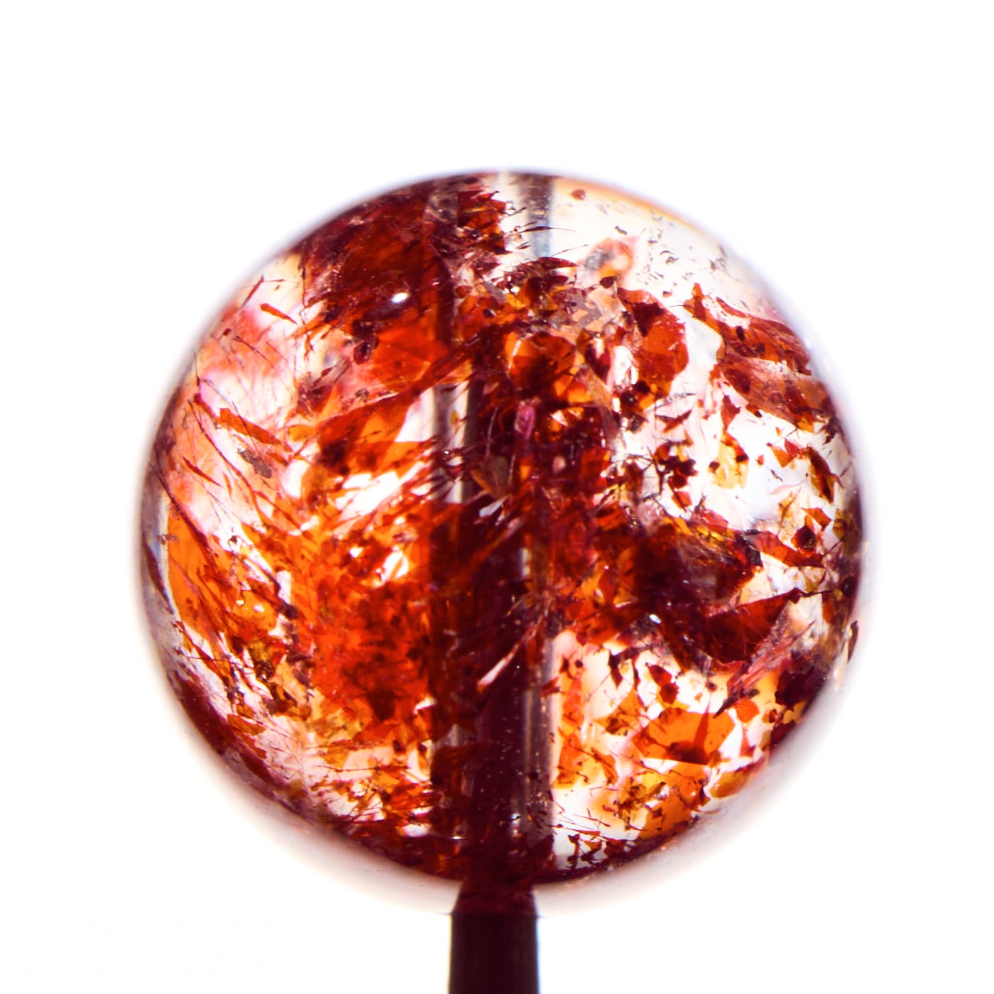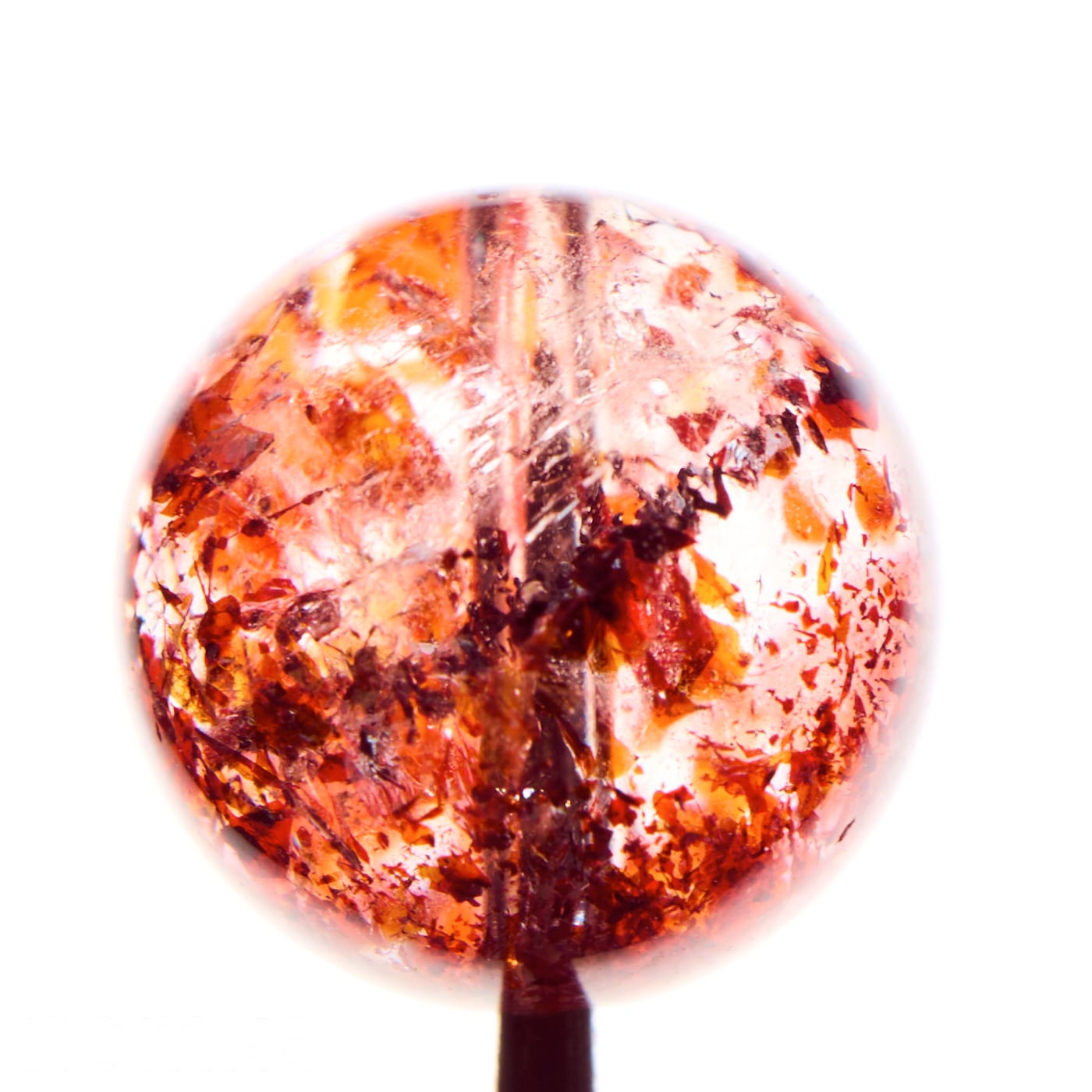水晶の内部に、光るの反射で赤く輝く鱗片状のレピドクロサイトが内包され、美しいアベンチュレッセンス効果(内包鉱物による輝き)が見られるのが特徴です。