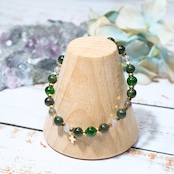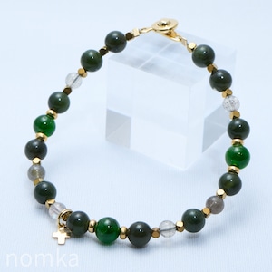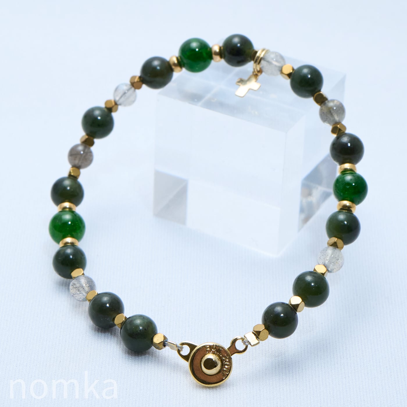 深い緑の美しいネフライトと、鮮やかな色合いのクロムダイオプサイト、そして神秘的な輝きを放つラブラドライトを使用した、洗練されたデザインのブレスレットです。洗練された印象を与えつつ、カジュアルからフォーマルまで幅広いシーンでお楽しみいただけます。