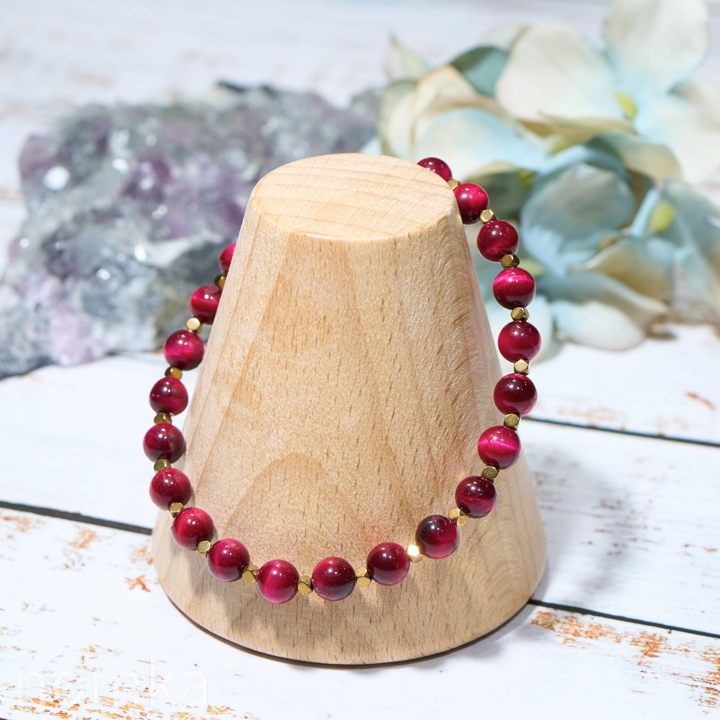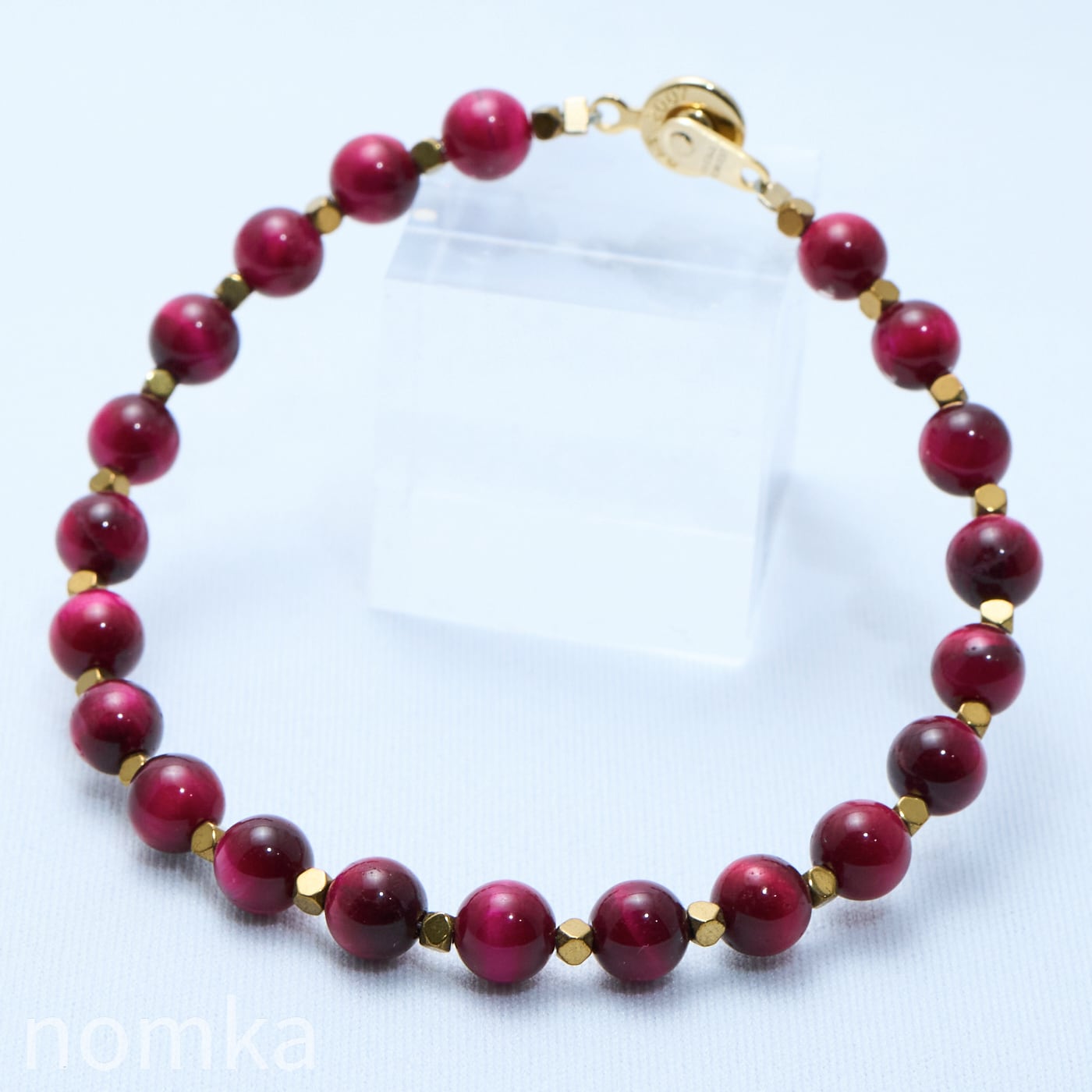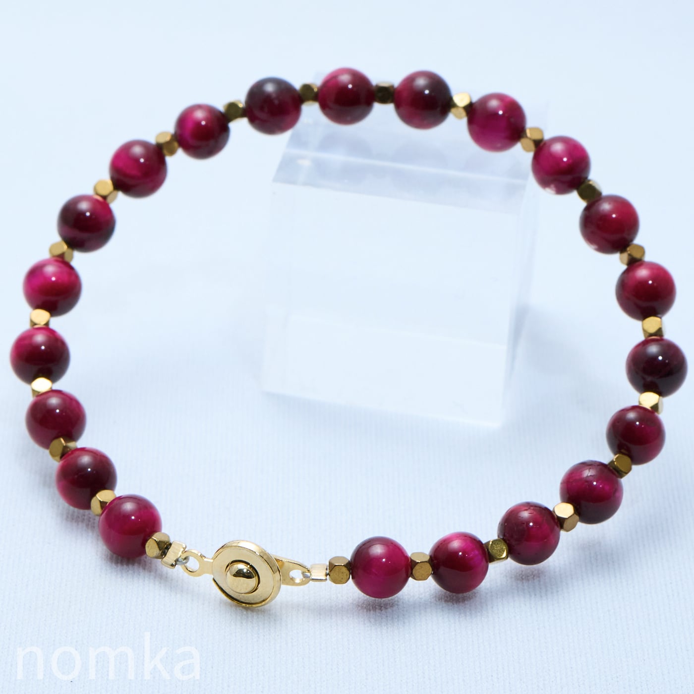 ピンクタイガーアイ(染め)と、華やかなゴールドカラーのヘマタイトを巧みに組み合わせたデザインワイヤーブレスレットです。シンプルながらも、見る人に明るい印象を与えるこのアイテムは、普段使いはもちろん、特別なシーンでも活躍します。あなたの個性を引き立てながら、コーディネートに華やかさを添えること間違いなしです!