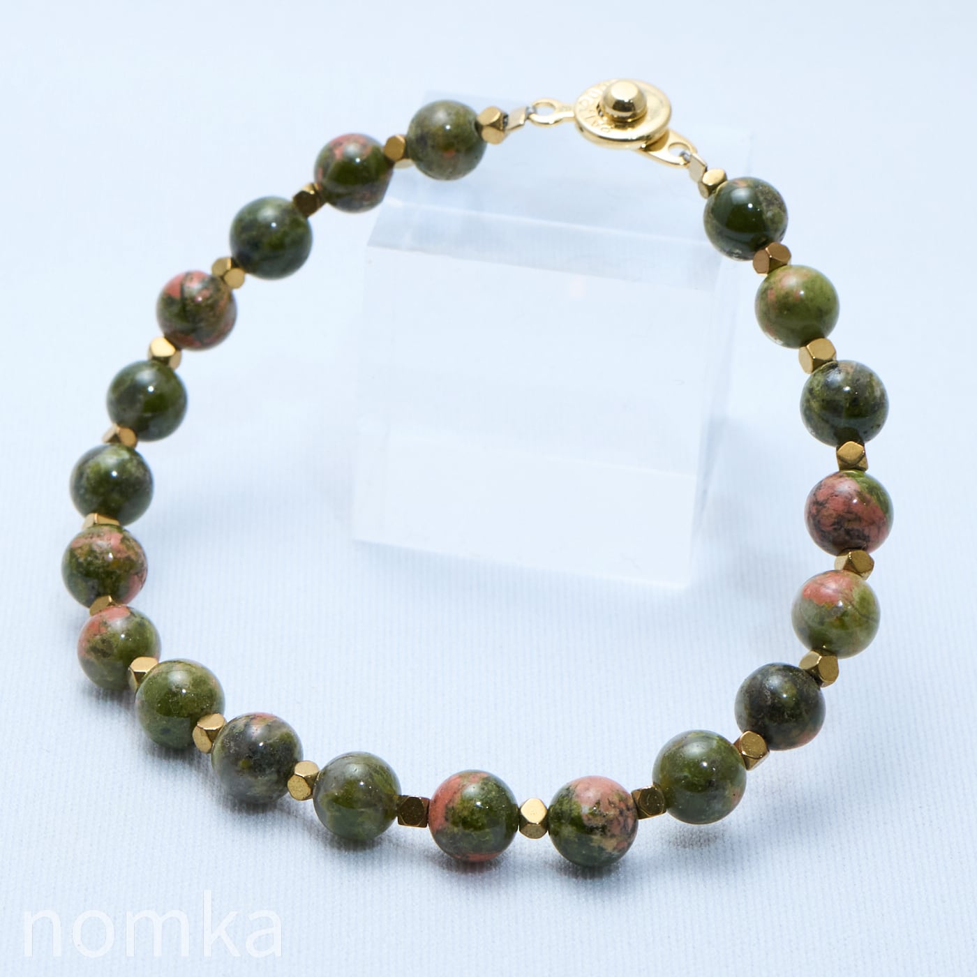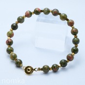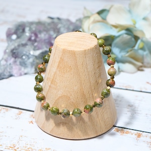 魅力的なユナカイトとゴールドカラーのヘマタイトを組み合わせたデザインワイヤーブレスレットです。このアイテムは、シンプルながらも持ち主の個性を引き立て、日常のファッションに自然に溶け込みます。どんなシーンでも活躍し、心の安定とポジティブなエネルギーをもたらすことでしょう!