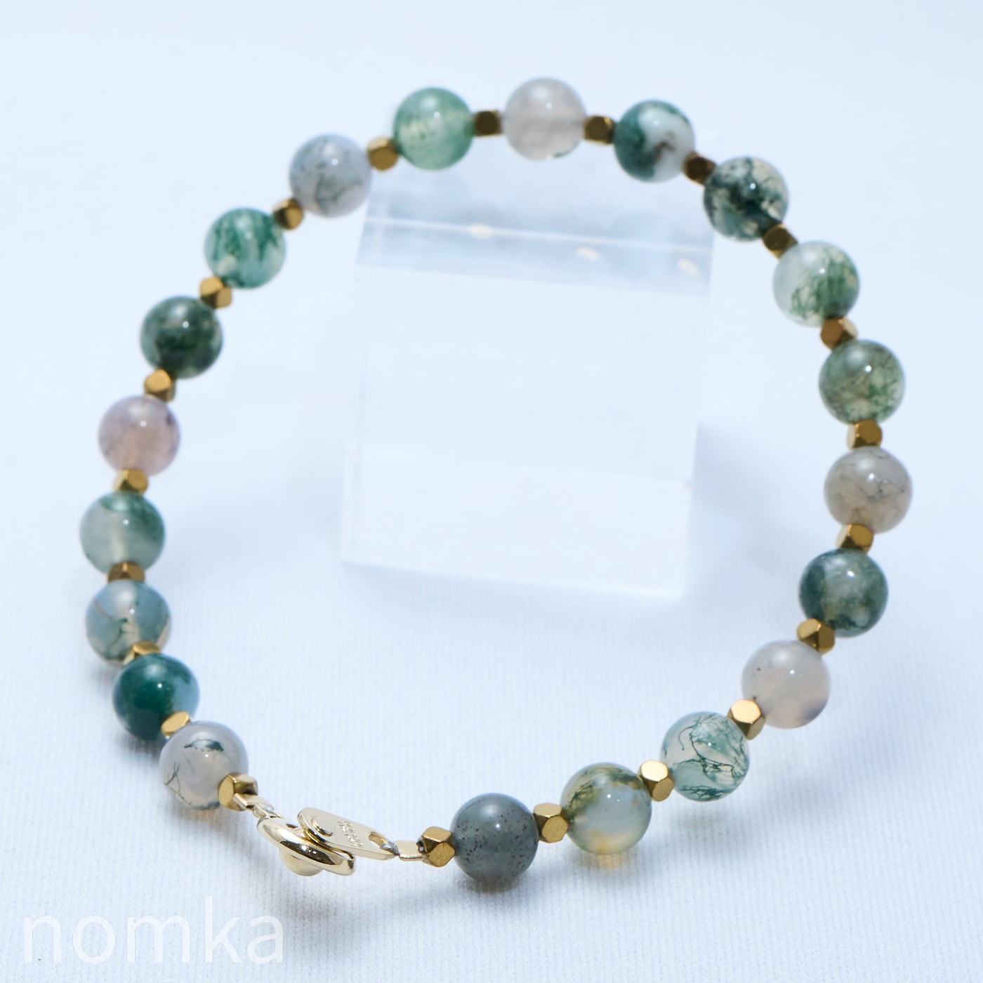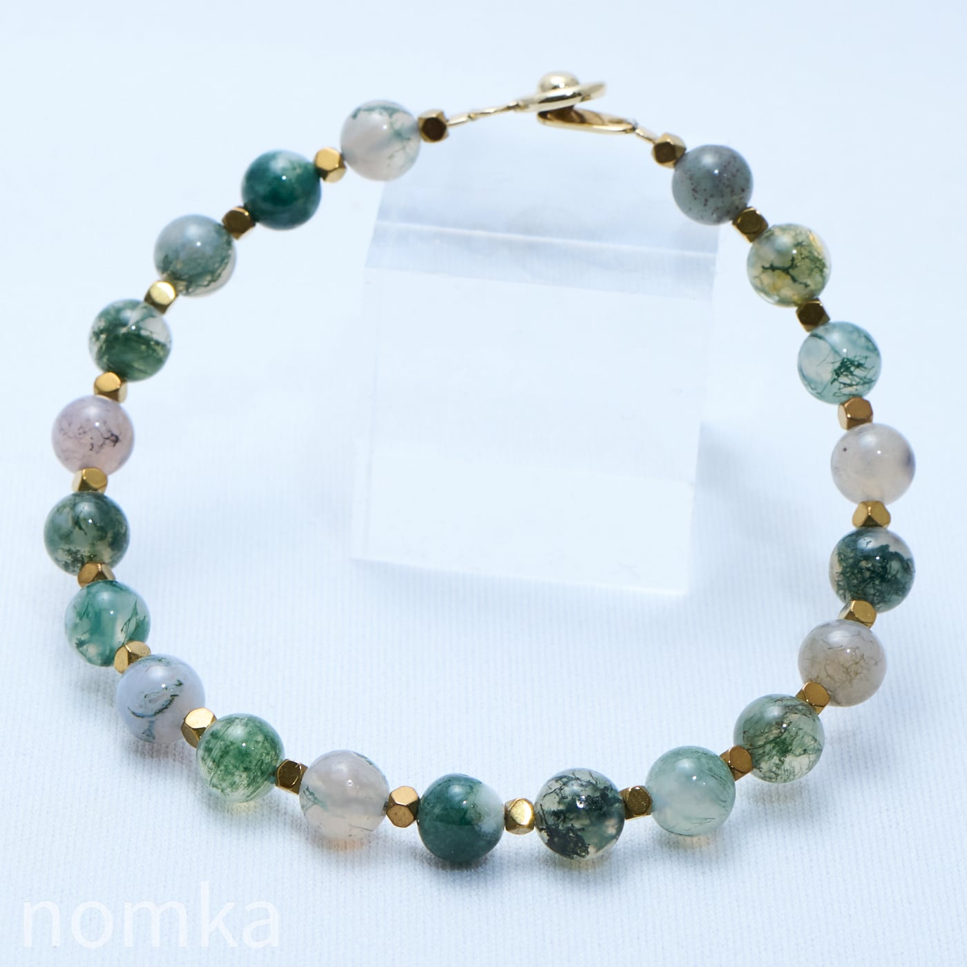 オーガニックグリーンのモスアゲートとゴールドカラーのヘマタイトを組み合わせた『自然と都会の調和』のようなモダンな雰囲気のワイヤーブレスレットです。このアイテムは、シンプルでありながらも持ち主の個性を引き立ます。現代社会のストレスの中で、自分のペースを崩さず着実に進んでいきたい方にオススメのブレスレットです。