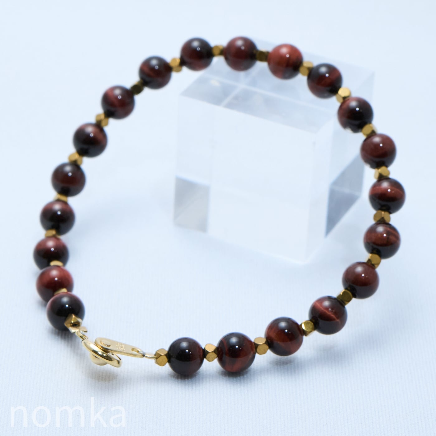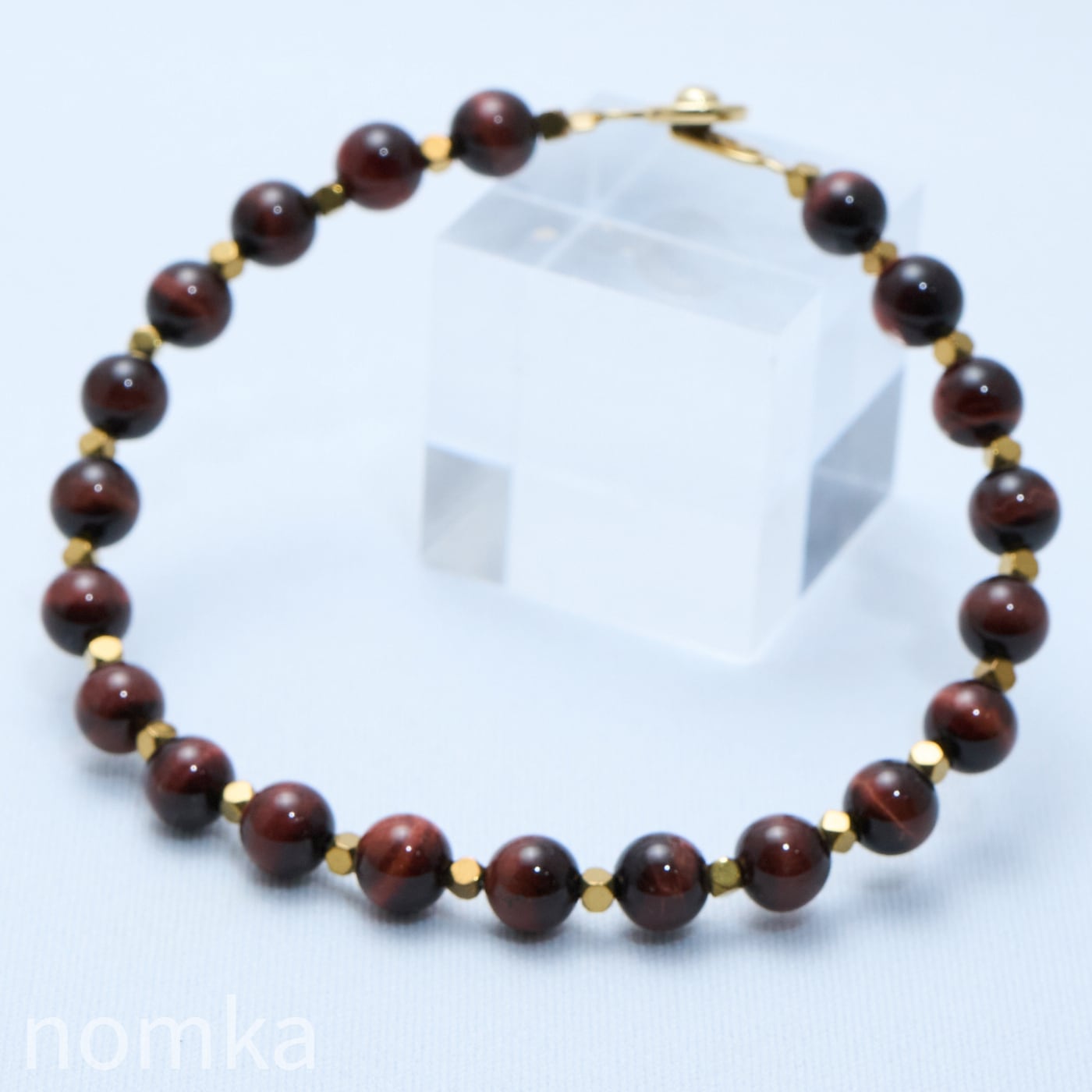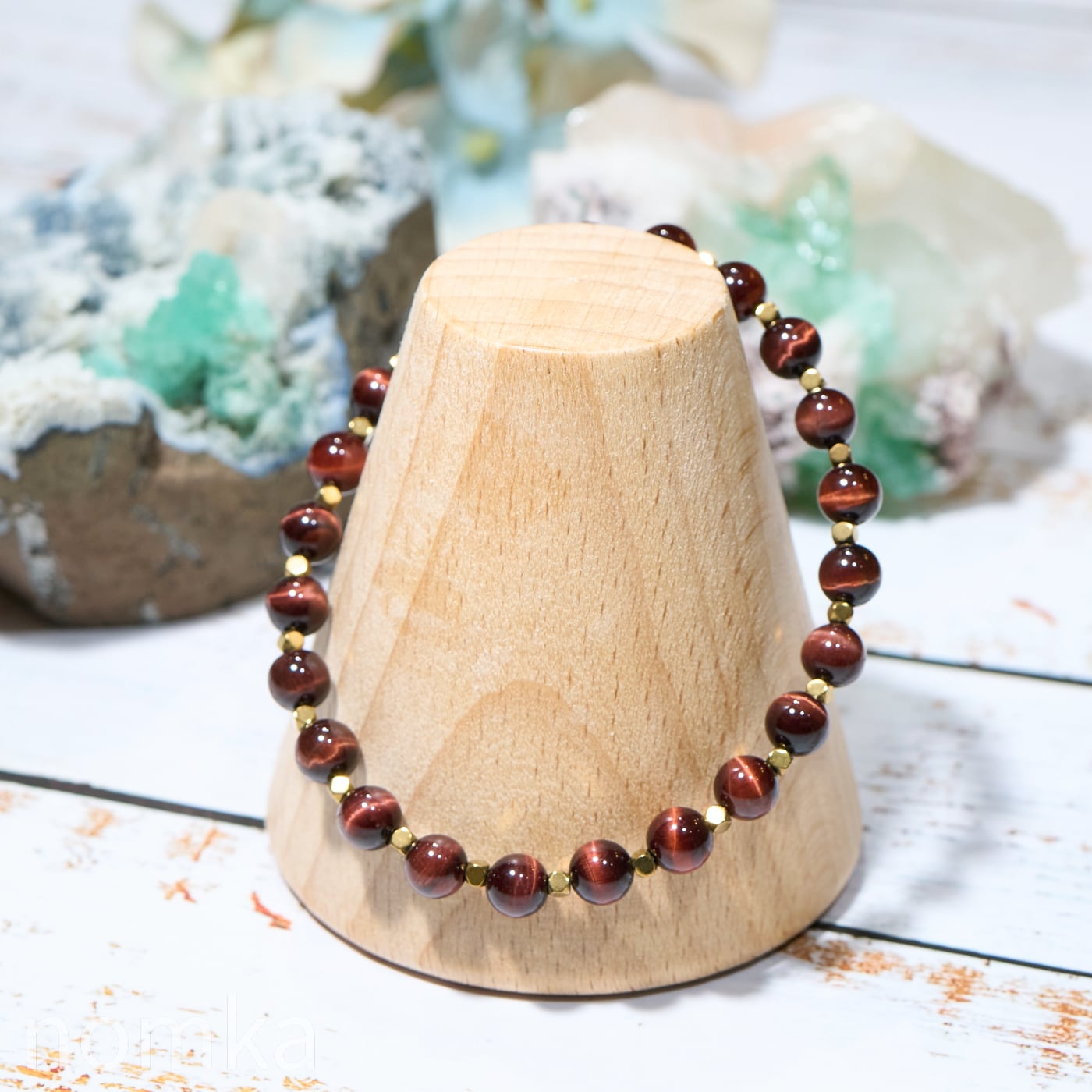 深みのある赤色の「レッドタイガーアイ」と、ゴールドカラーの「ヘマタイト」を組み合わせ華奢なデザインに、明日へ踏み出すエネルギーを詰め込みました。