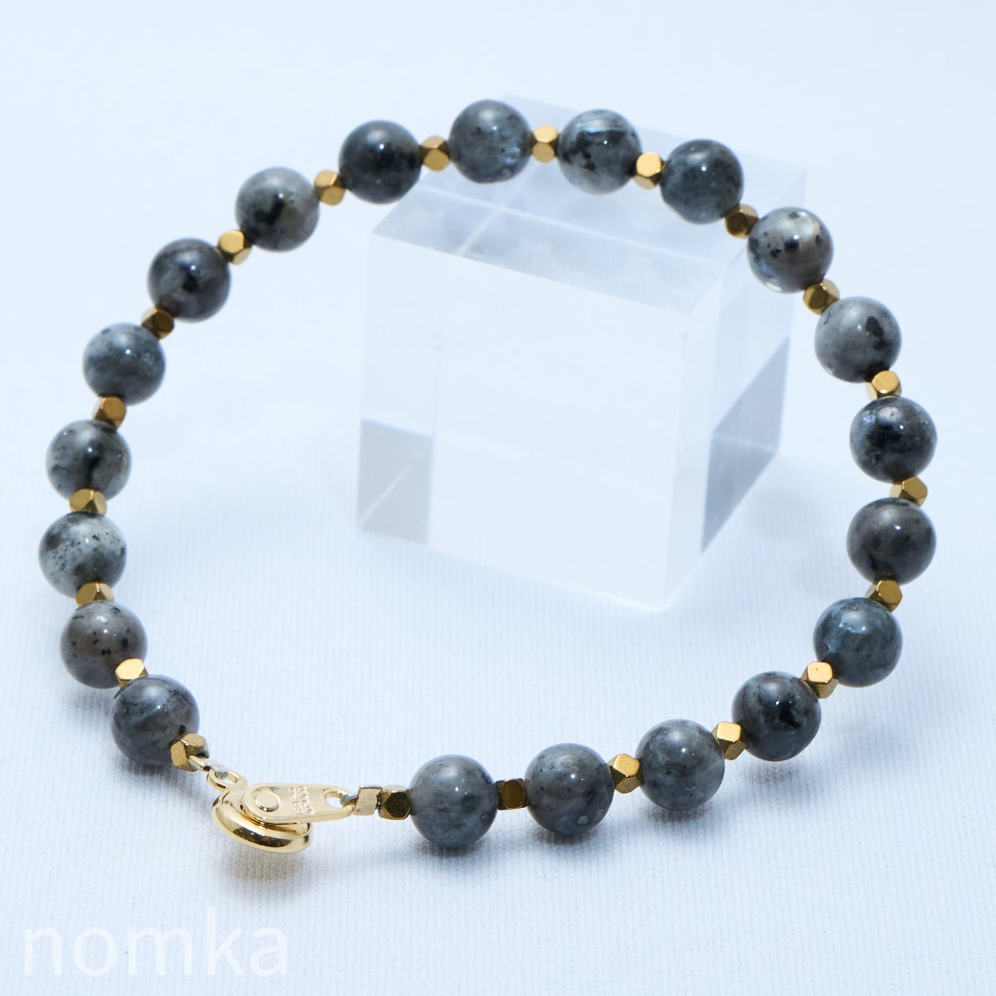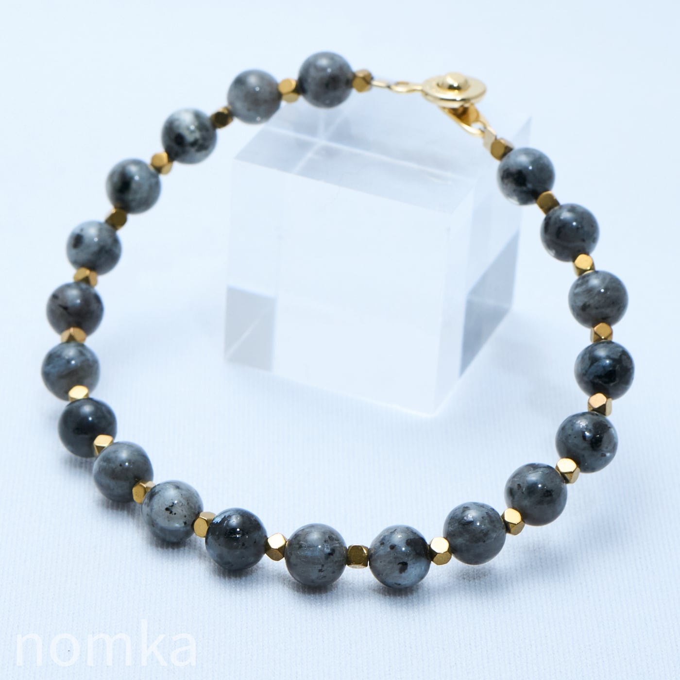 ラルビカイトのダークグレーにゴールドカラーのヘマタイトを組み合わせ、甘さを一切排除したマニッシュで格好いい印象のデザインブレスレットに仕上げました。