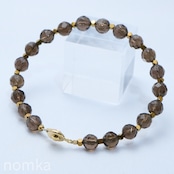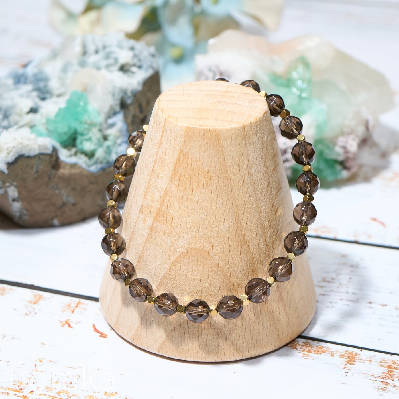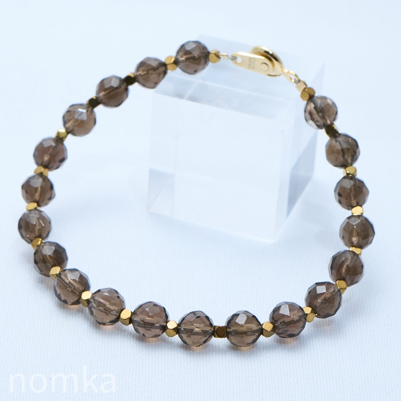カットされたのスモーキークォーツが放つ「面」の輝きと小さなゴールドカラーのヘマタイトが放つ「点」の輝きがアンティークジュエリーのような気品を漂わせるブレスレットです。透き通ったブラウンとゴールドカラーの組み合わせは肌なじみも良く、どんなファションにも合わせやすい万能カラーです。