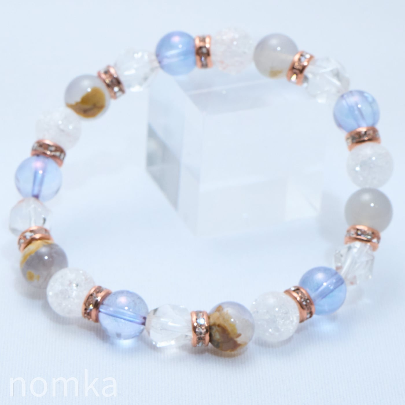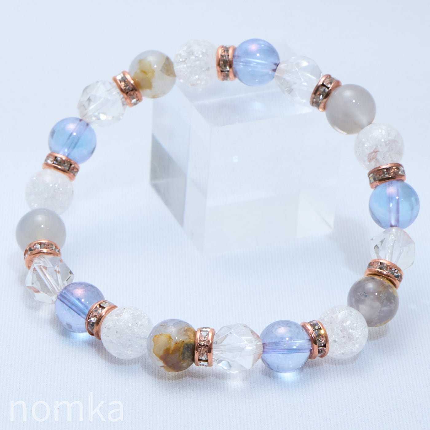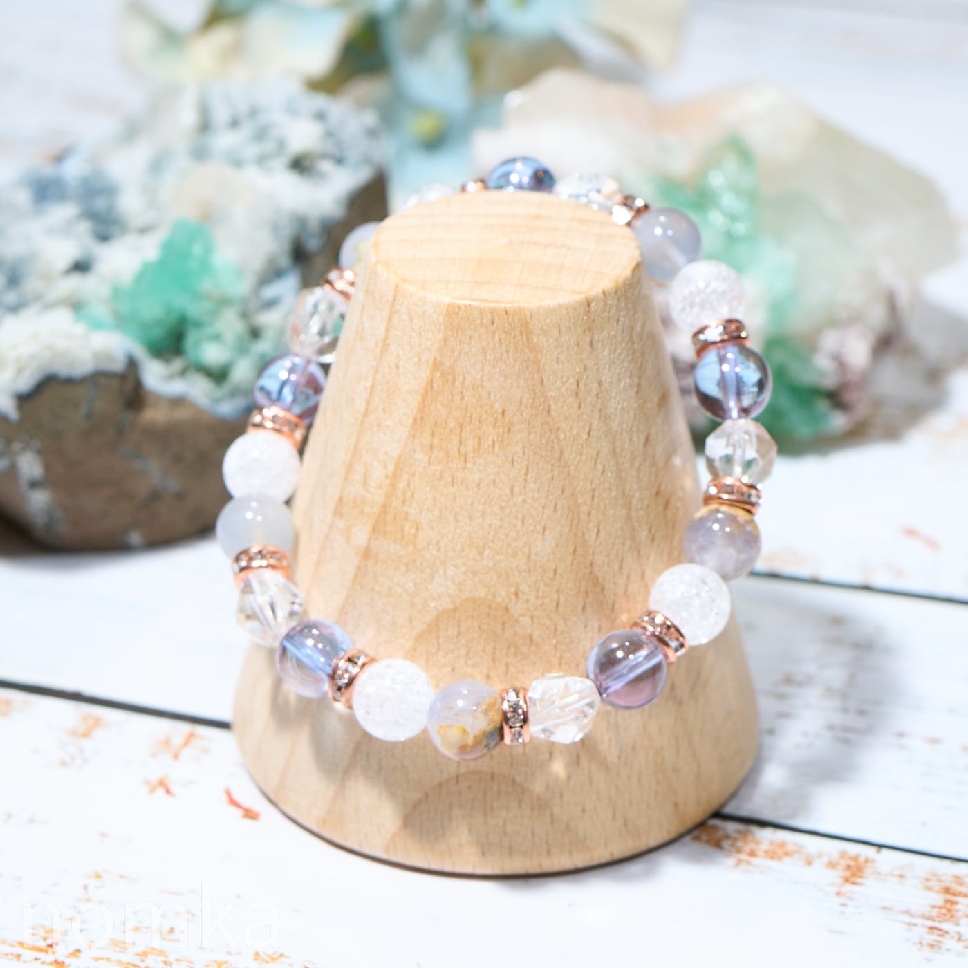 母岩付きの天然ブルーカルセドニーとコスモオーラの鮮やかな色合い、そしてクラック水晶のキラキラ感が絶妙に調和したデザインのゴムブレスレットです。ポイントにはピンクゴールドのロンデルをあしらい、上品さと華やかさを兼ね備えた一品に仕上げました。心をクリアにし、デトックス効果を求めるあなたにぴったりです。