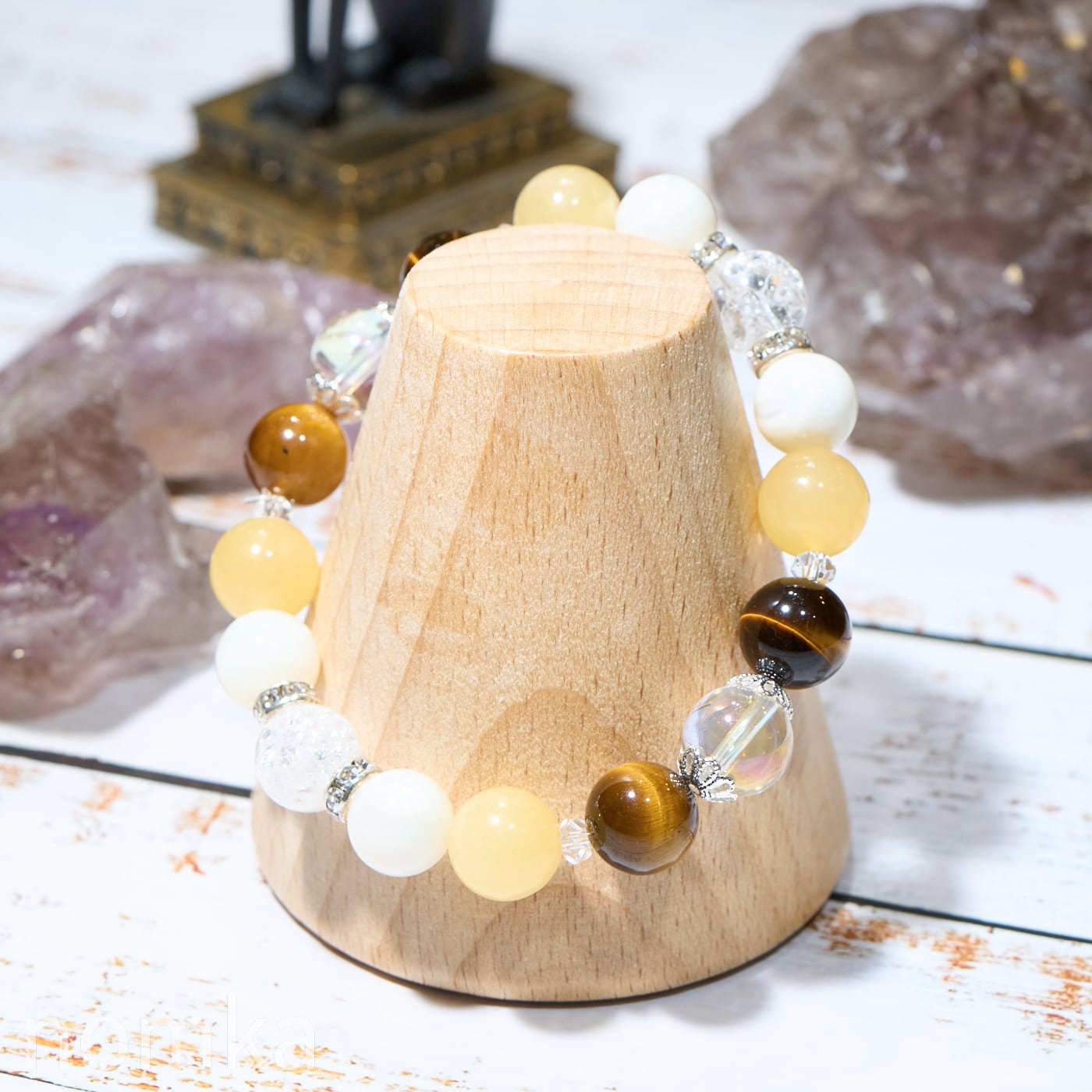 成功を象徴するタイガーアイと人脈を広げるアラゴナイトに優しさの象徴のマザーオブパールをプラスすることで、自信と大人の余裕も感じさせるデザインに仕上げました。