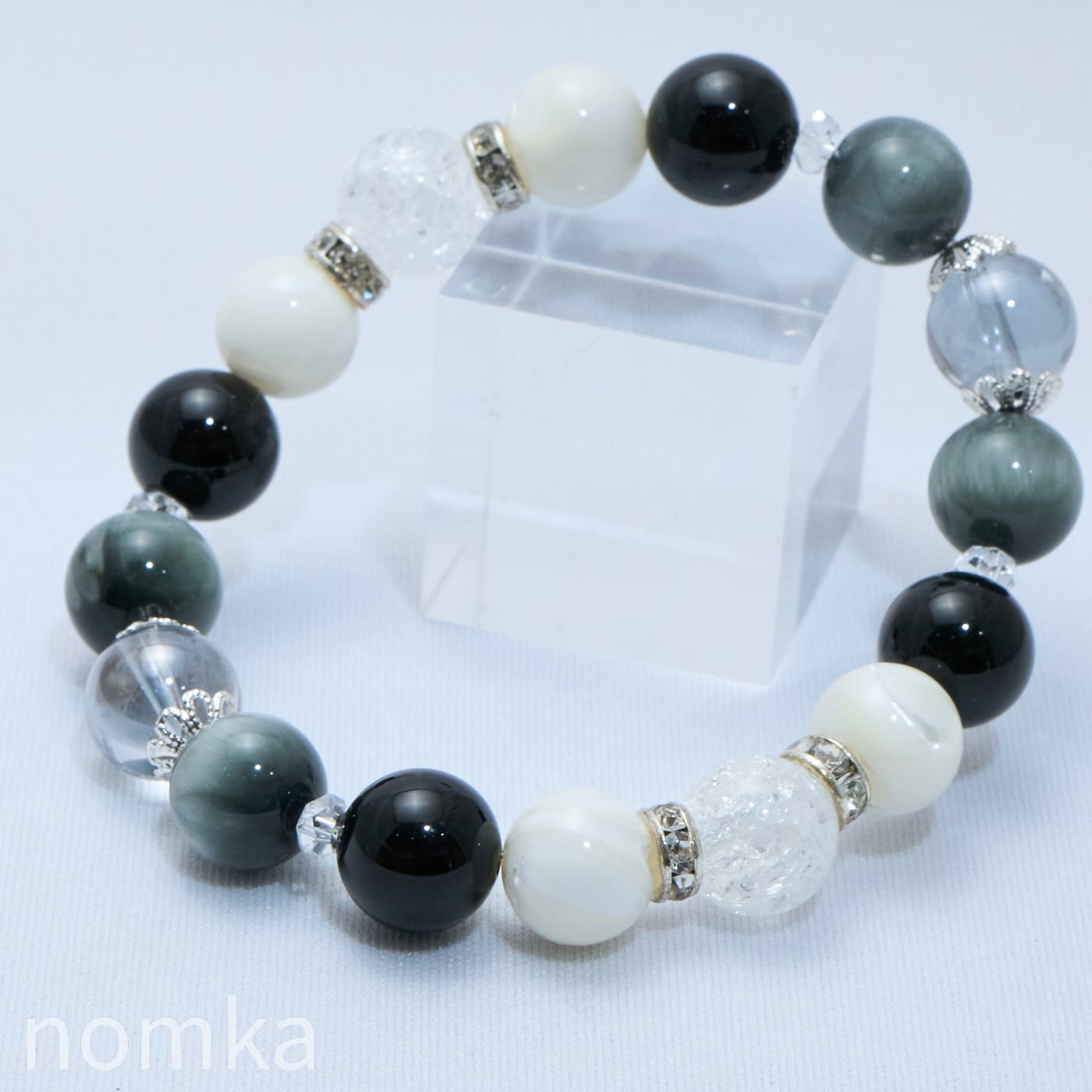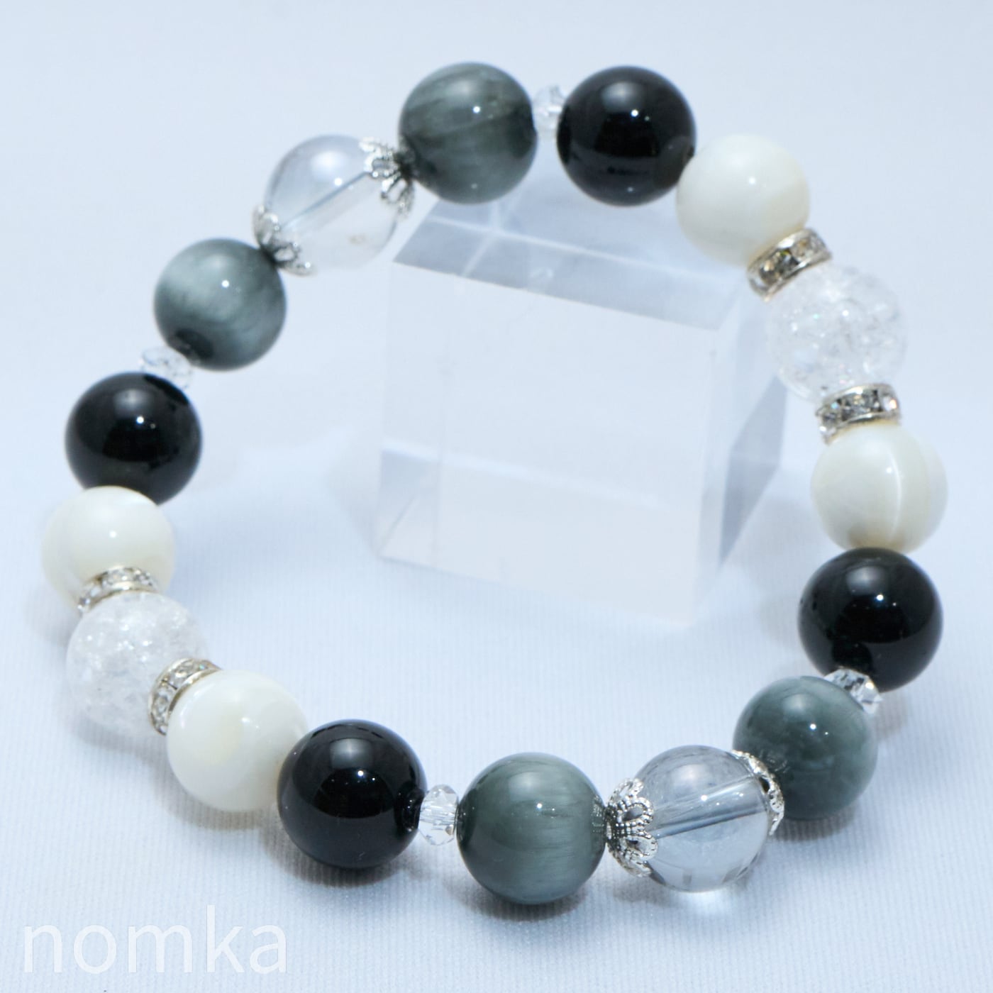 邪気を退ける「オニキス」と神の眼をもつ「イーグルアイ」力強いイメージの2つの天然石にマザーオブパールの優しさをプラスして凛とした強さの中にも女性らしさを兼ね備えたデザインに仕上げました。
