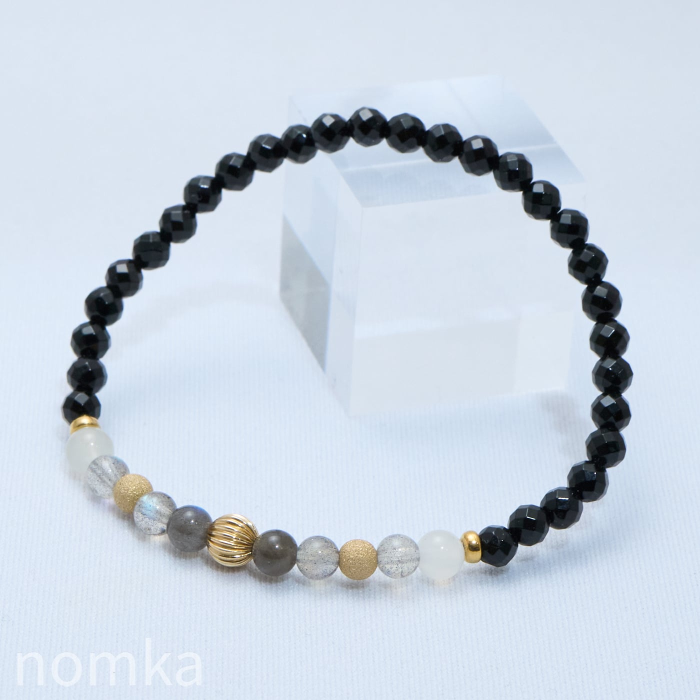 ラブラドライトとムーンストーンの透明感で抜け感を、その間に14kgfビーズを添えて本物のゴールドの輝きをプラスしました。4ミリという細身ながら手首を動かすたびに上品な存在感を放ちます。カジュアルからフォーマルまでどんな服装にも併せやすいブレスレットです。