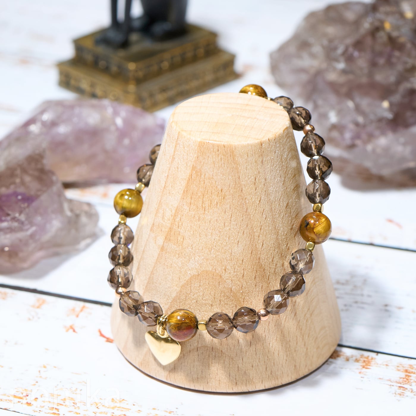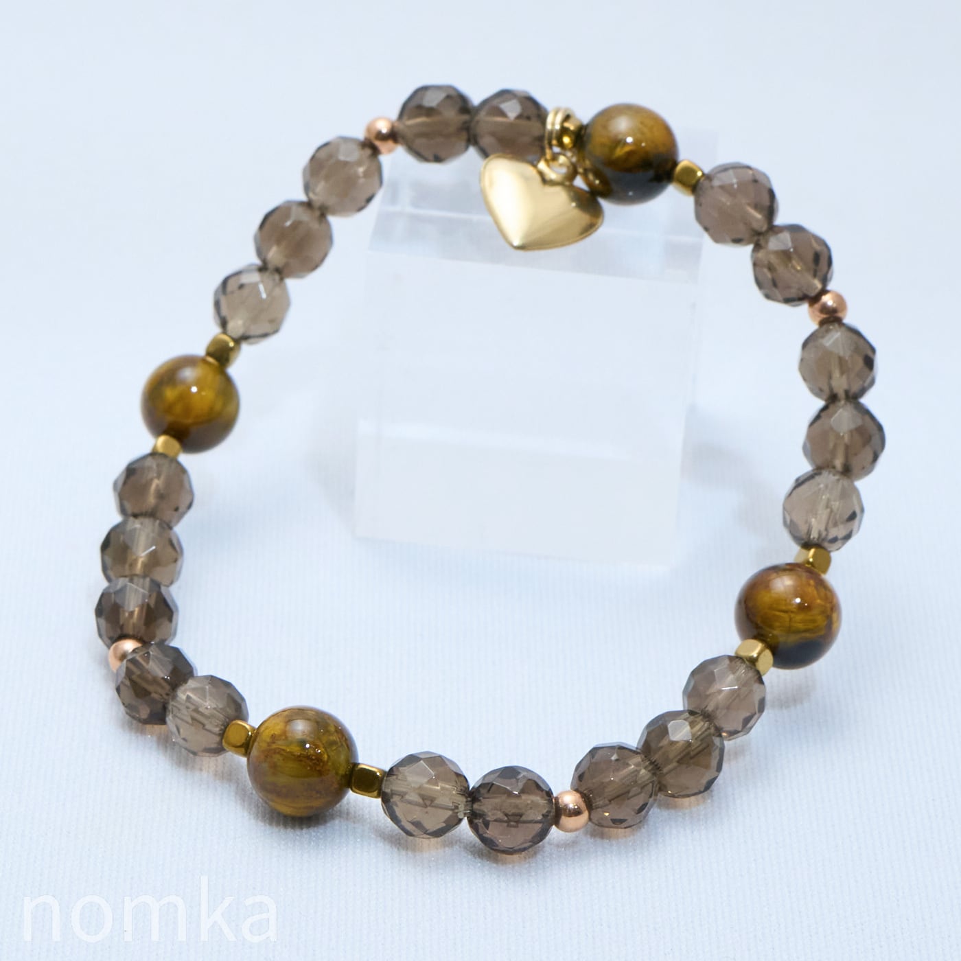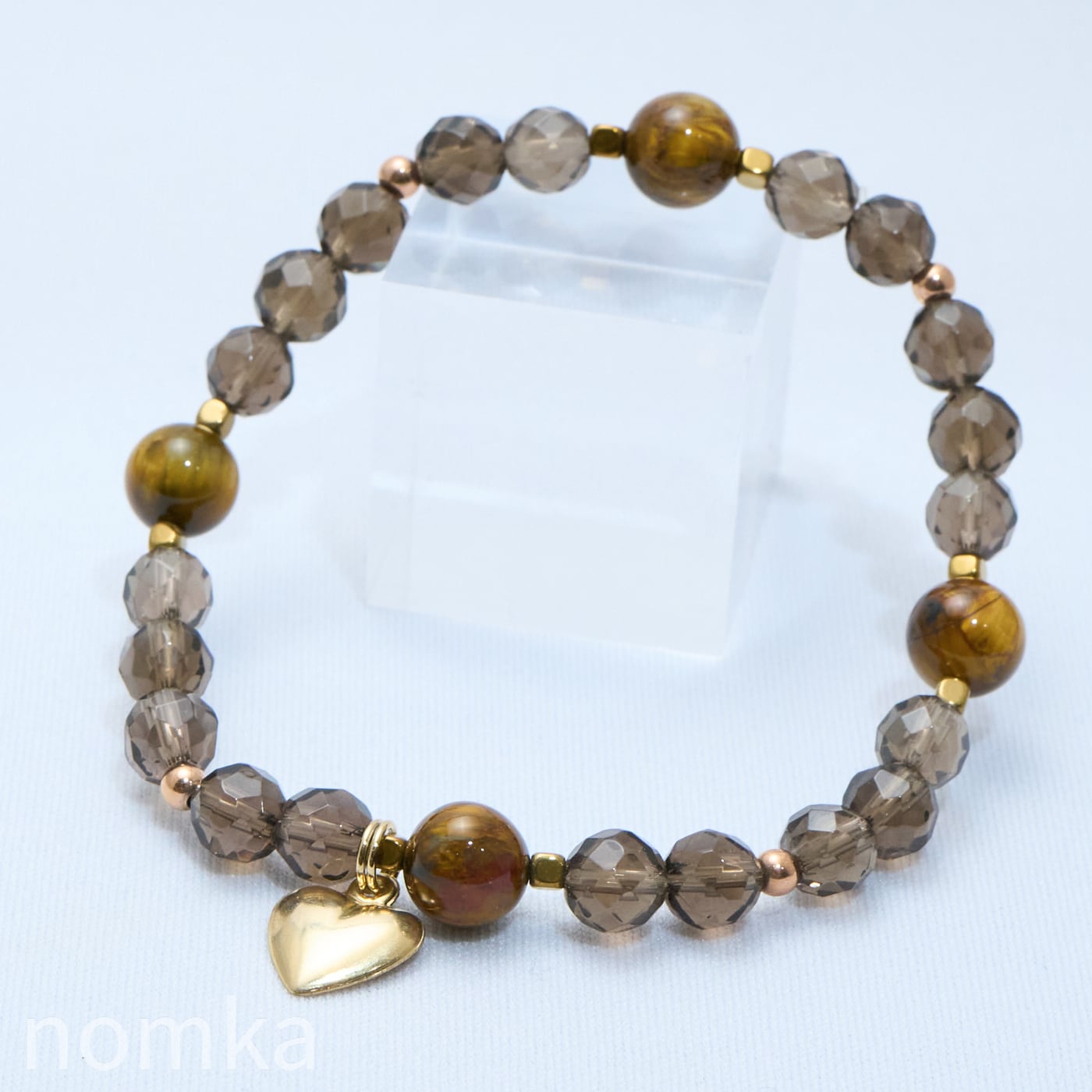 迷いを断ち切る『スモーキー・クォーツ』ち現状を打破する嵐の石『ピーターサイト』とパワフルな組み合わせのブレスレットですが、カットされキラキラと輝くブラウンの光に黄金色のマーブル、そしてヘマタイトのゴールドに14Kgfのハートチャームを配置し、クールな印象の中にも女性の華やかさをプラスしました。