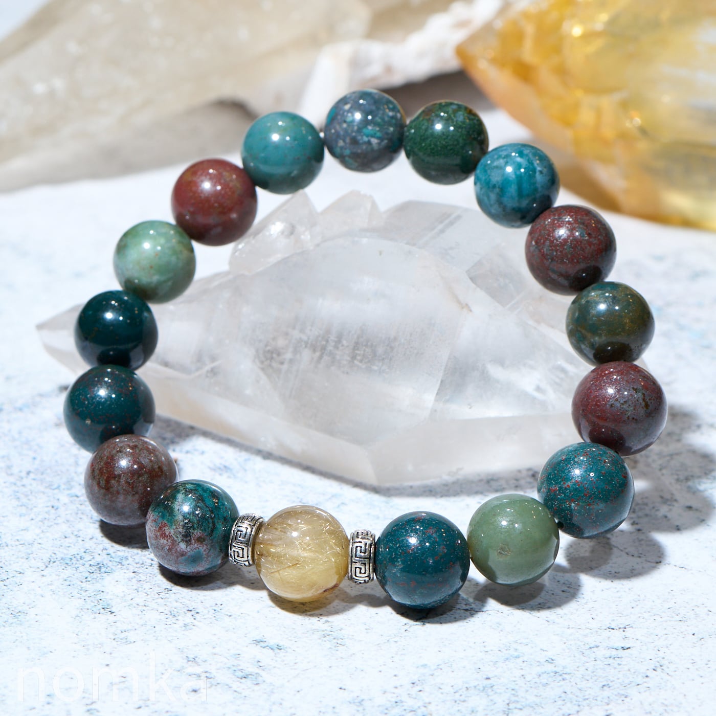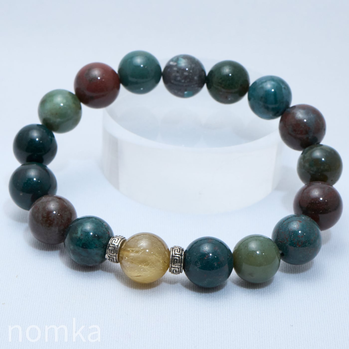 深い森のようなグリーンに情熱の赤が点在するブラッドストーン。その中心で燦然と輝くルチルクォーツは、暗闇を照らす希望と成功の光そのものです。