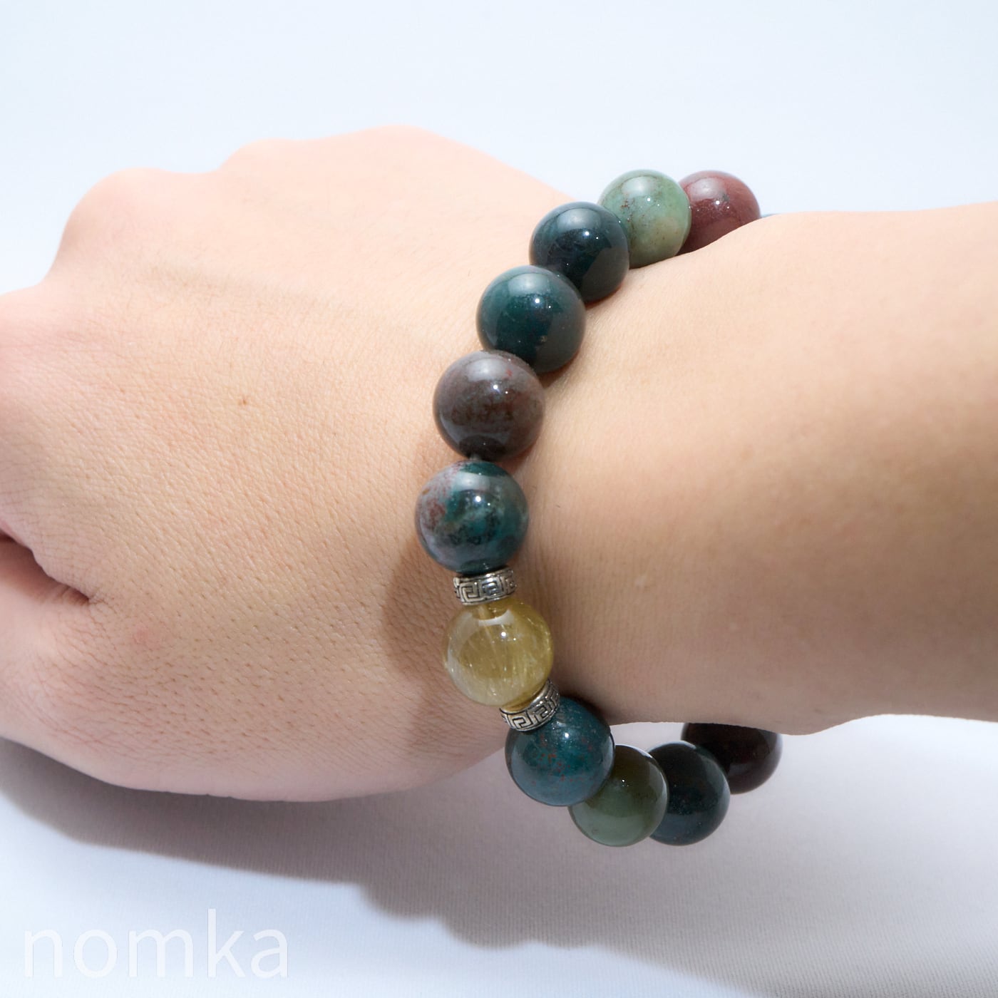 あえて光沢を抑えた「燻し銀」のシルバー925ロンデルで挟み込むことで、石の持つ野性味を引き出し、大人の渋みを感じさせるデザインに仕上げました。