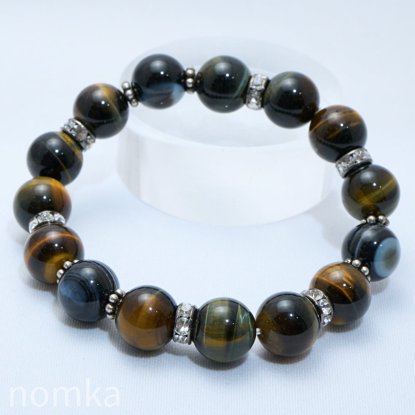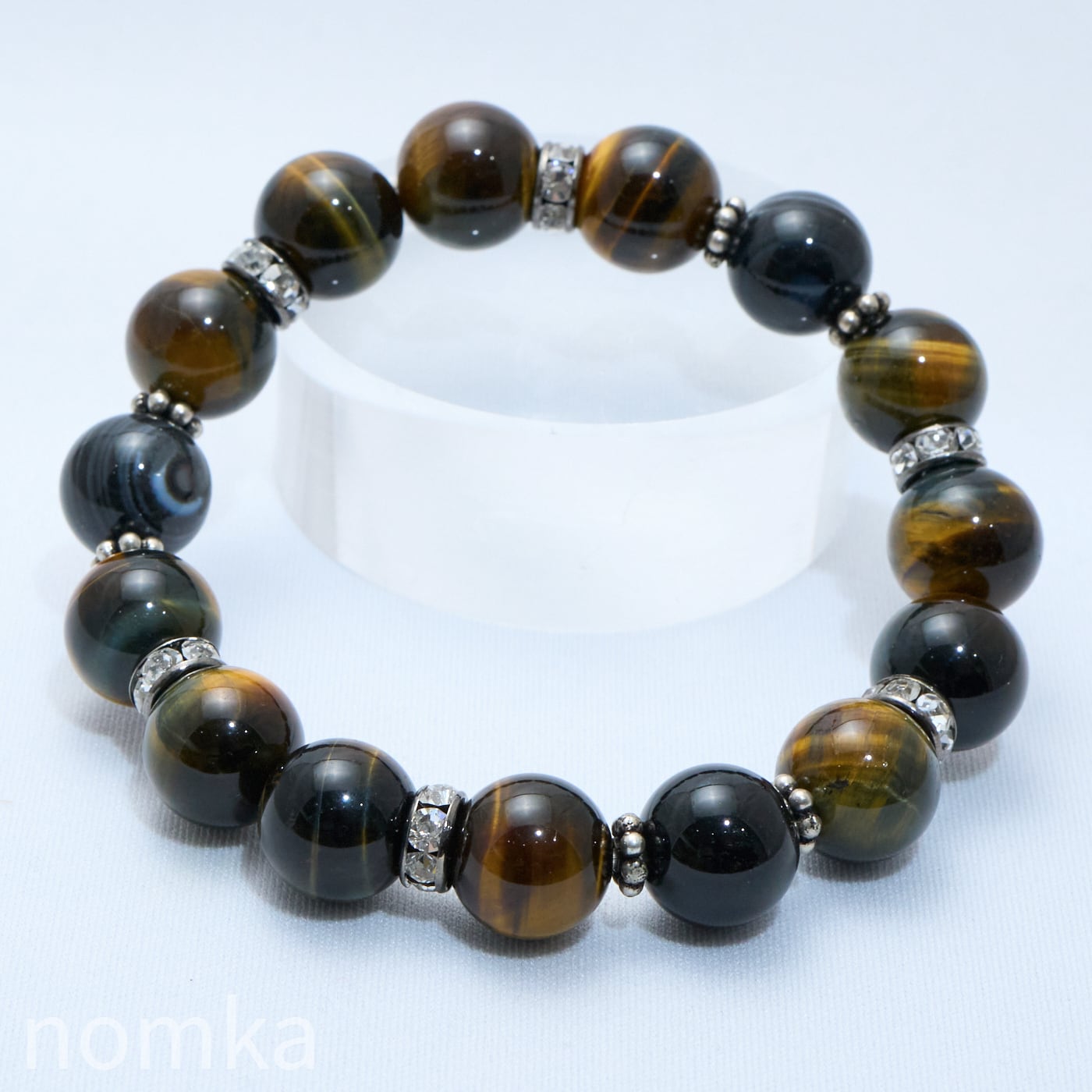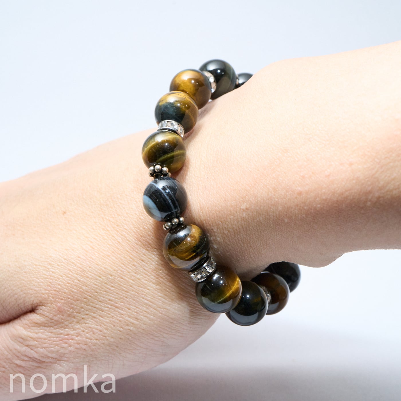12ミリと存在感のある華南タイガーアイをベースに、邪気を退ける『神の眼』の天眼石をトライアングル配置した、鉄壁の守護ブレスレットです。