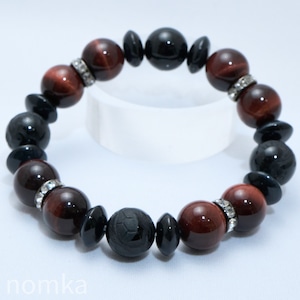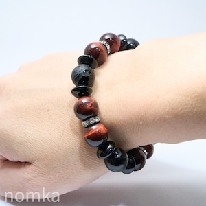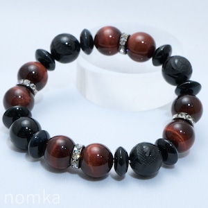 【迷いを消しさりチャンスを掴む】オニキス四聖獣彫刻×レッドタイガーアイ デザインゴムブレスレット(約18cm) naw25-0036