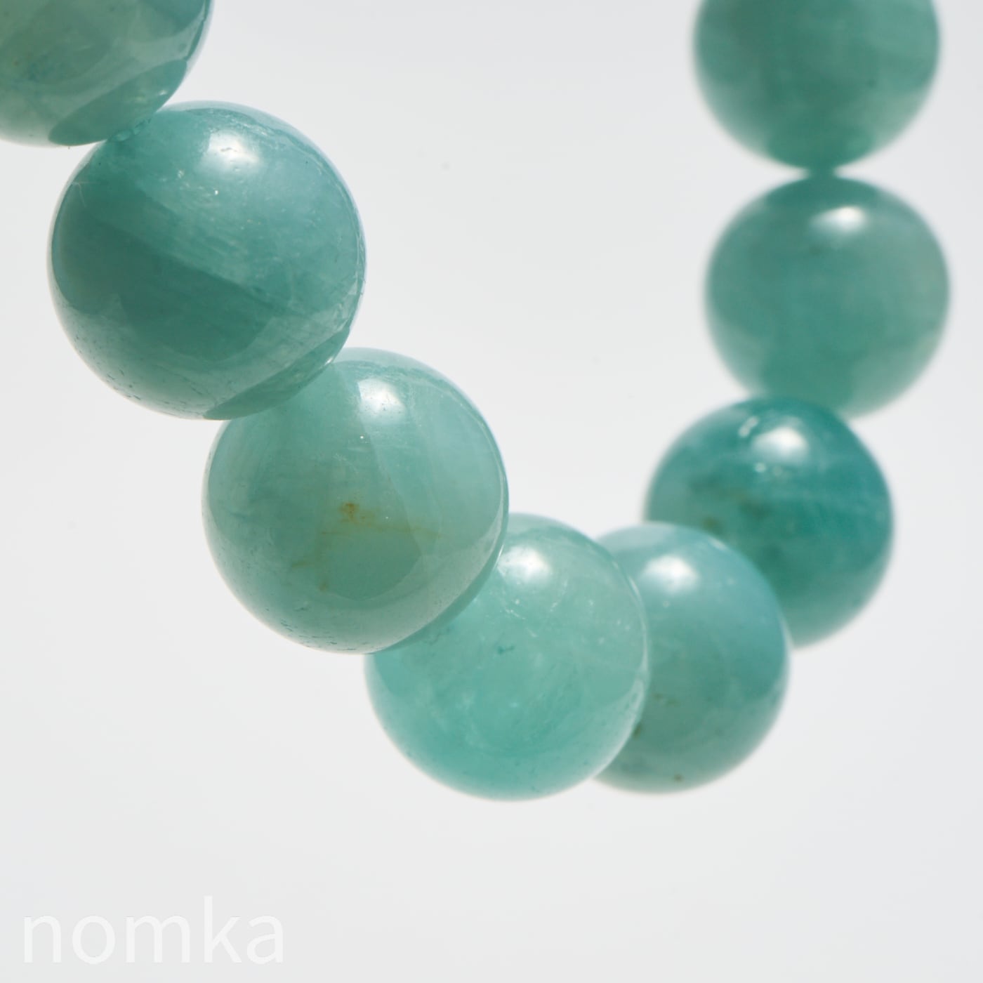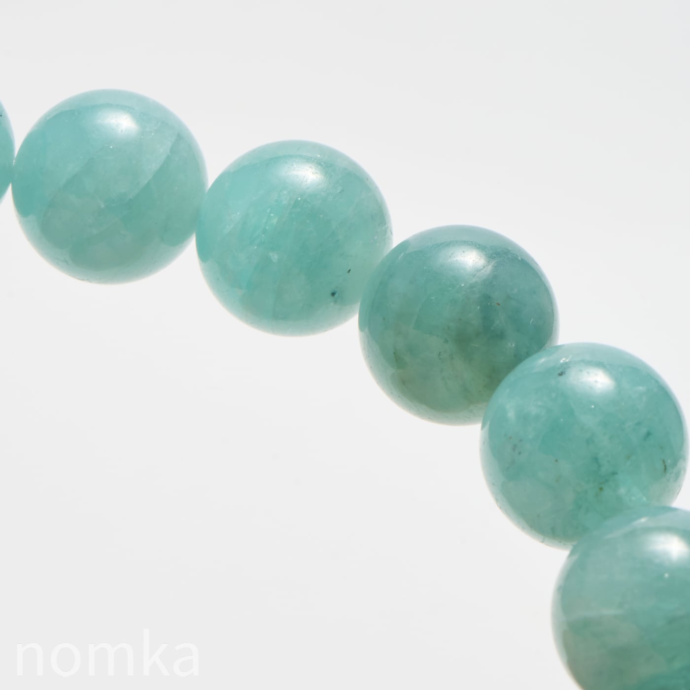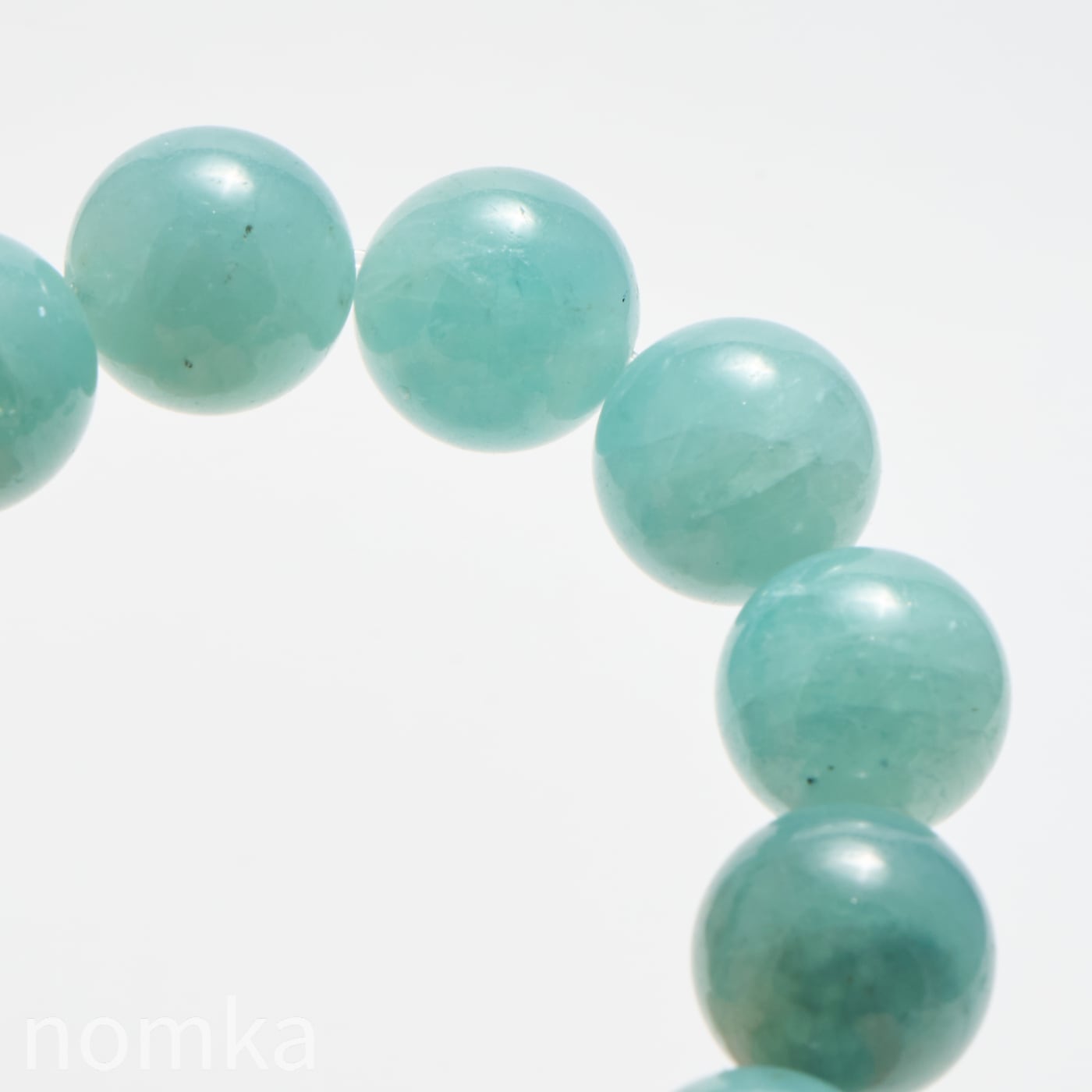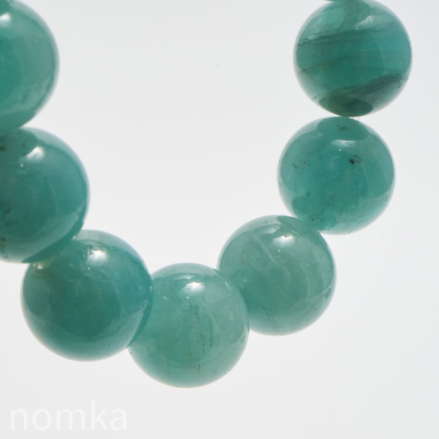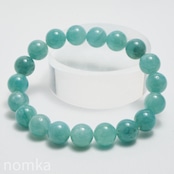 10mmという大粒の中に広がる、淡いブルーグリーンの濃淡はまるで、清い森のにある湖を覗き込んでいるような神秘的な色合いです。磨き上げられたルースにはない、天然石独特の魅力と力強さが宿った一連ブレスレットです。