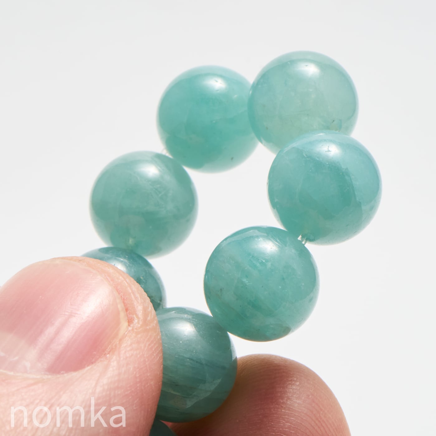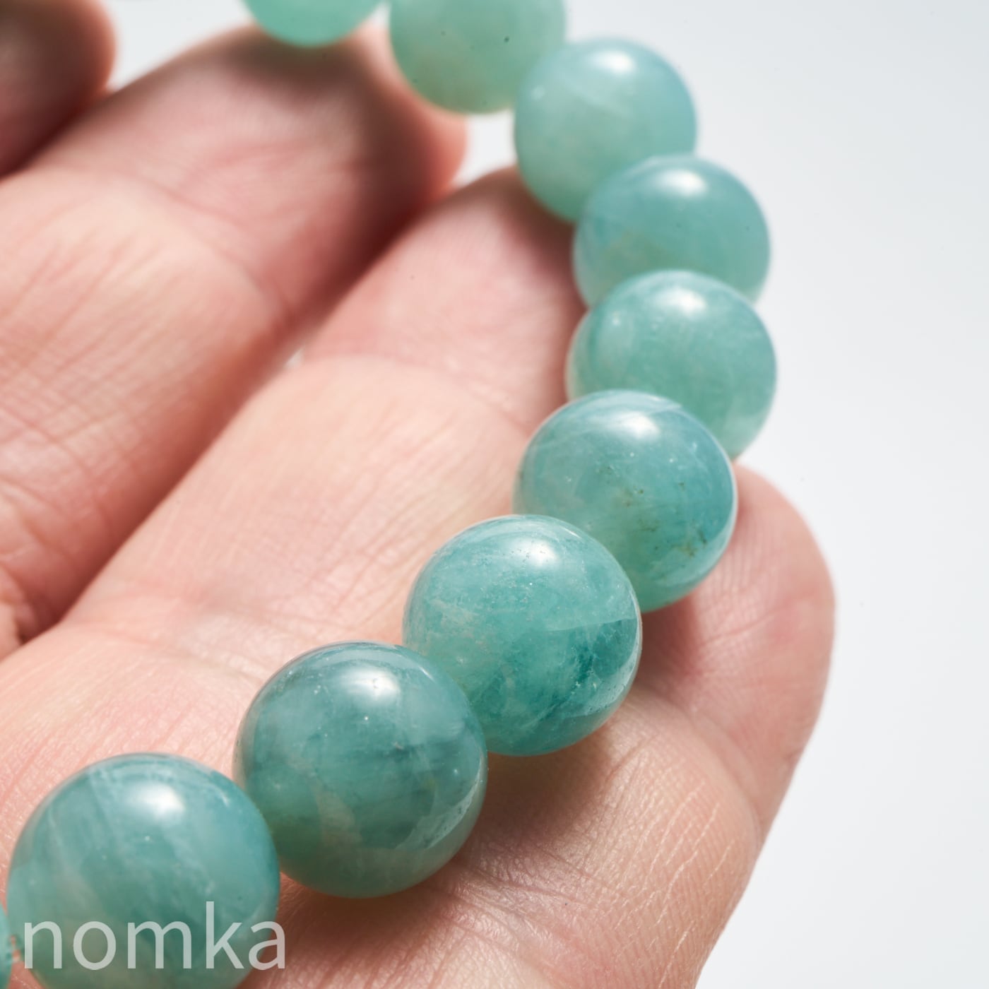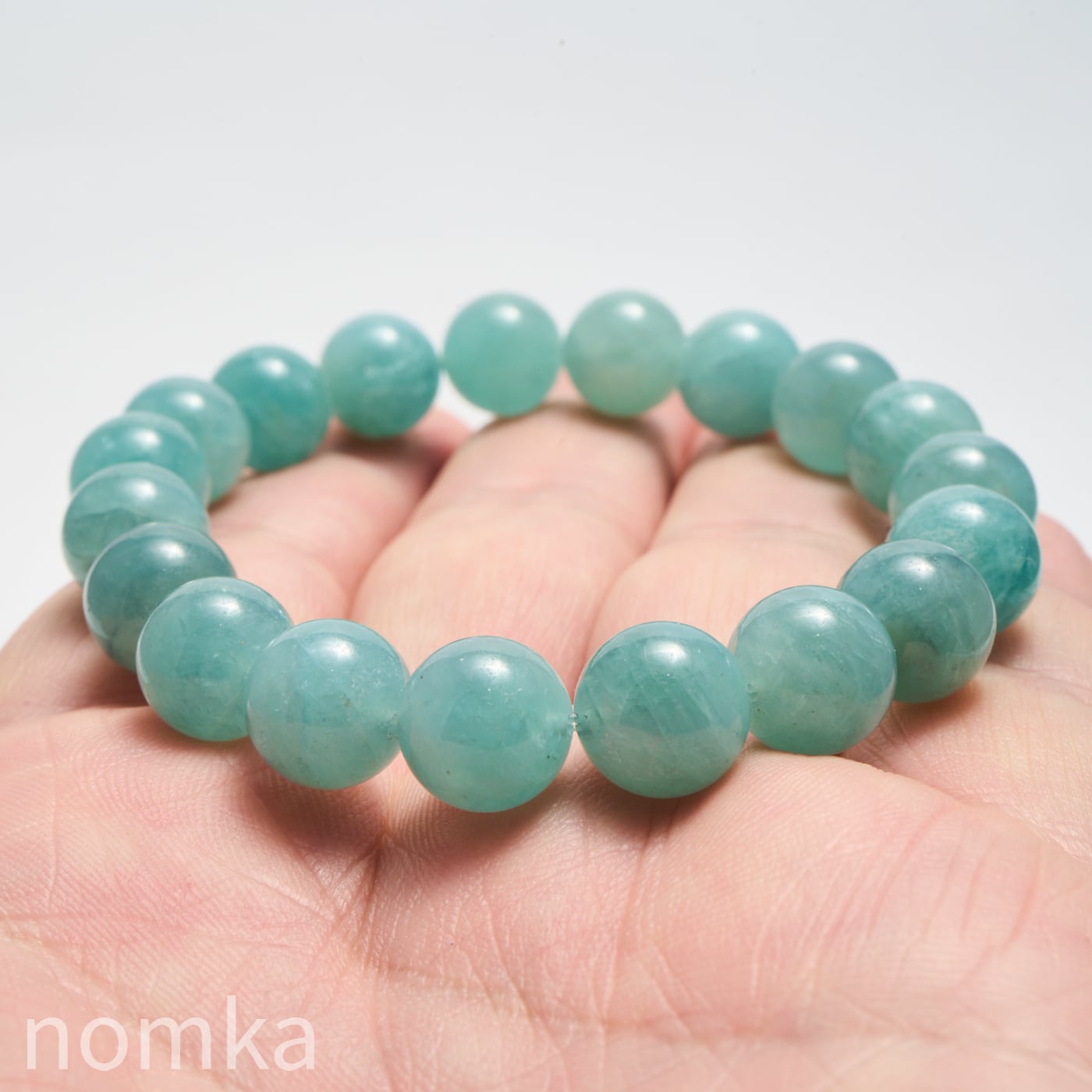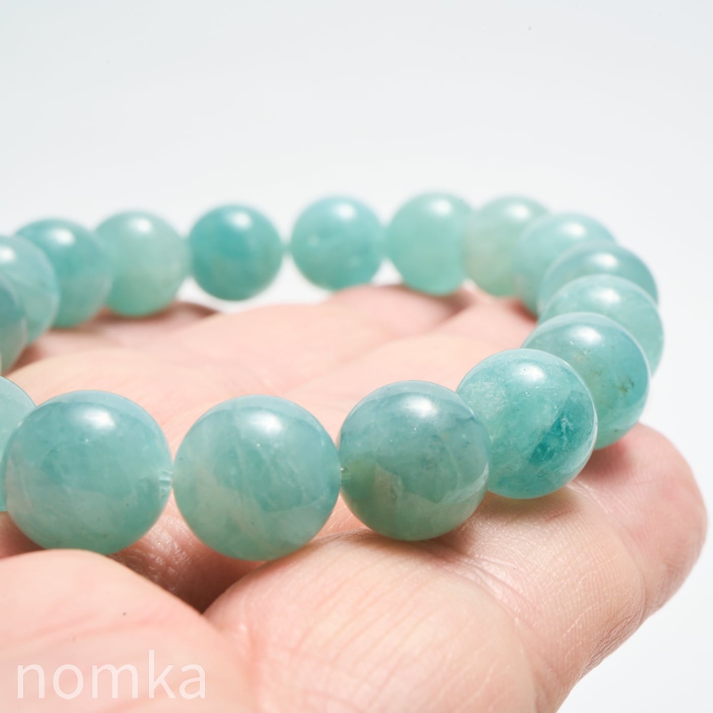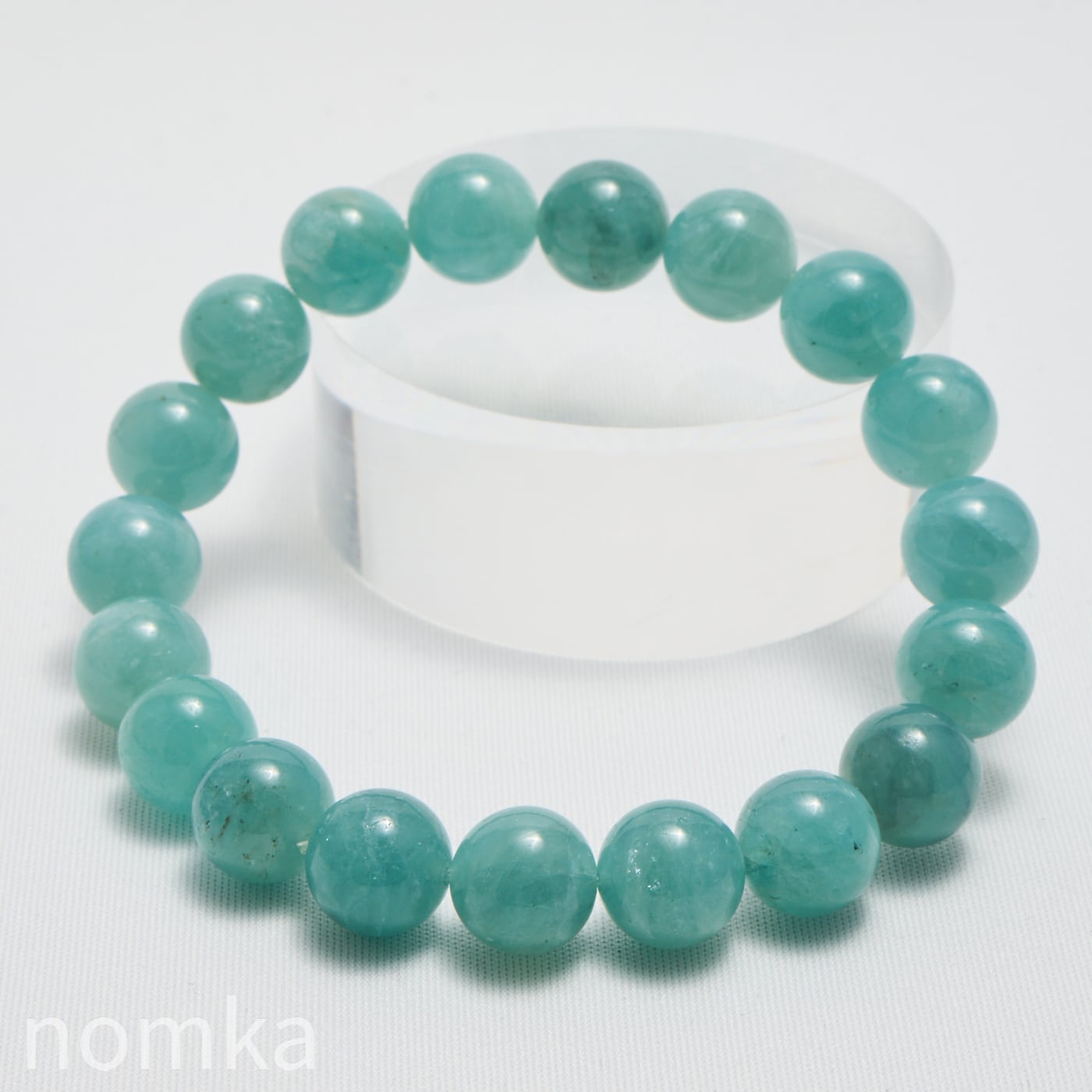 10mmという大粒の中に広がる、淡いブルーグリーンの濃淡はまるで、清い森のにある湖を覗き込んでいるような神秘的な色合いです。磨き上げられたルースにはない、天然石独特の魅力と力強さが宿った一連ブレスレットです。