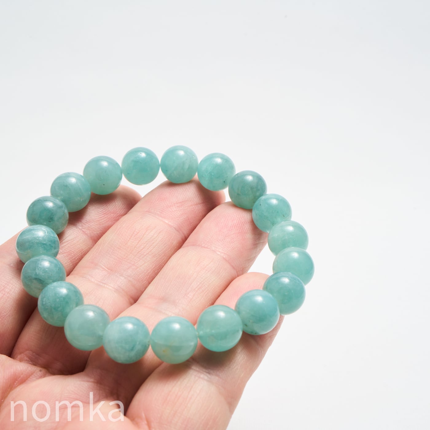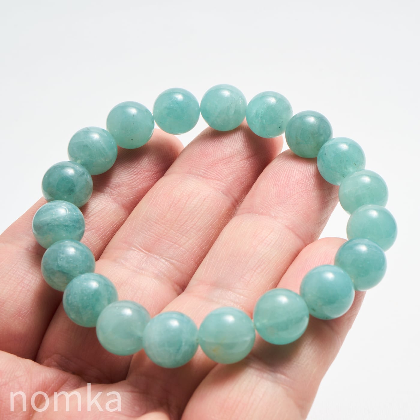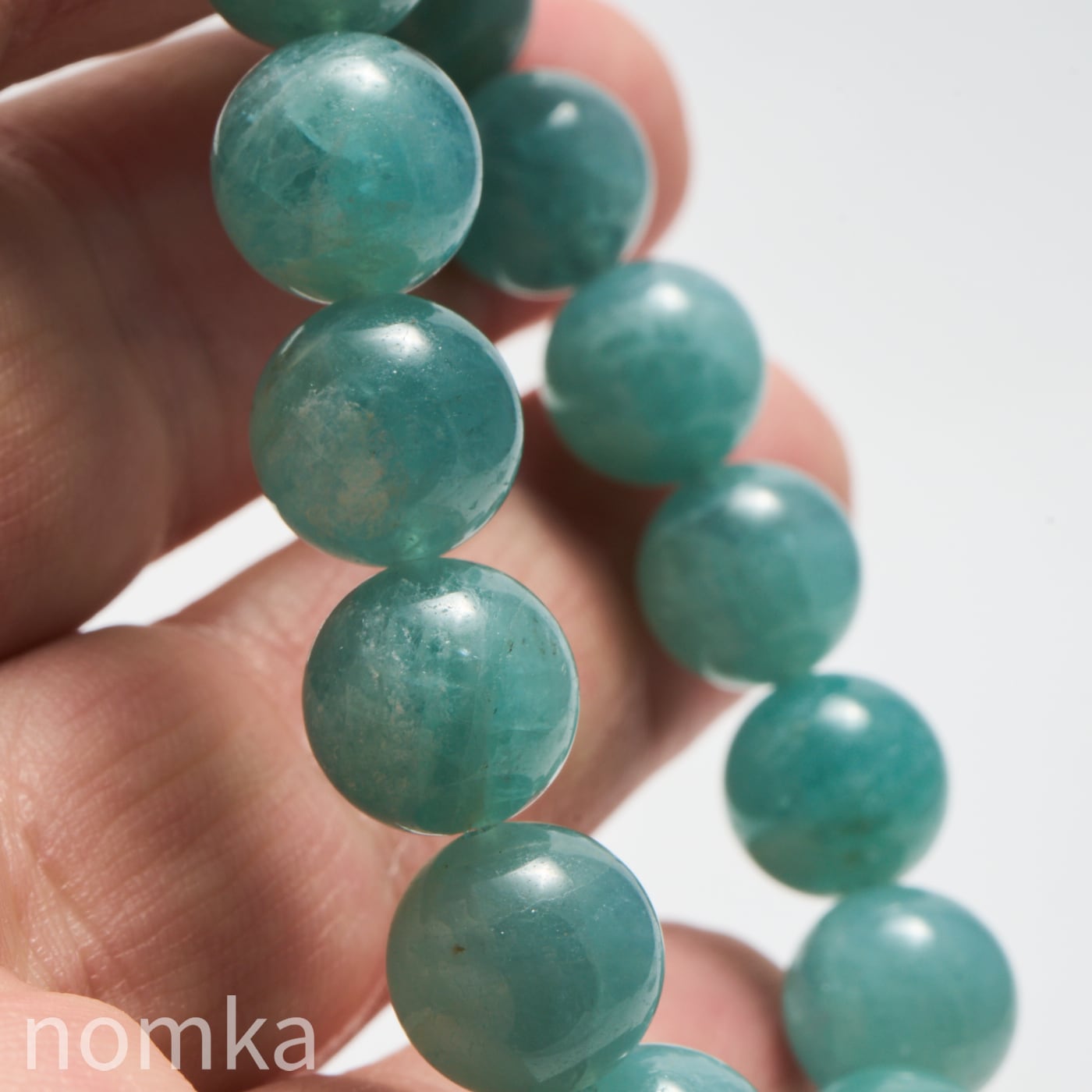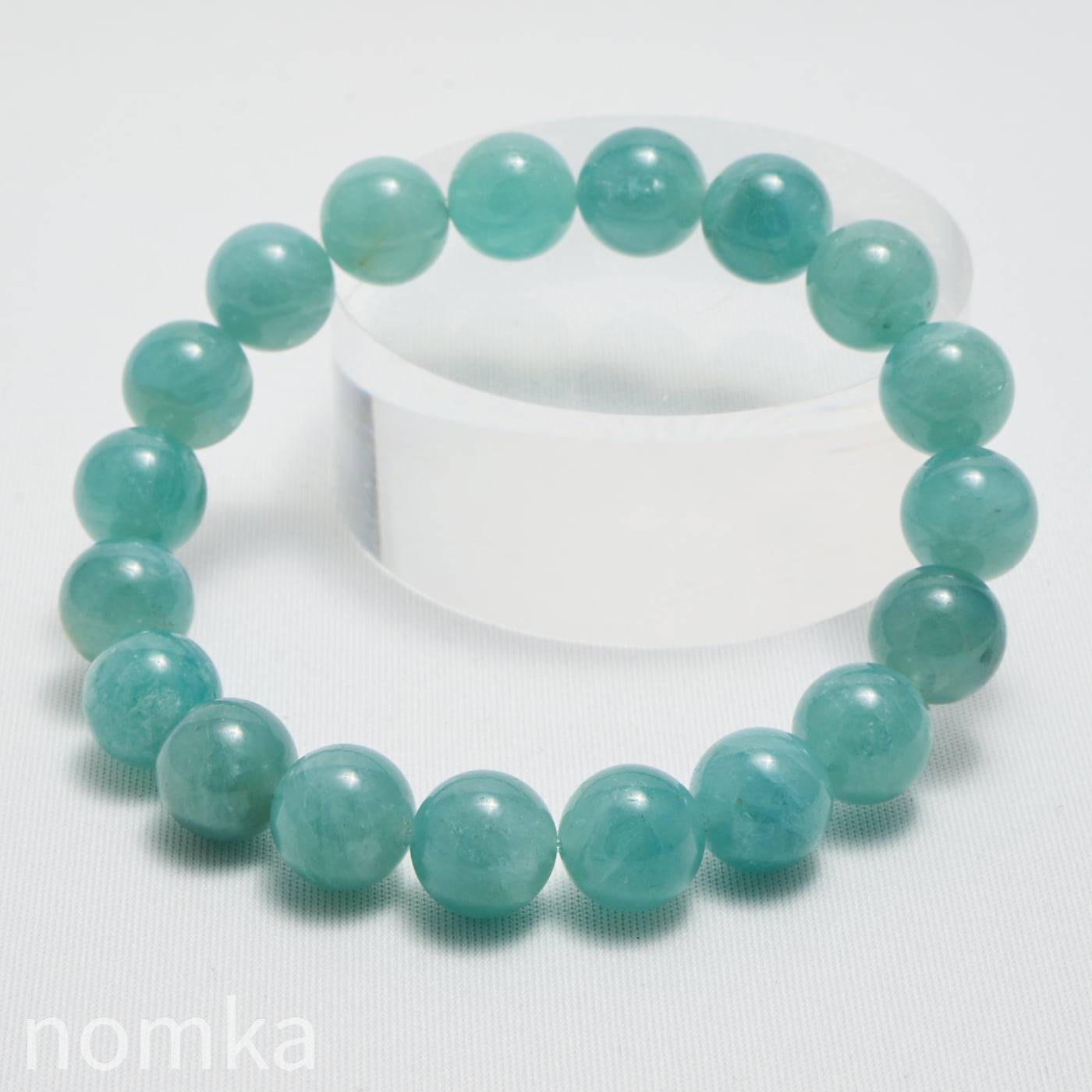 10mmという大粒の中に広がる、淡いブルーグリーンの濃淡はまるで、清い森のにある湖を覗き込んでいるような神秘的な色合いです。磨き上げられたルースにはない、天然石独特の魅力と力強さが宿った一連ブレスレットです。