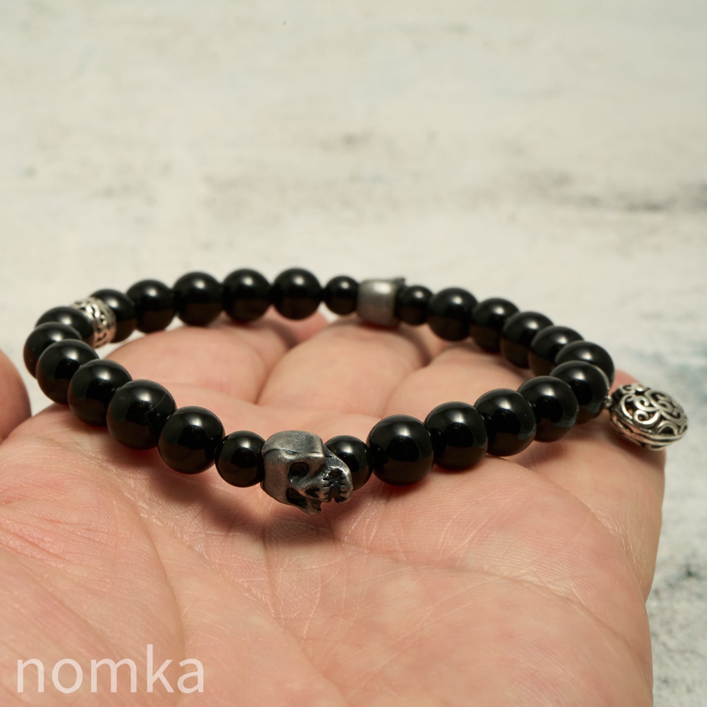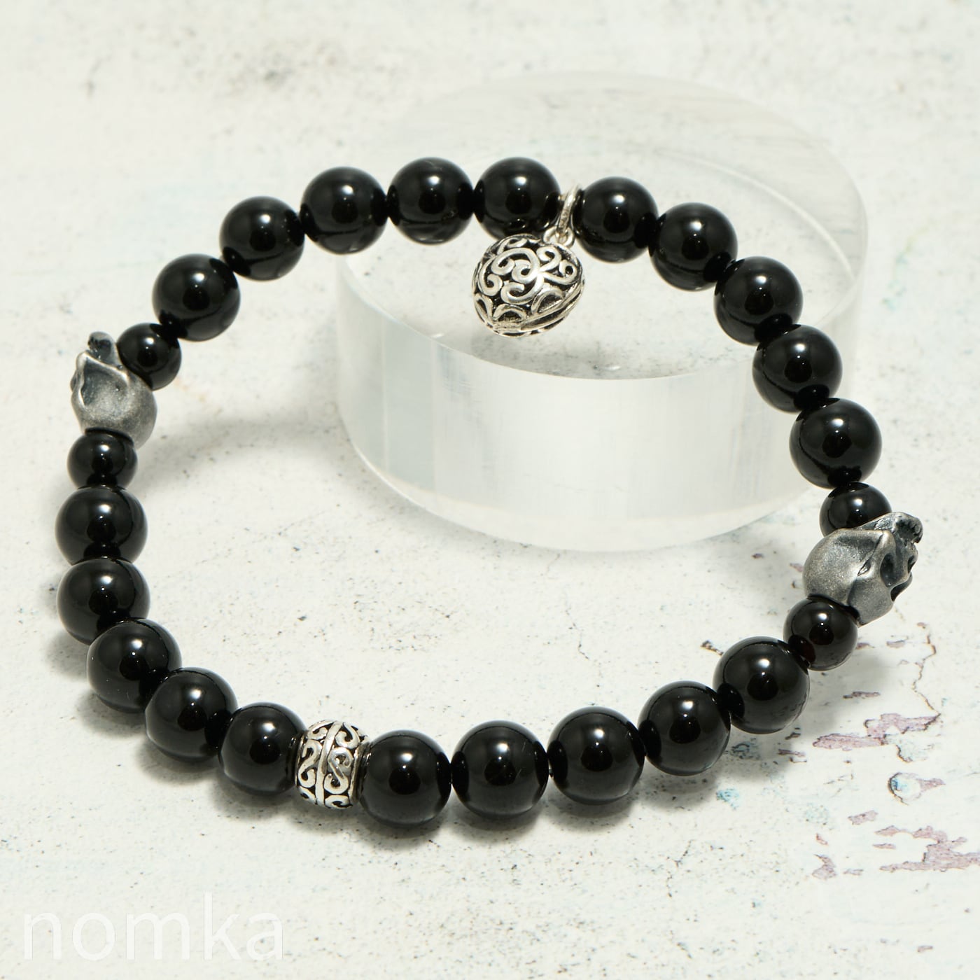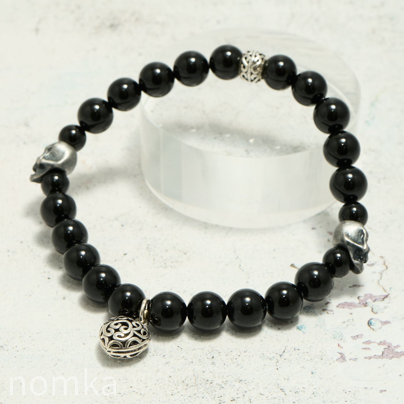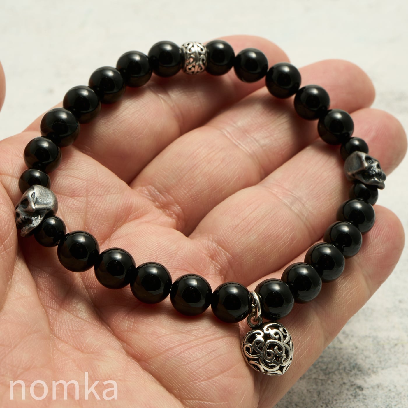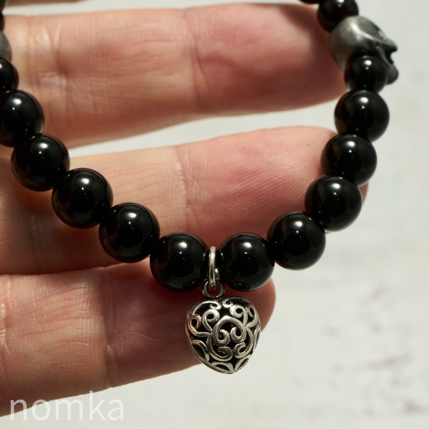 【THE REBIRTH/挑戦と前進】オニキス×スカル×ハートチャーム デザインブレスレット 約18cm