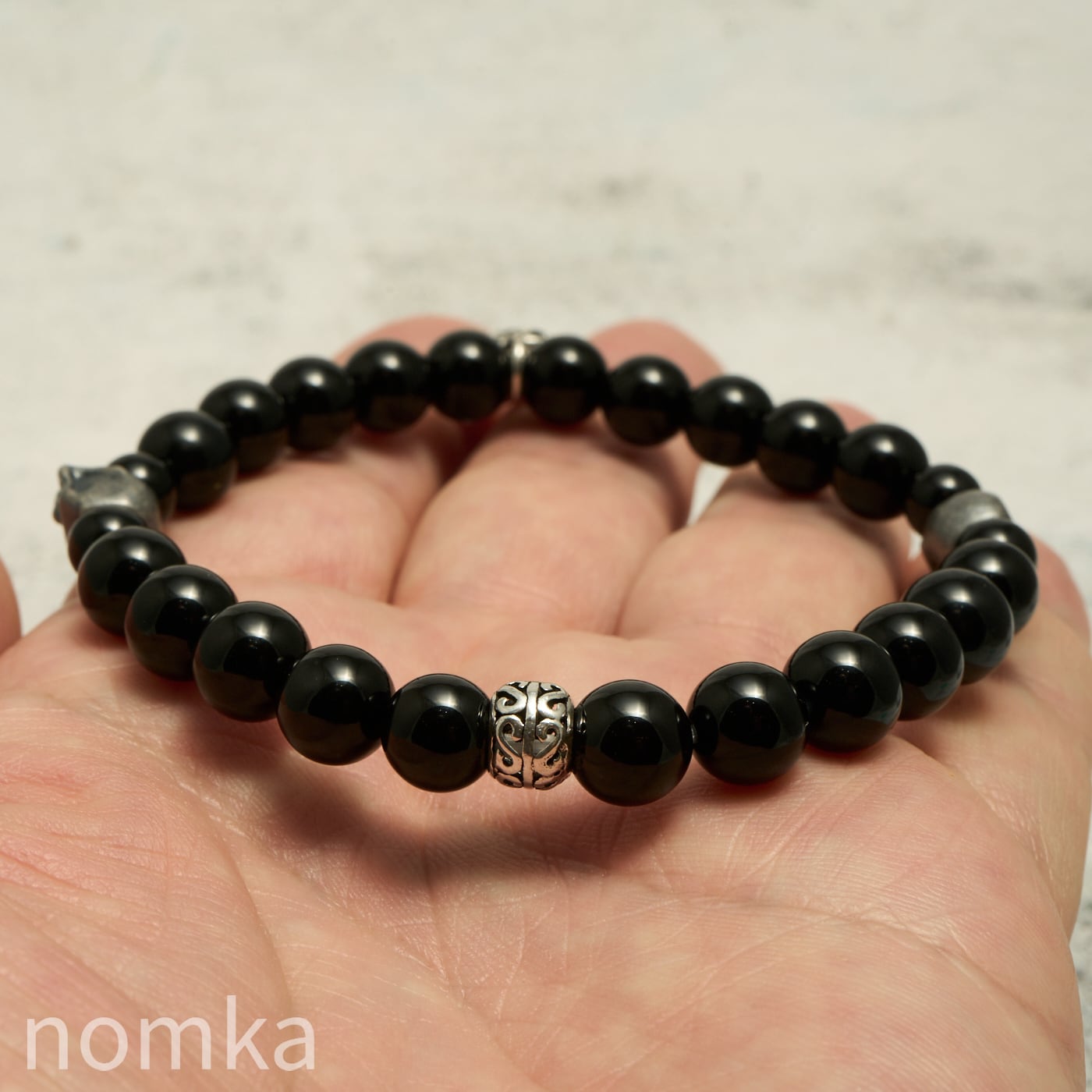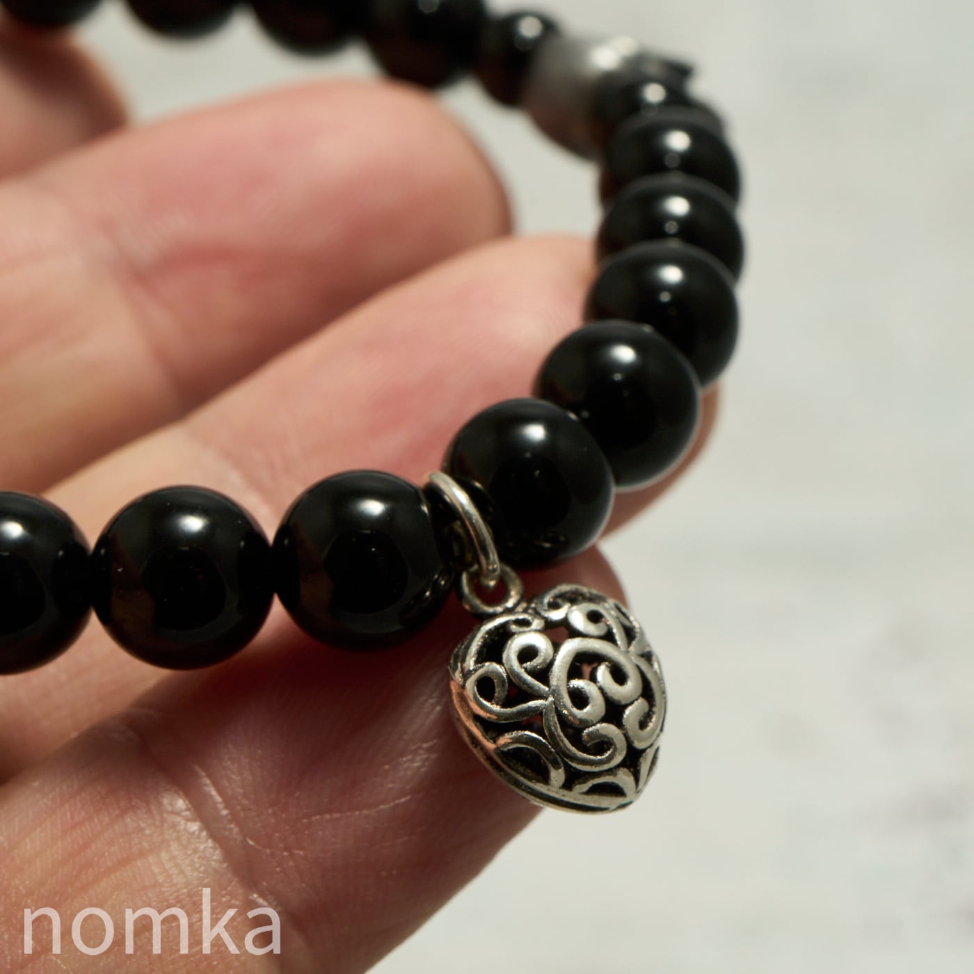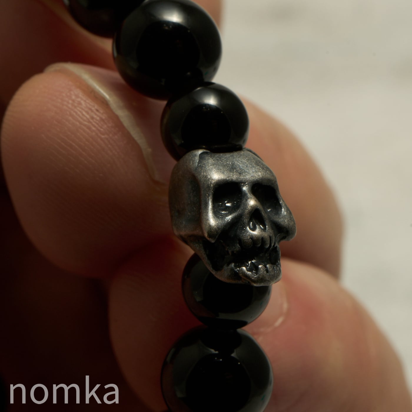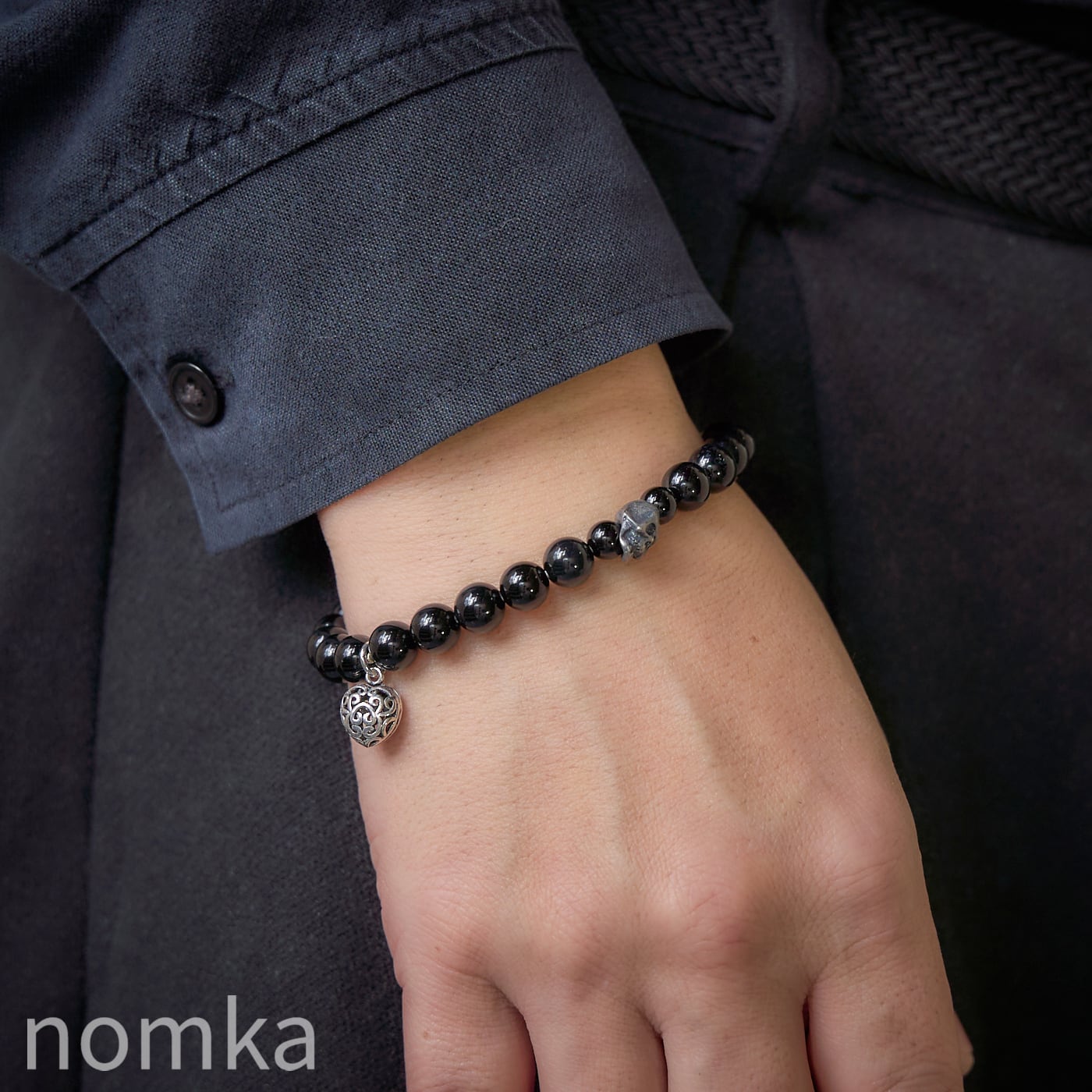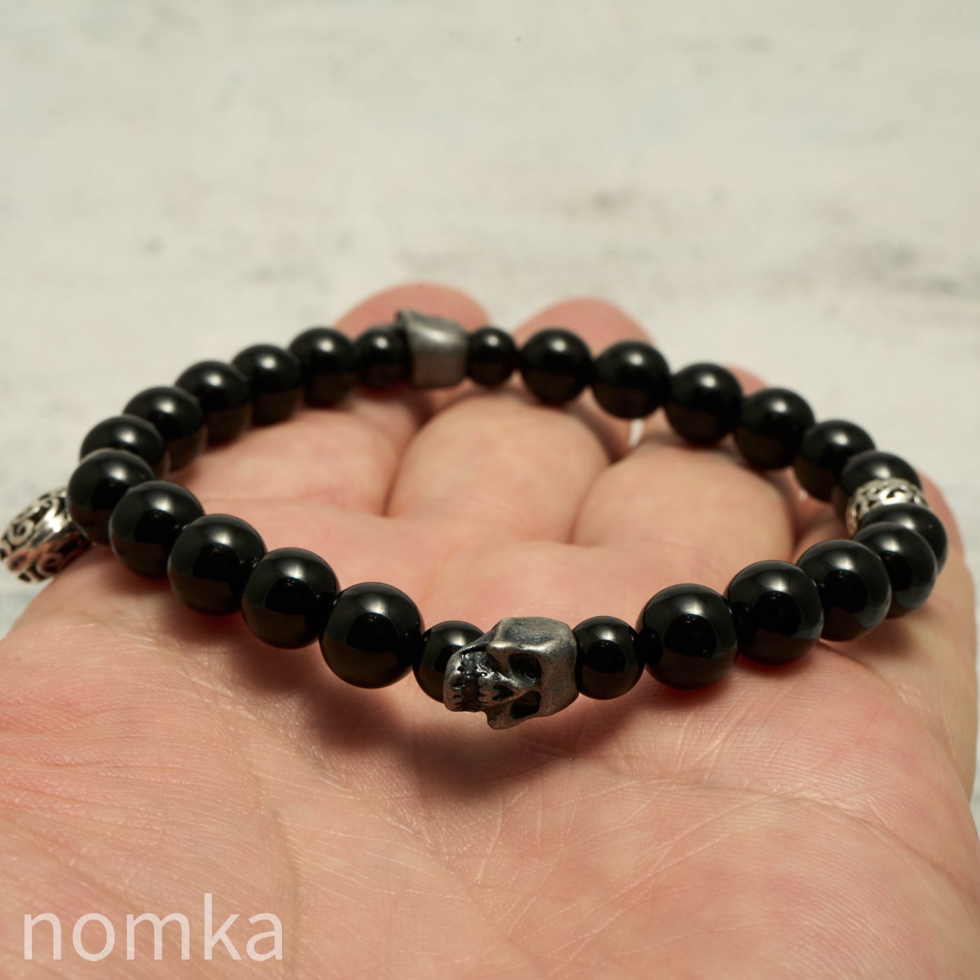 【THE REBIRTH/挑戦と前進】オニキス×スカル×ハートチャーム デザインブレスレット 約18cm