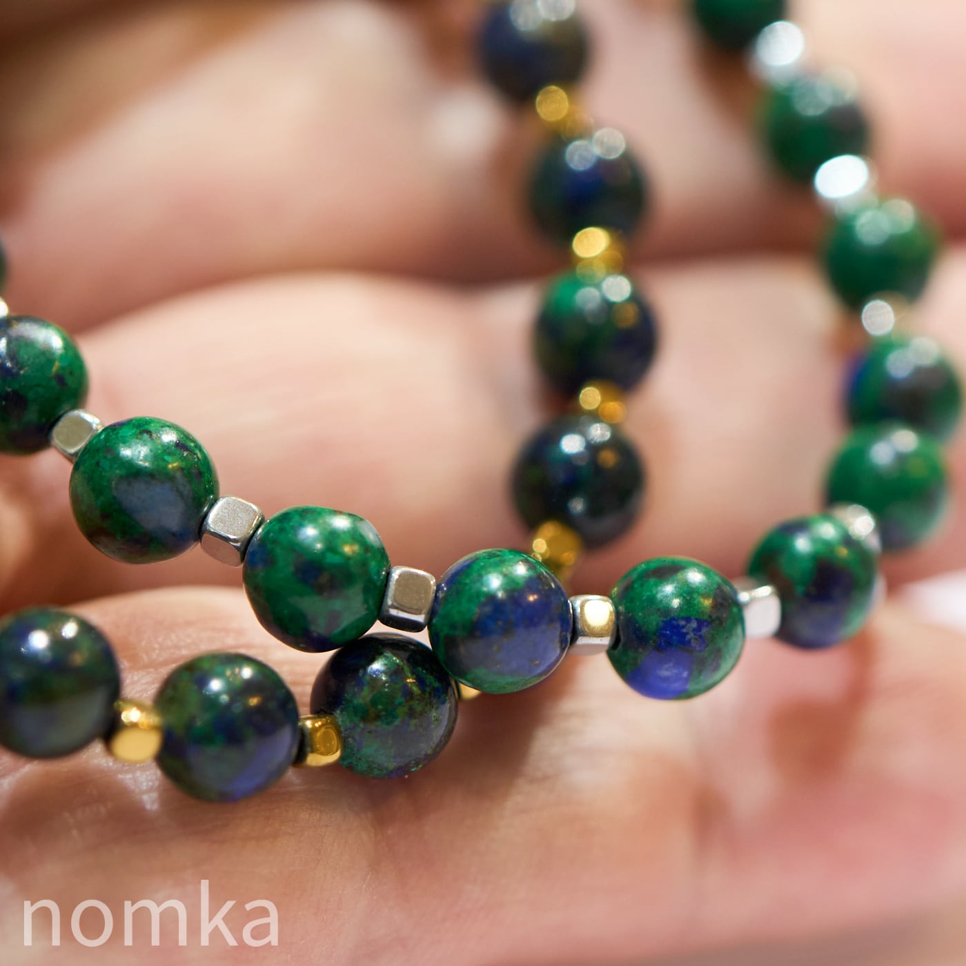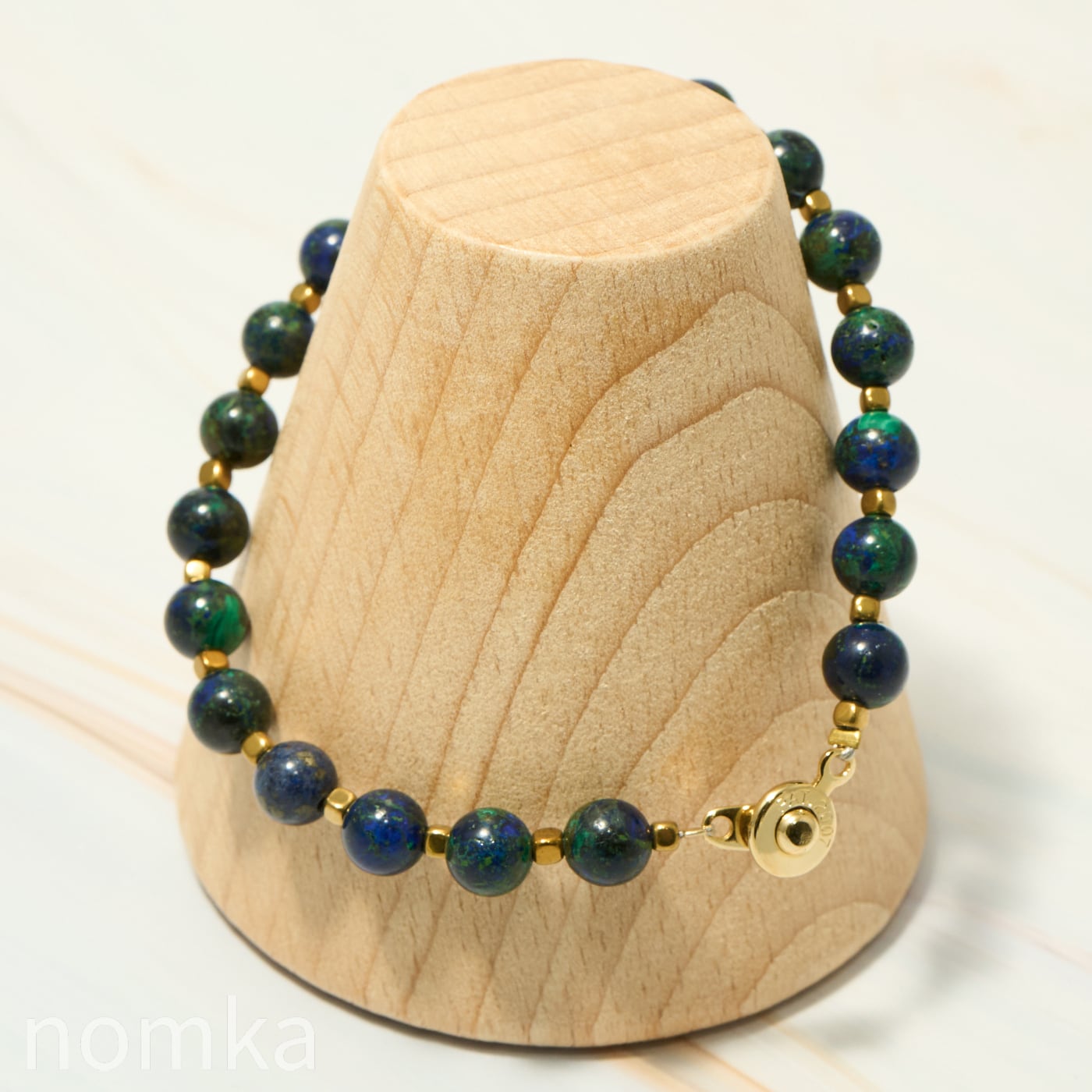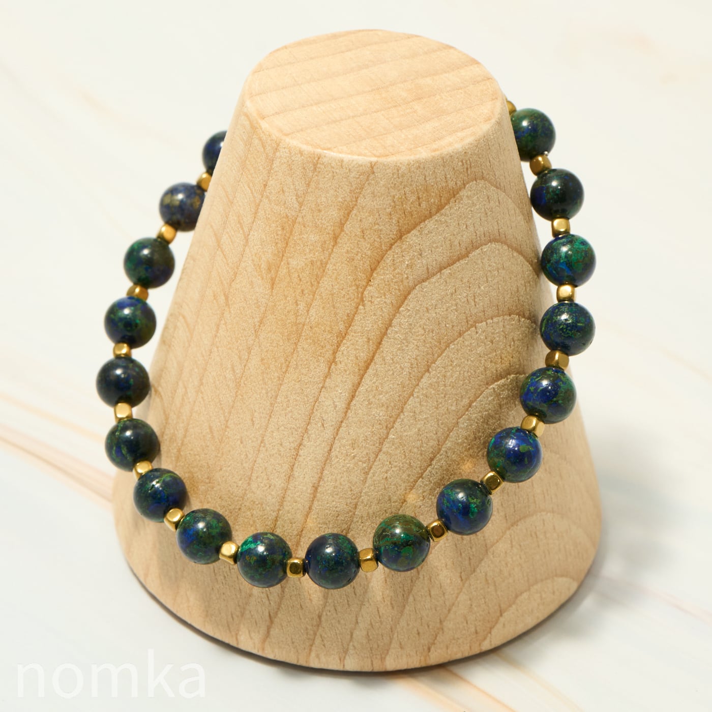 シリーズ「EARTH」は、アズライトの比率が高い濃紺のアズマラカイトを主役にしたブレスレットです。