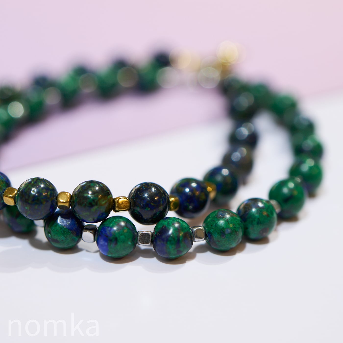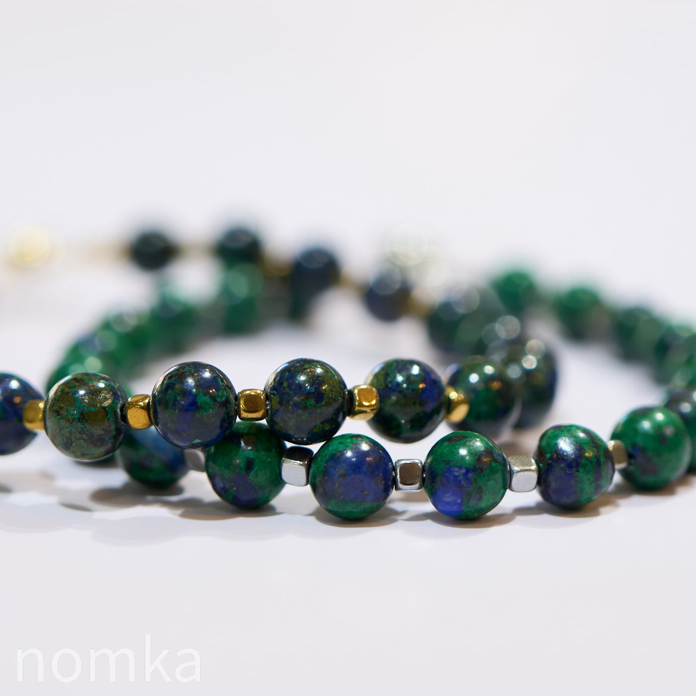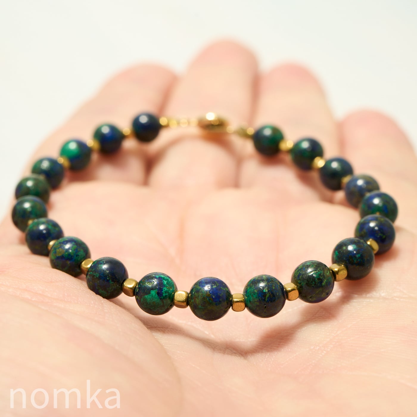 シリーズ「EARTH」は、アズライトの比率が高い濃紺のアズマラカイトを主役にしたブレスレットです。
