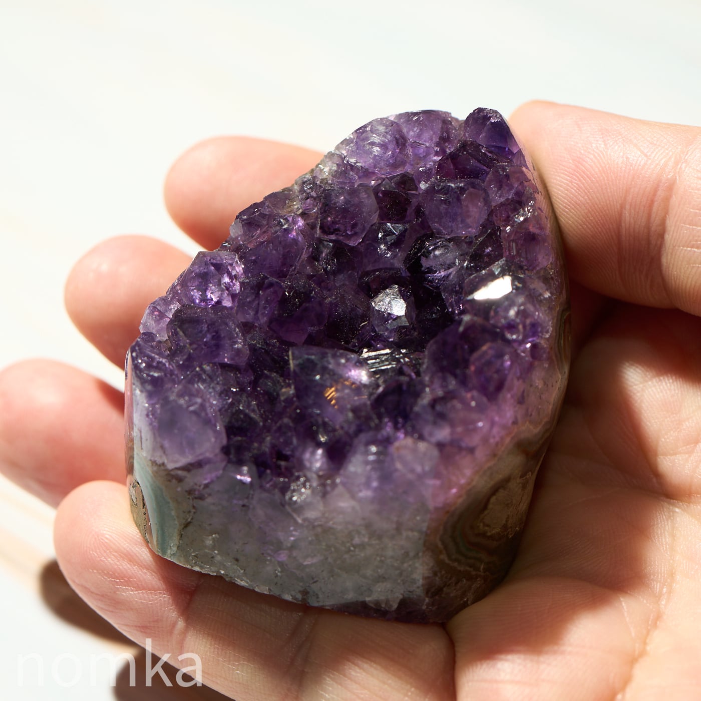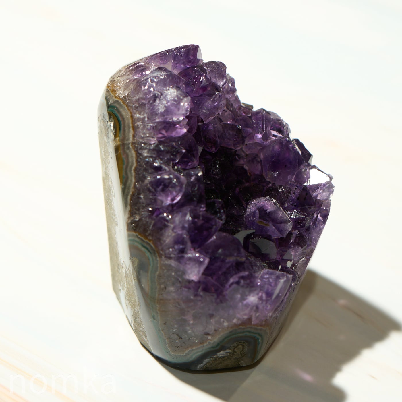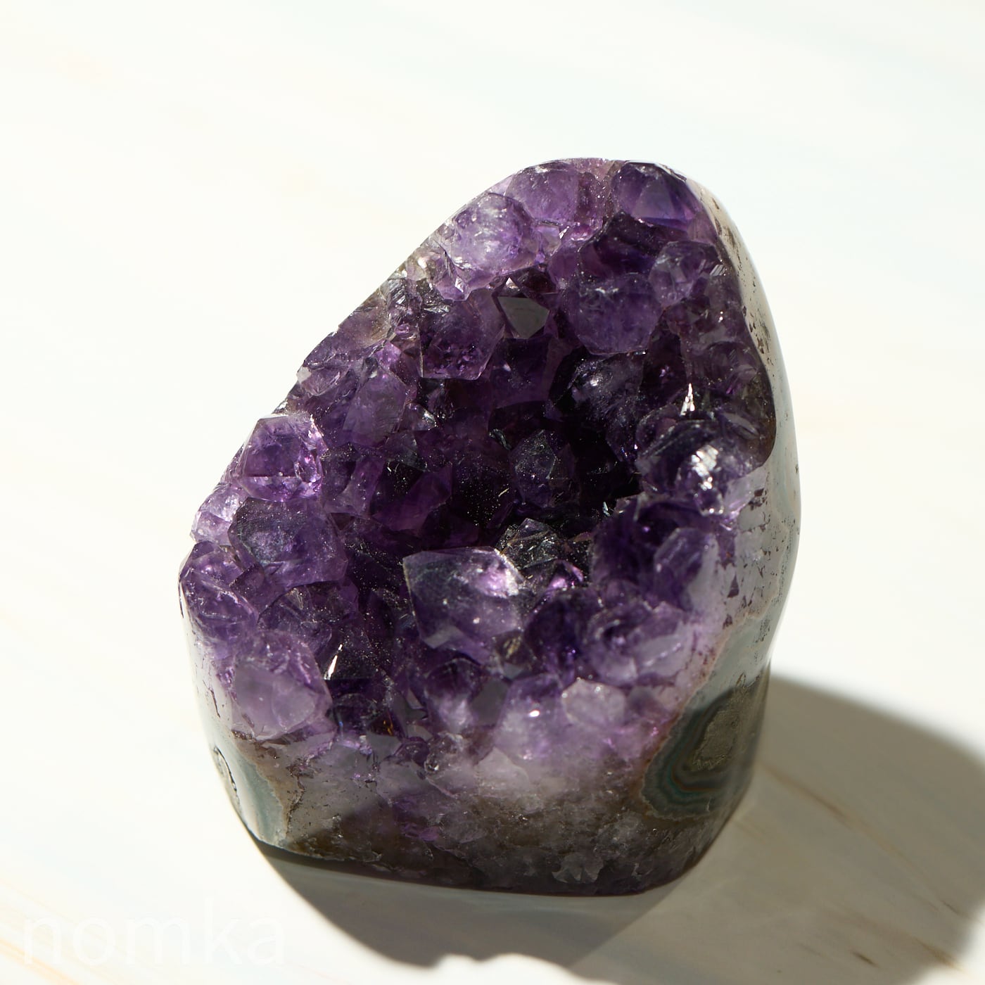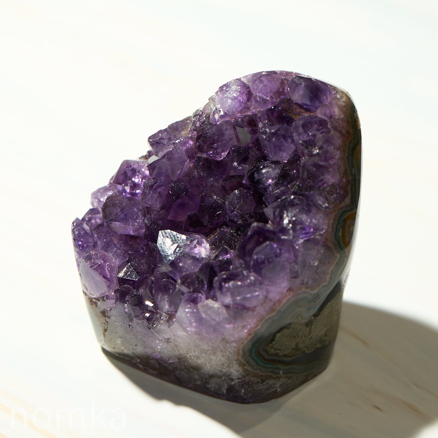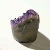 結晶のひとつひとつが大きく、力強いエッジを持っており、光を多方向に反射してキラキラと輝きます。側面にはアメジストが育まれる過程で形成された瑪瑙(メノウ)の層が美しい縞模様を描いており、自然が何千万年もの歳月をかけて作り上げた「芸術作品」であることを物語っています。