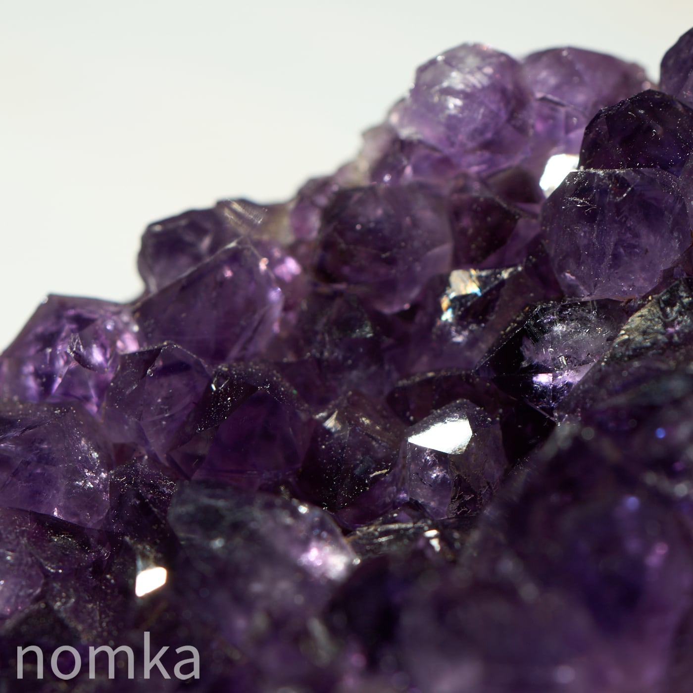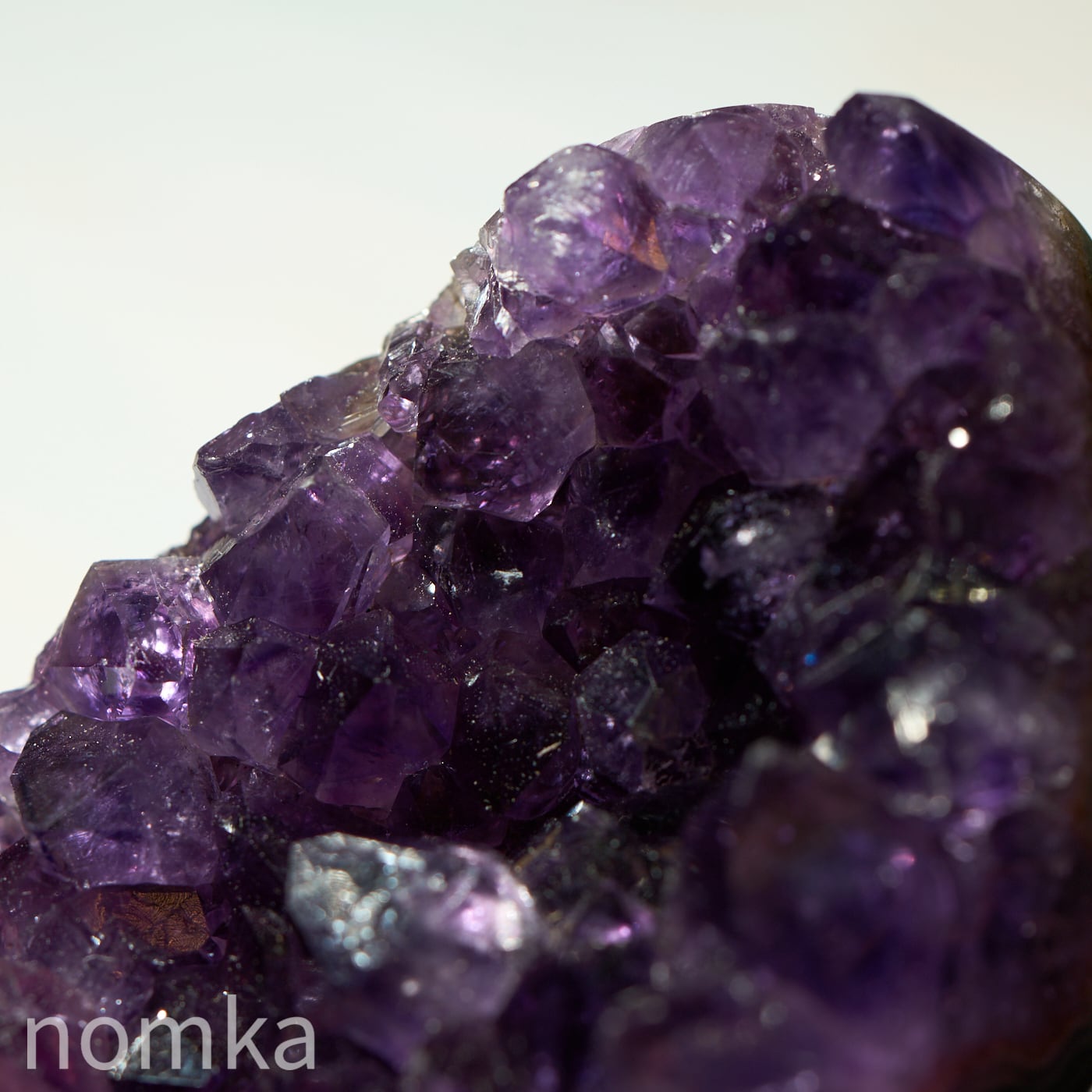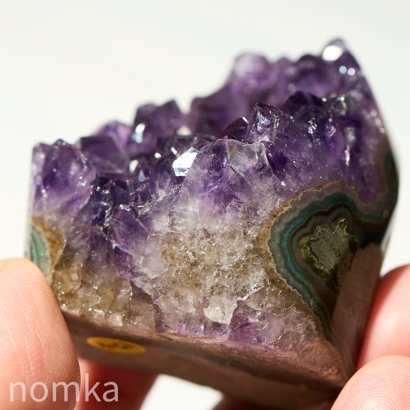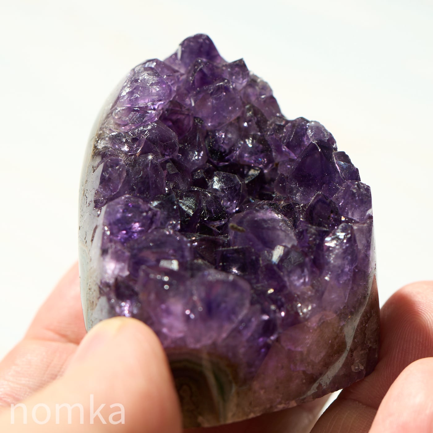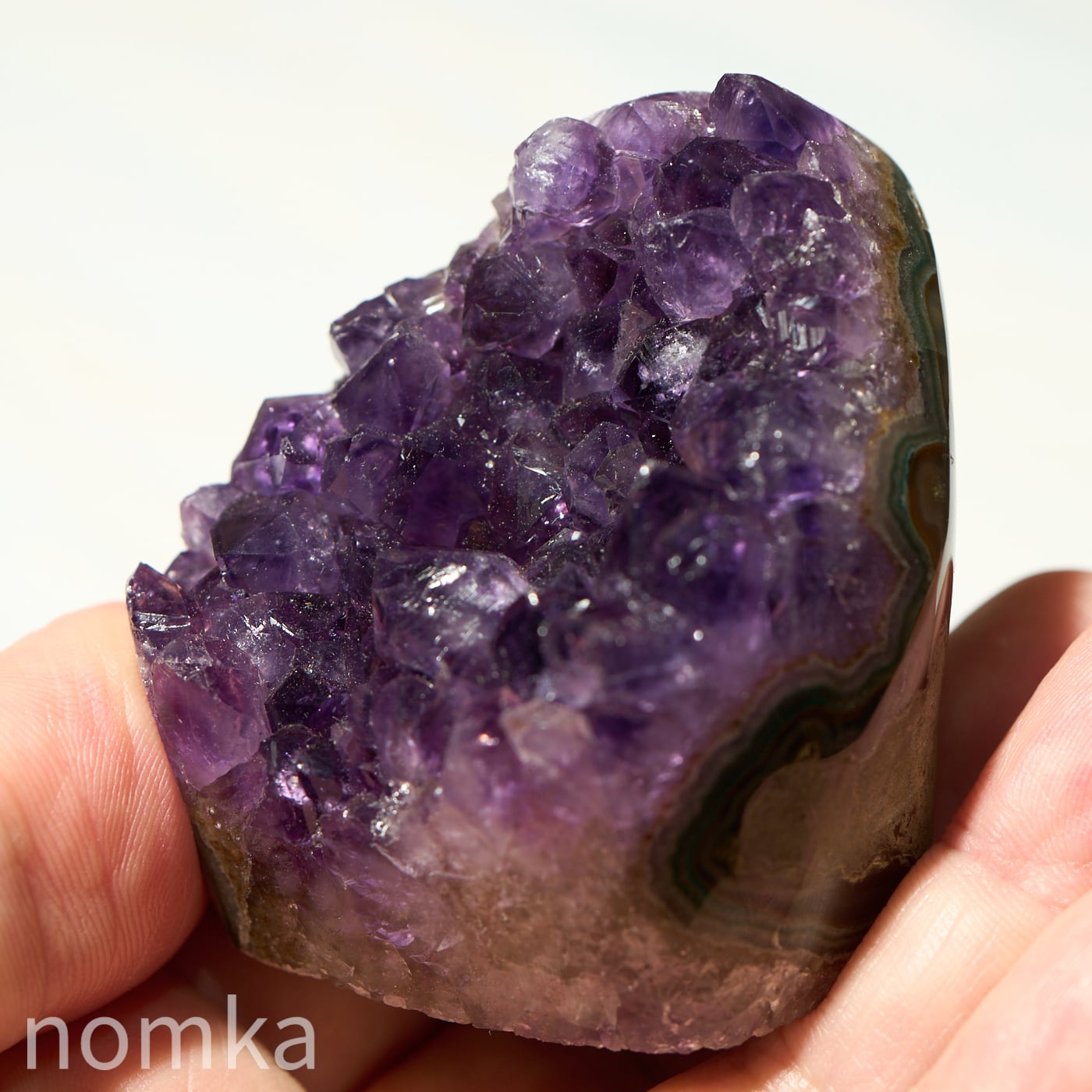結晶のひとつひとつが大きく、力強いエッジを持っており、光を多方向に反射してキラキラと輝きます。側面にはアメジストが育まれる過程で形成された瑪瑙(メノウ)の層が美しい縞模様を描いており、自然が何千万年もの歳月をかけて作り上げた「芸術作品」であることを物語っています。