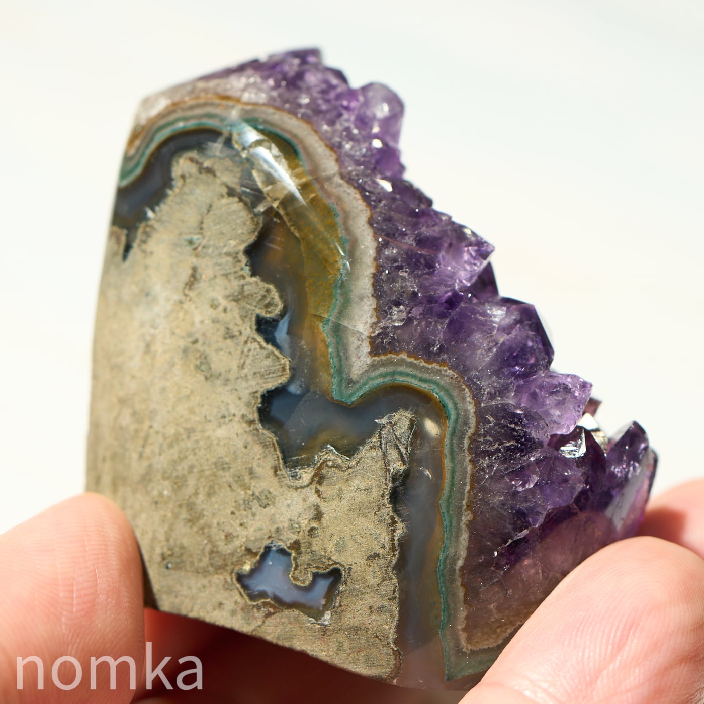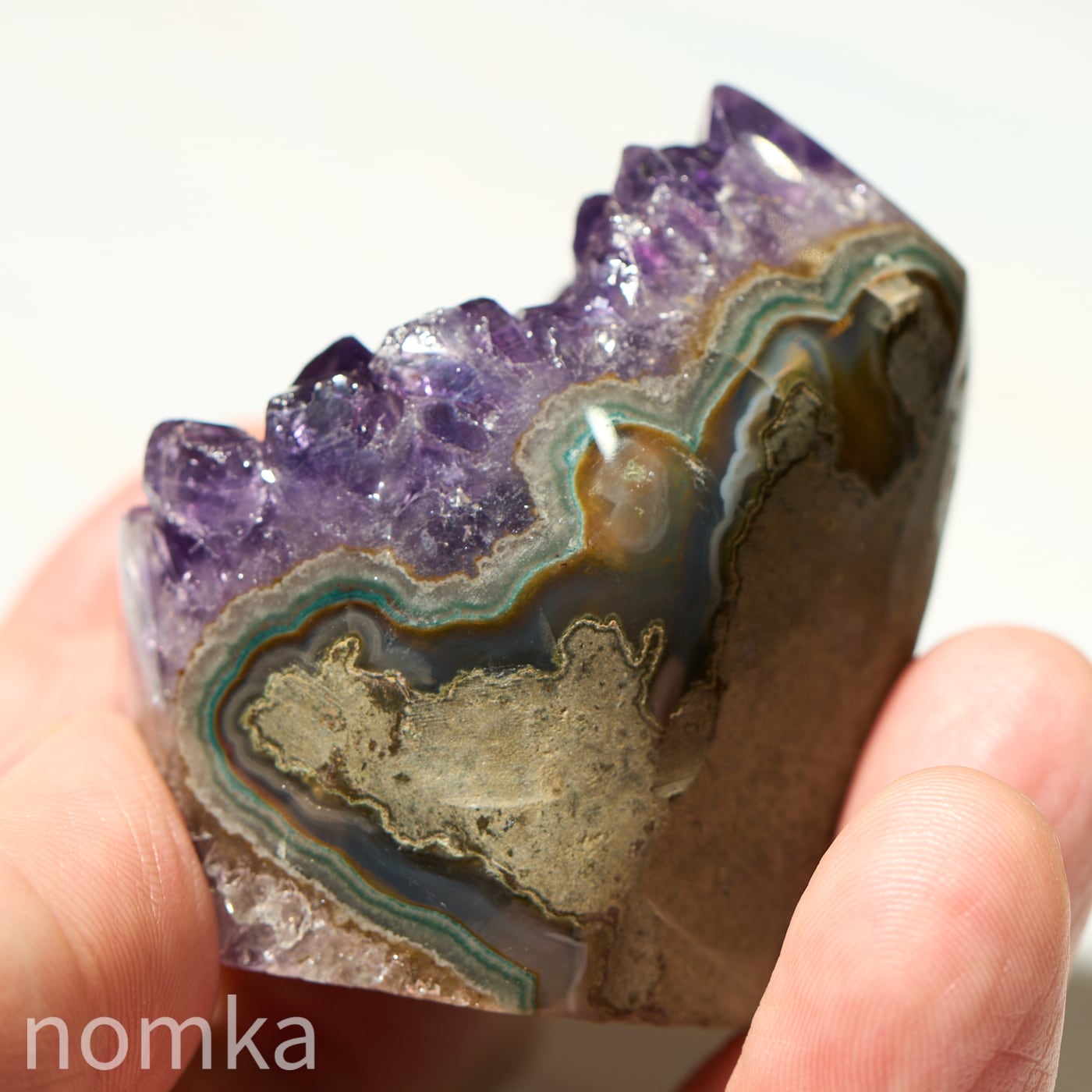 母岩の瑪瑙層(メノウ)もしっかりと確認でき、原石そのままの力強い息吹と、洗練された紫の輝きを同時に楽しむことができます。