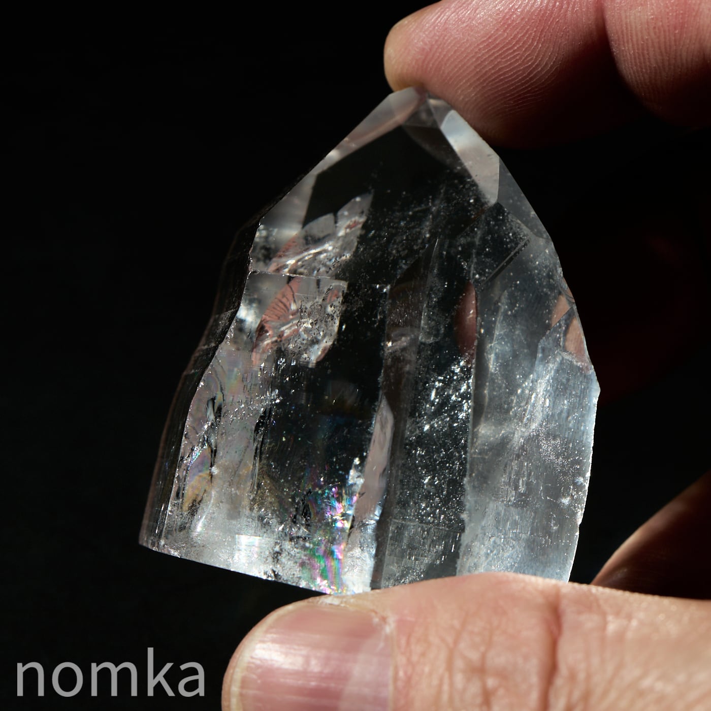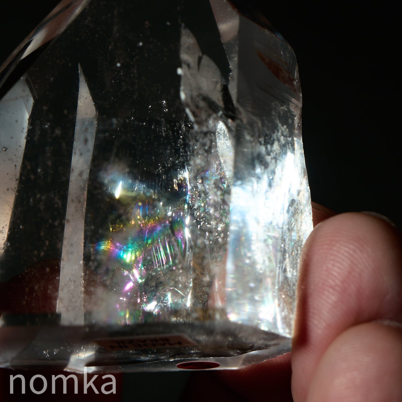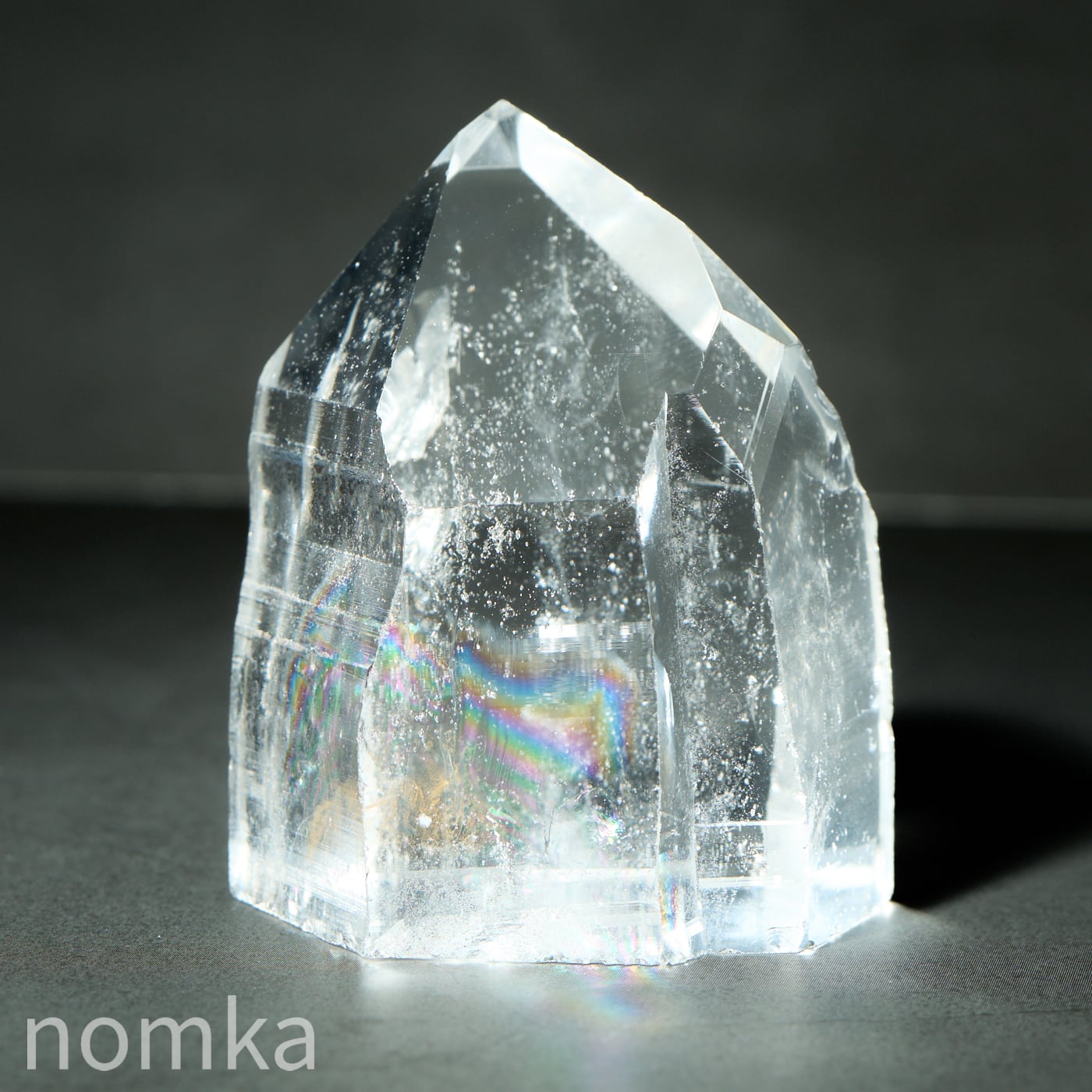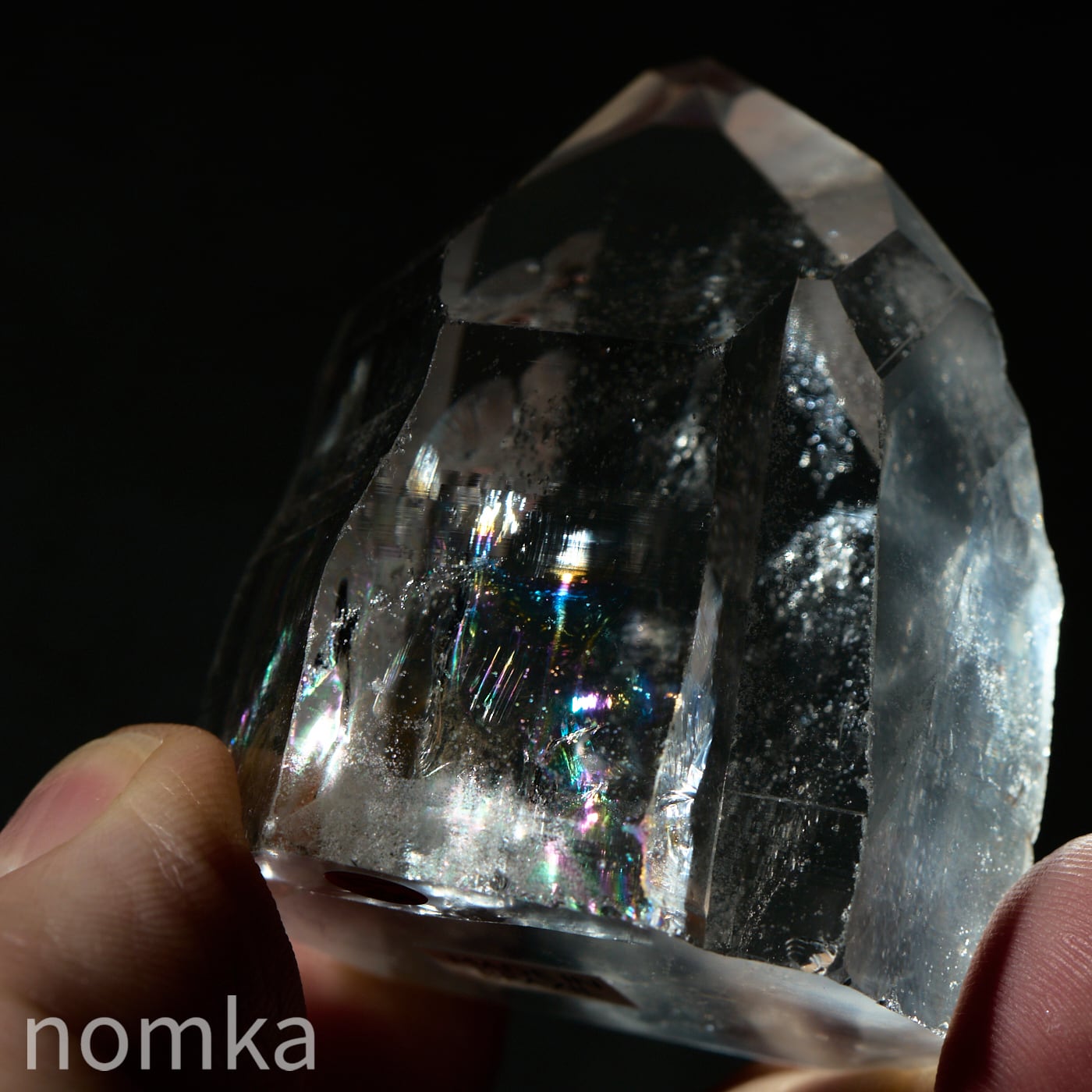 この個体の最大の見どころは、思わず息を呑むほどの圧倒的な透明度と、その奥底から湧き上がるように現れる大きな虹(アイリス)です。
