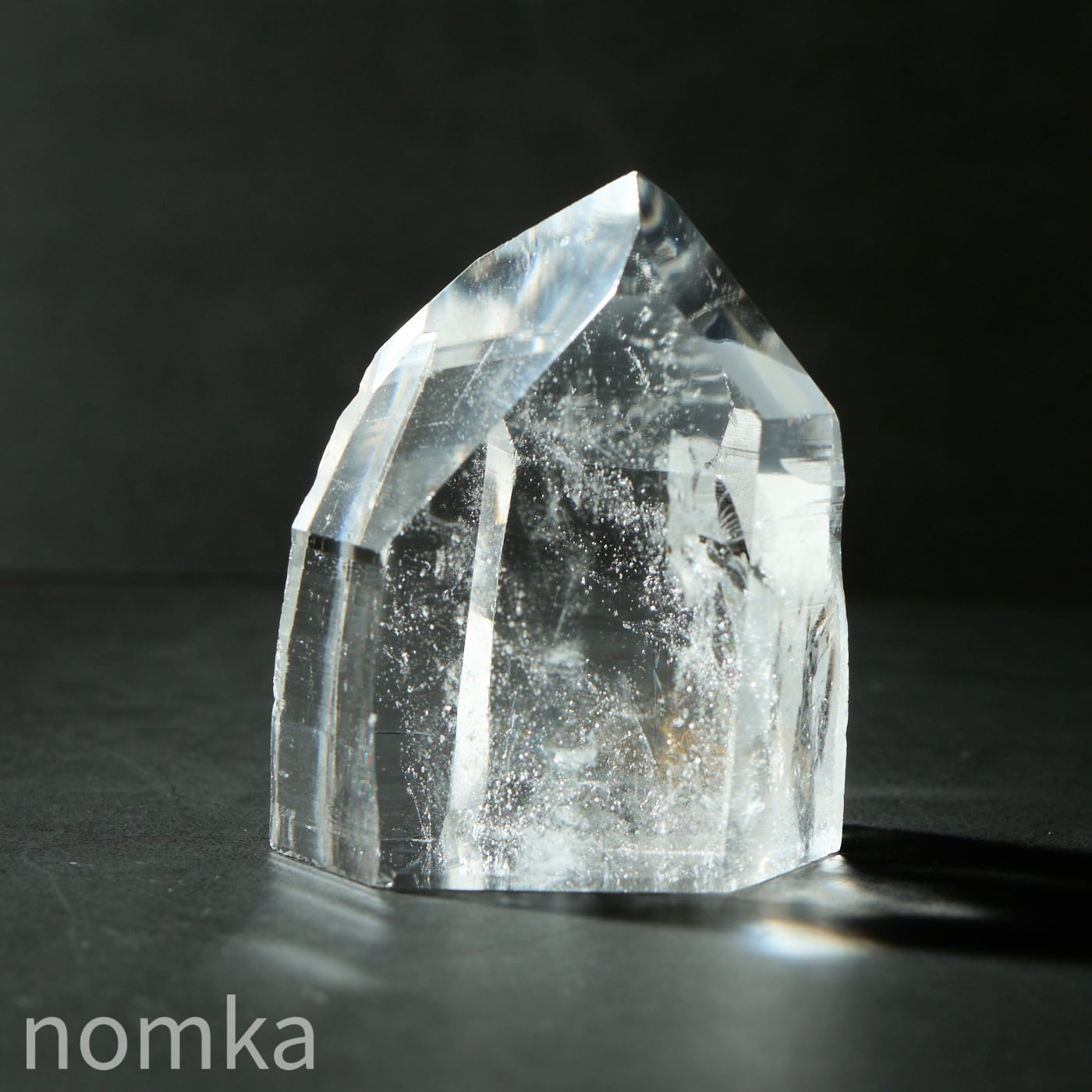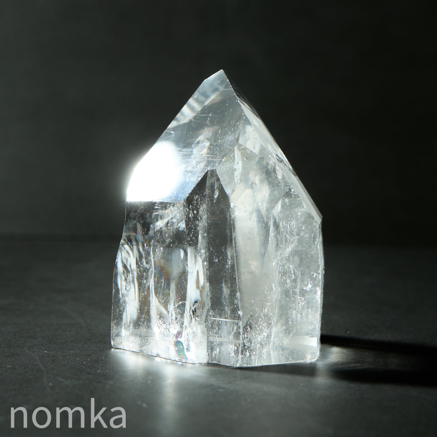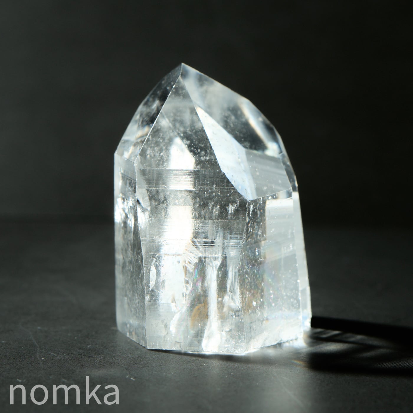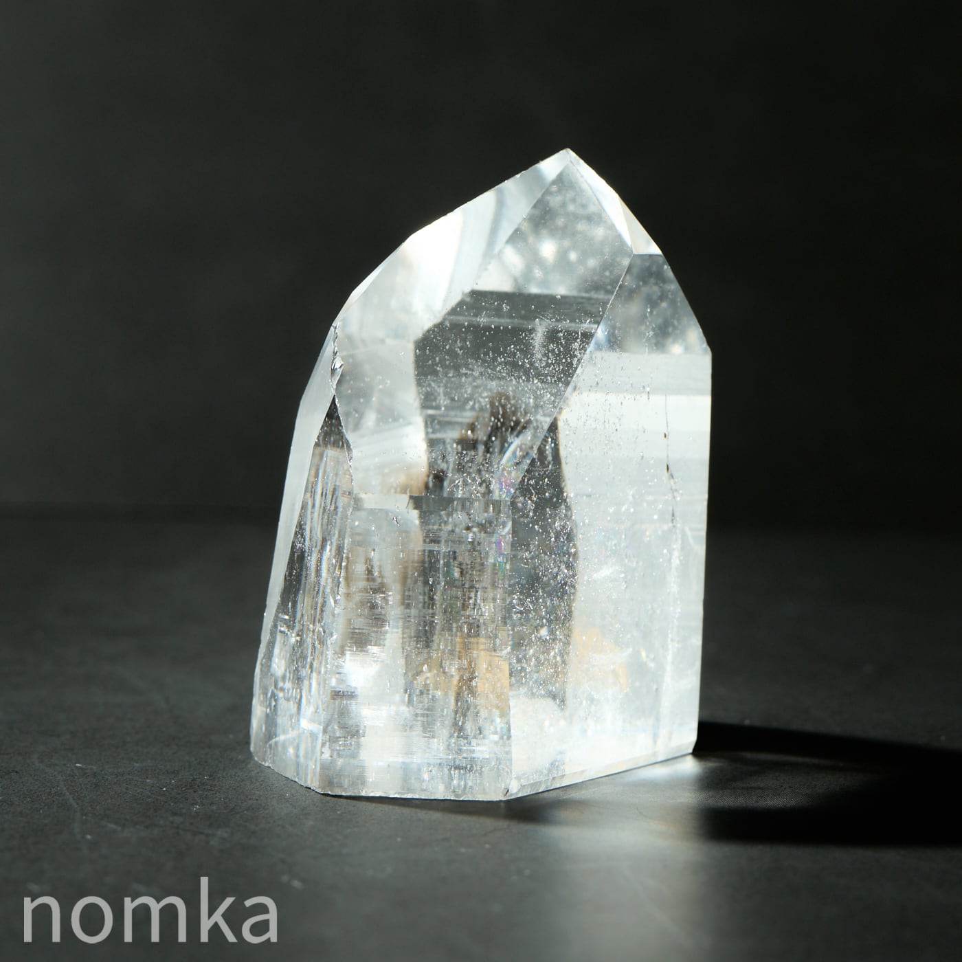 この個体の最大の見どころは、思わず息を呑むほどの圧倒的な透明度と、その奥底から湧き上がるように現れる大きな虹(アイリス)です。