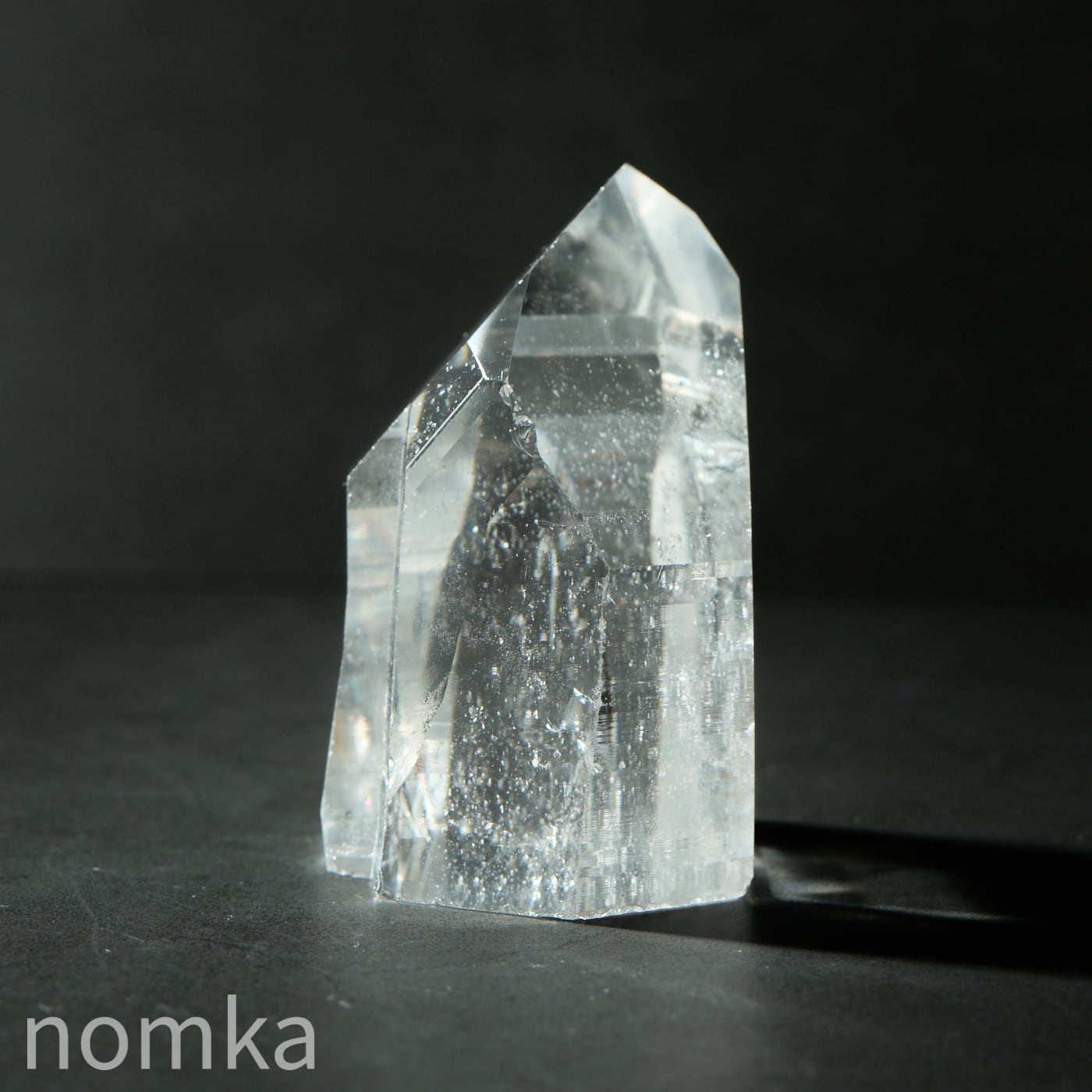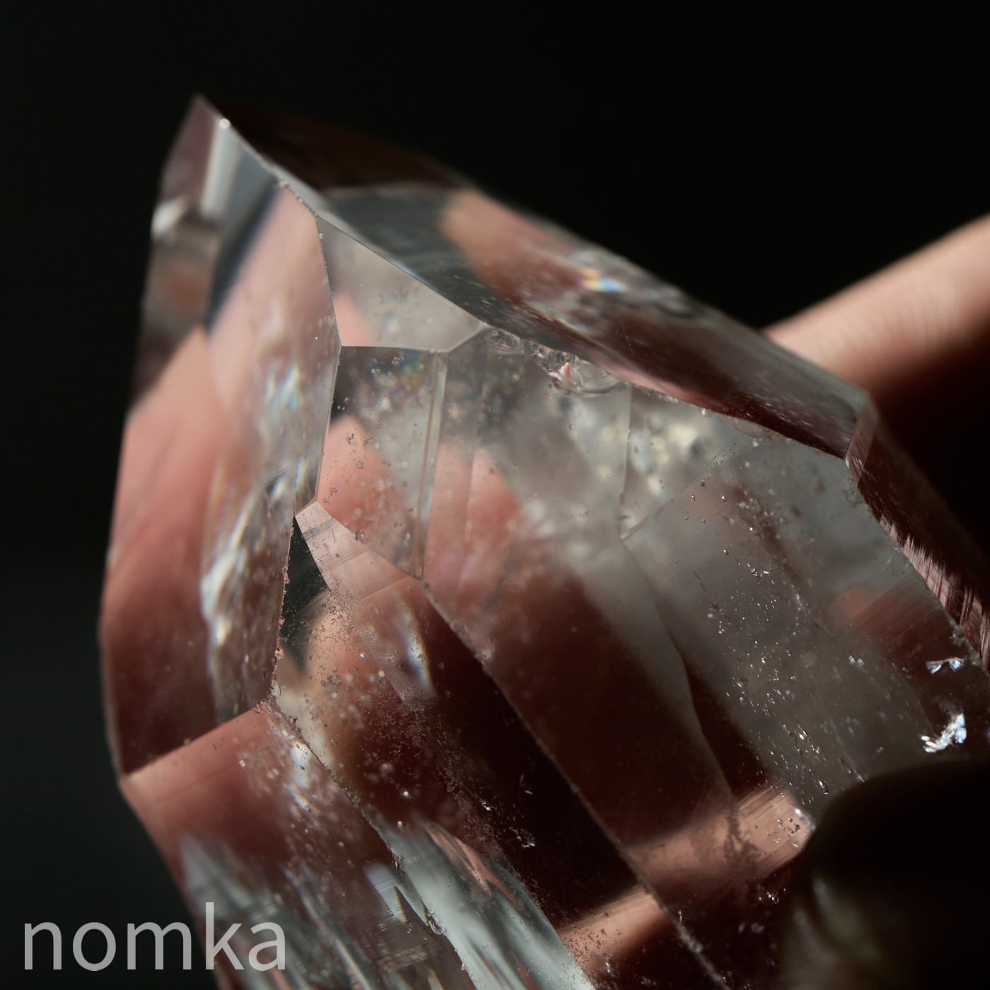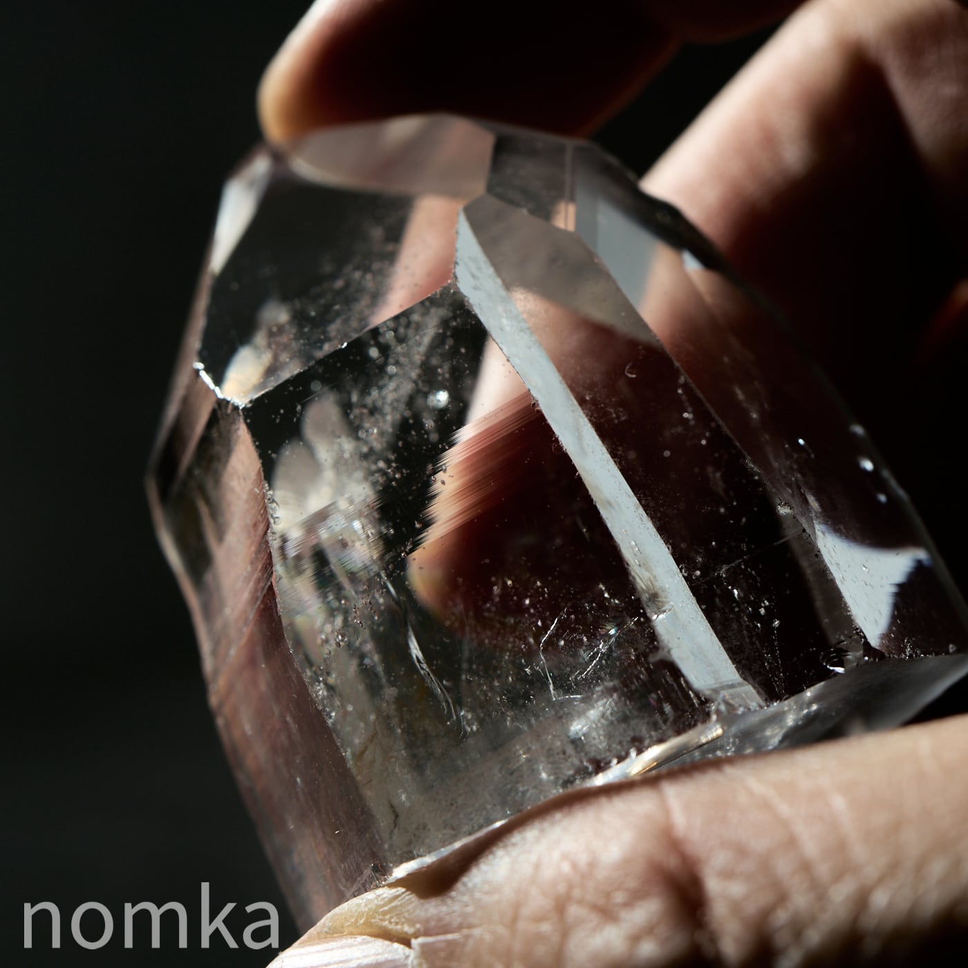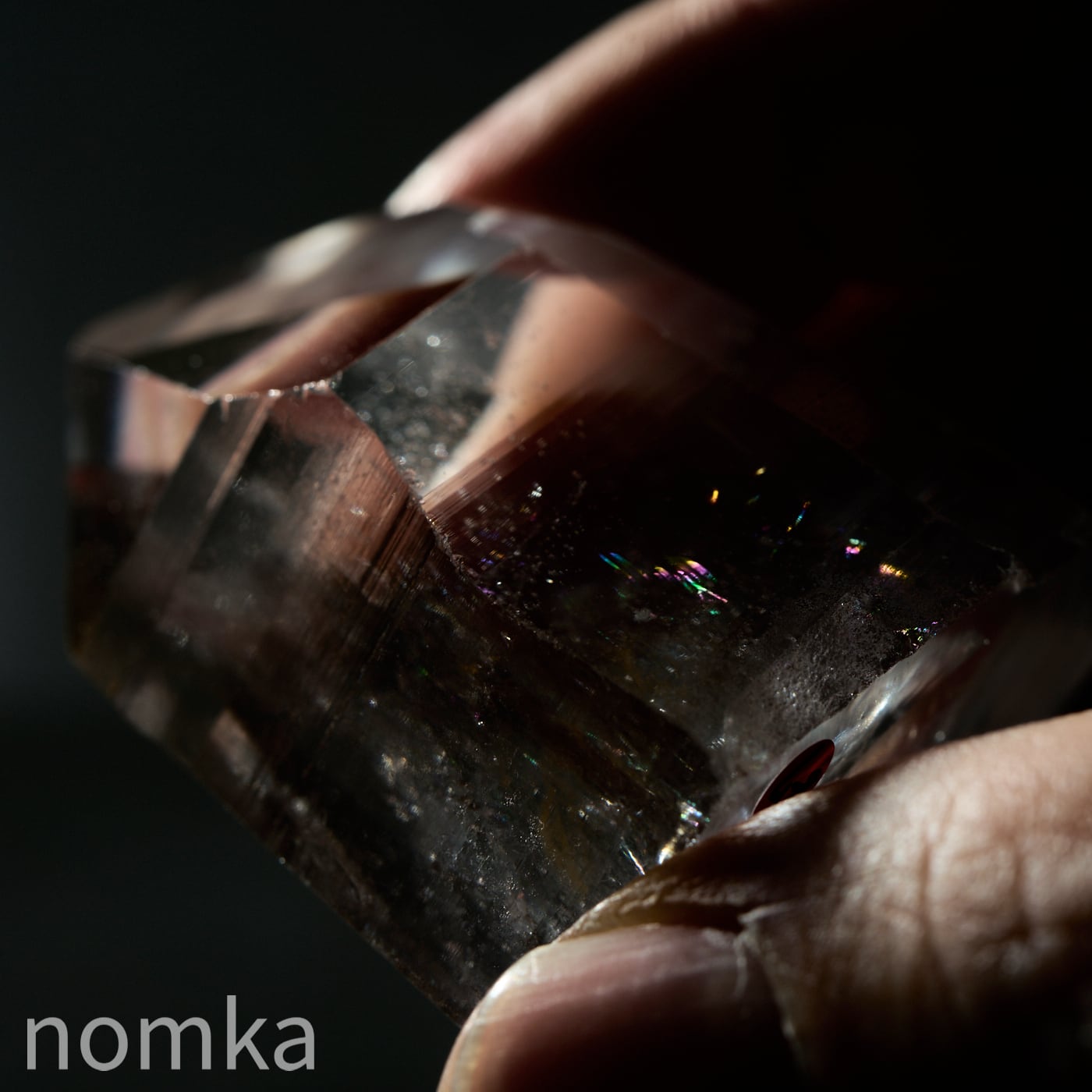 この個体の最大の見どころは、思わず息を呑むほどの圧倒的な透明度と、その奥底から湧き上がるように現れる大きな虹(アイリス)です。