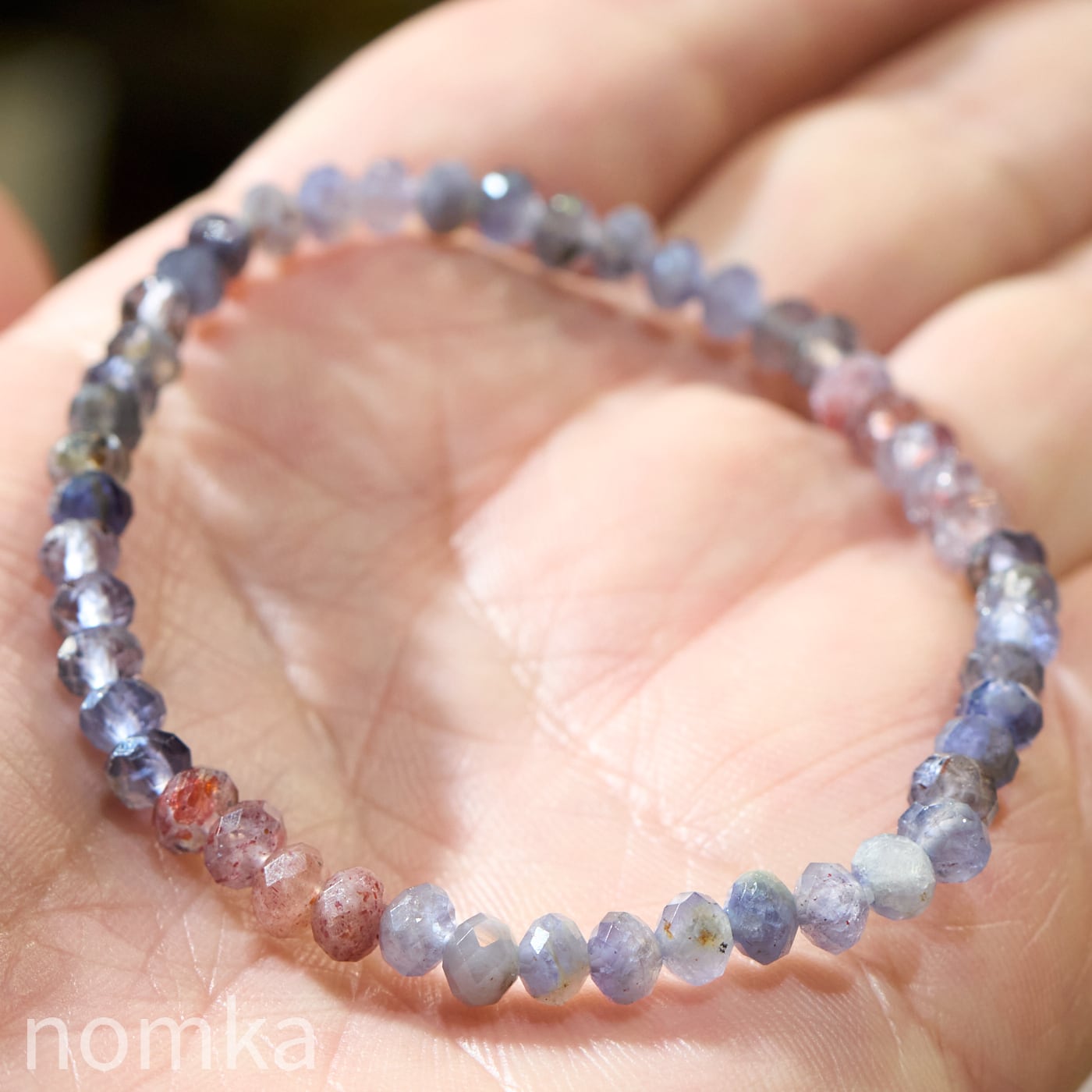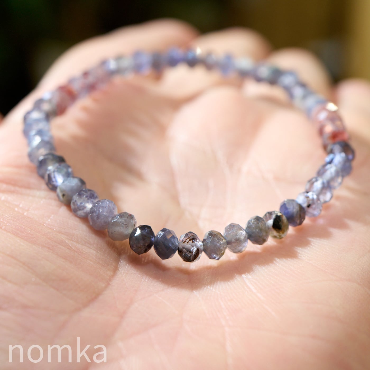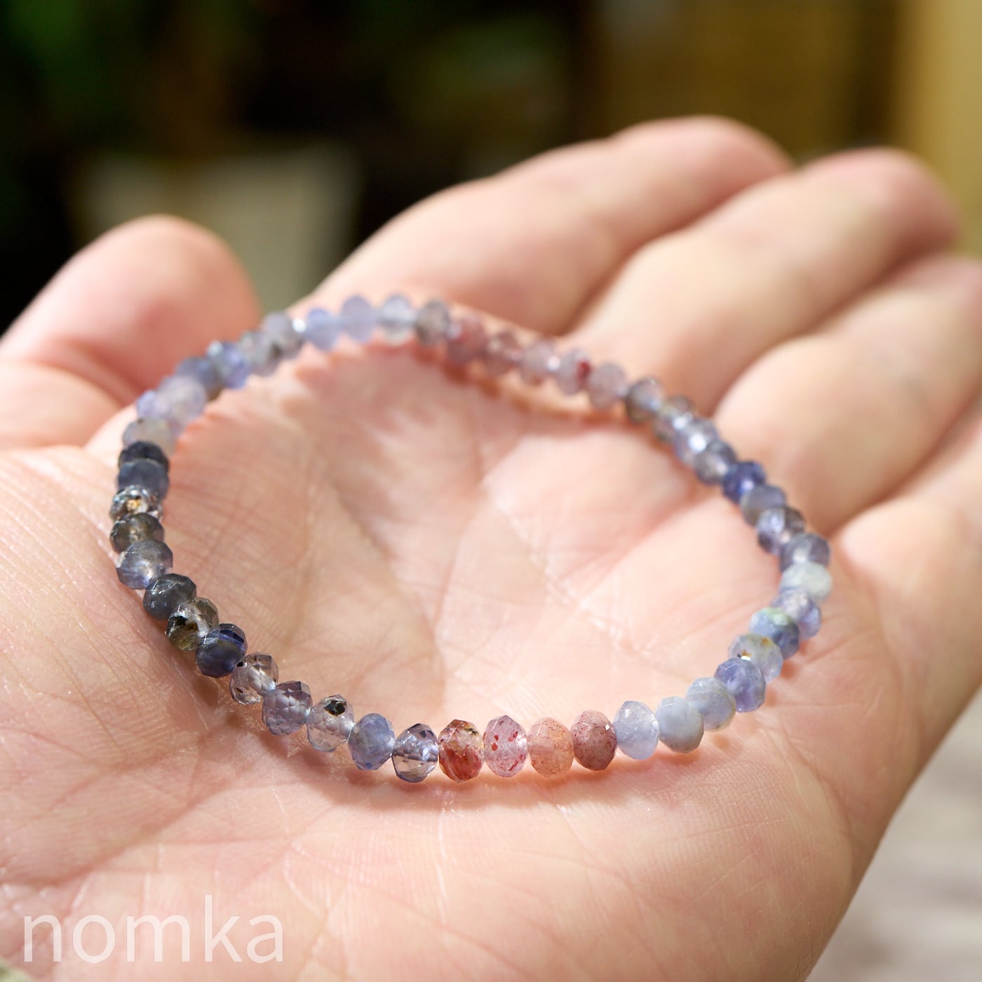 細やかなボタンカットが施されているため、手首の動きに合わせて多方向に光を反射し、アイオライト特有の多色性とレピドクロサイトの輝きを同時に楽しむことができます。
