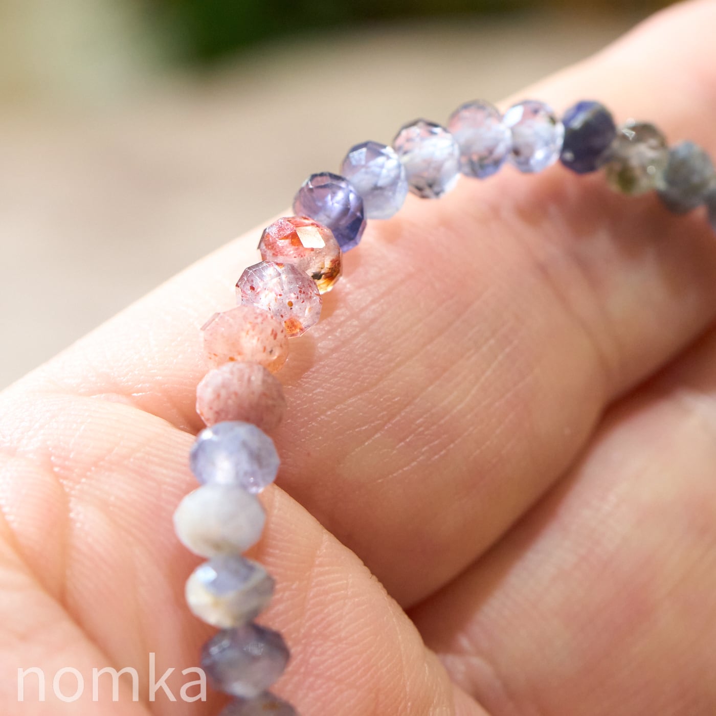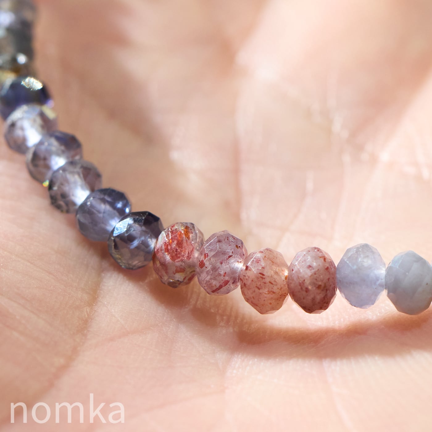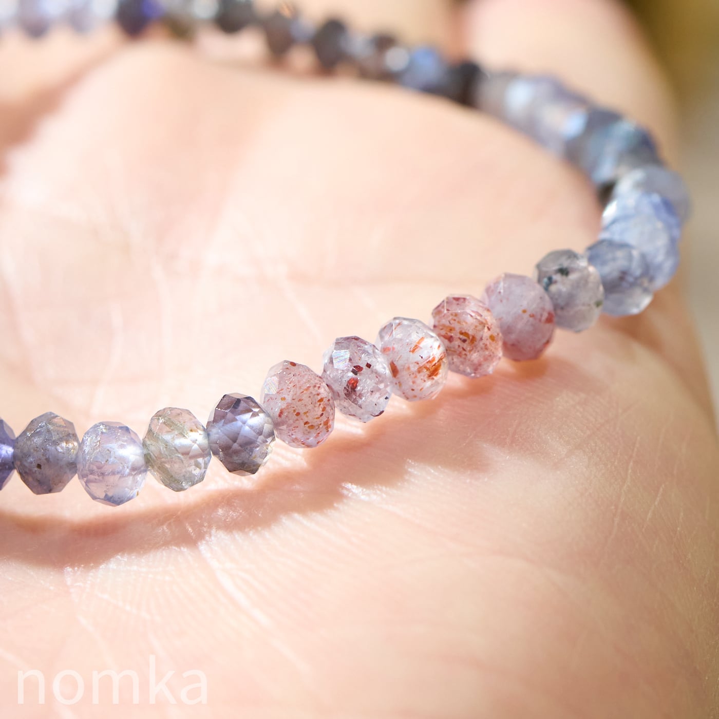 細やかなボタンカットが施されているため、手首の動きに合わせて多方向に光を反射し、アイオライト特有の多色性とレピドクロサイトの輝きを同時に楽しむことができます。