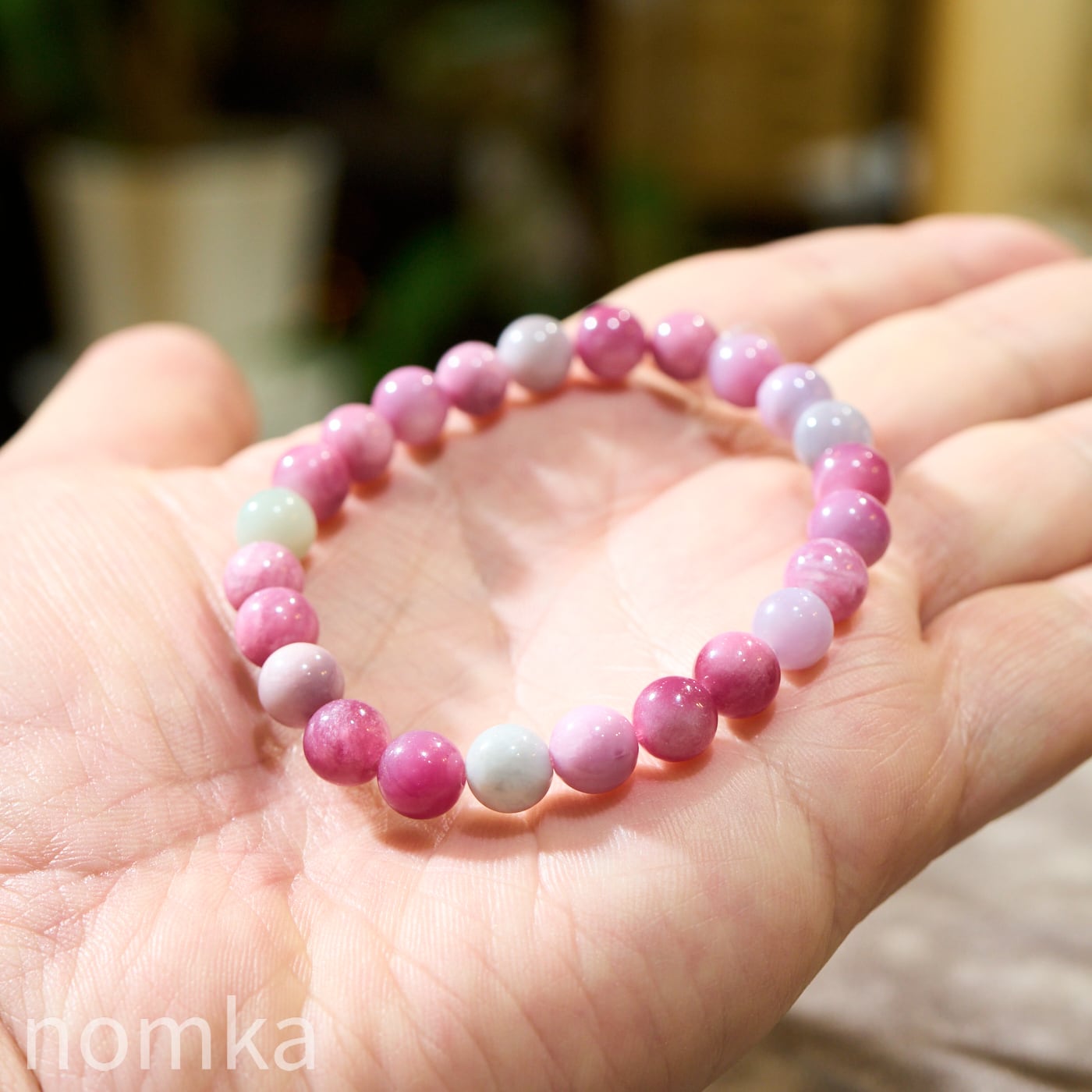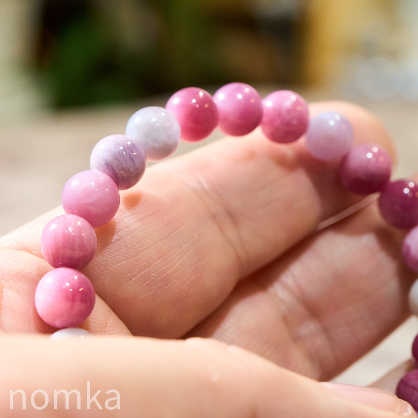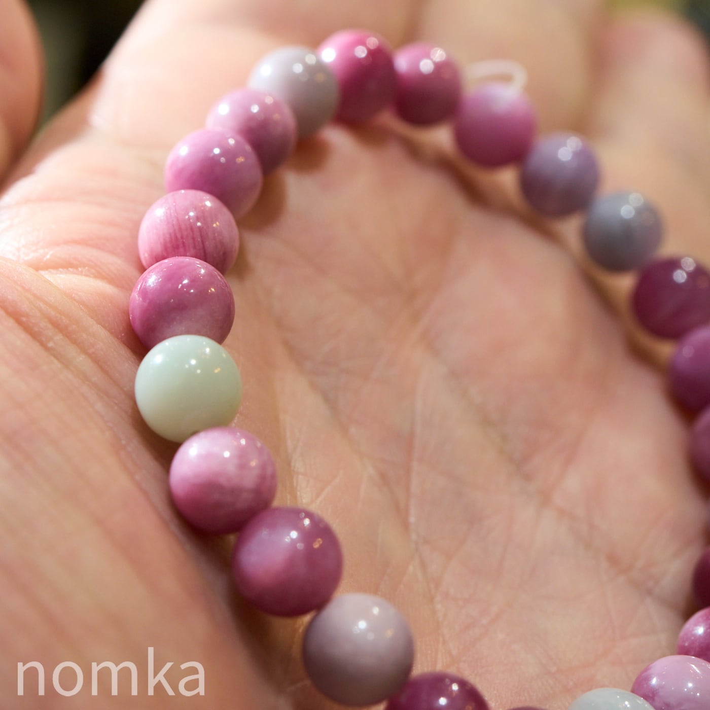 一玉ごとにピンクレッド、ラベンダー、ホワイトと異なる色彩を見せ、光の角度によってマイカ特有のシルキーな輝きが内側から優しく放たれます。
