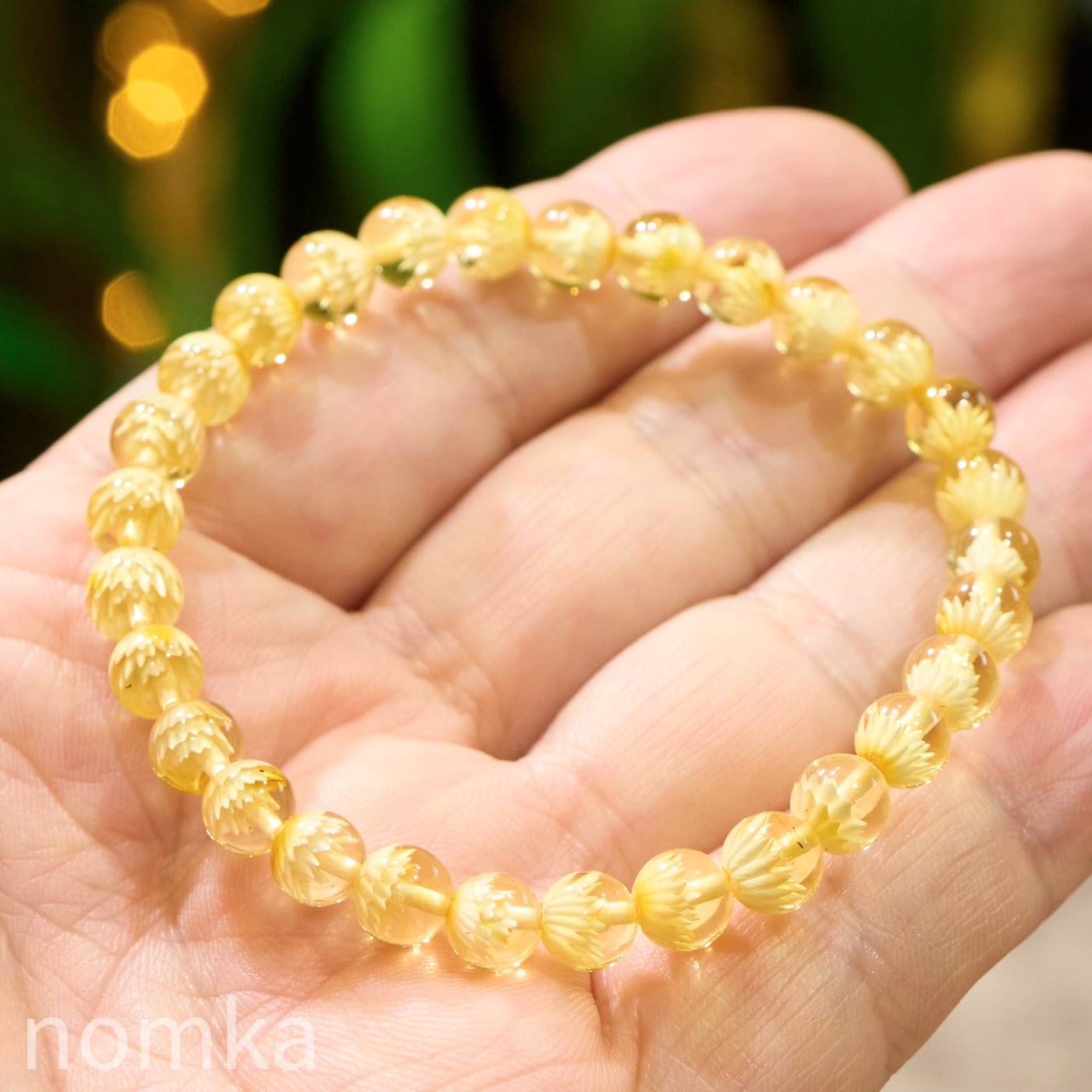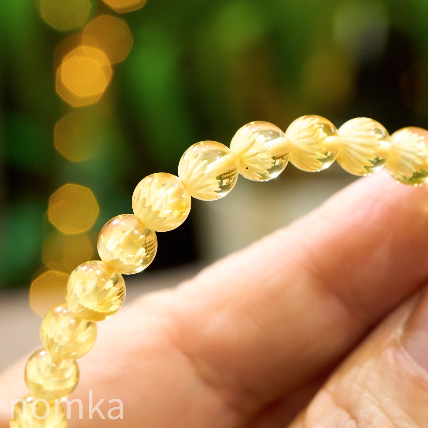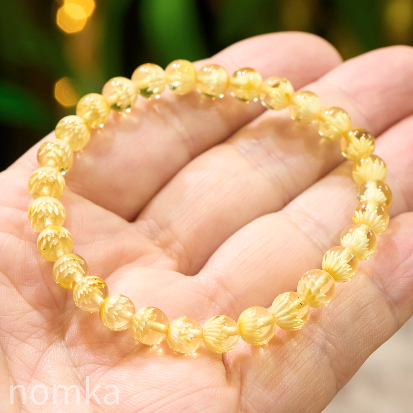 【光を纏う、聖なる花】バルト海産 レモンカラーアンバー(花彫刻) 一連ブレスレット (6.5mm珠/約17m)