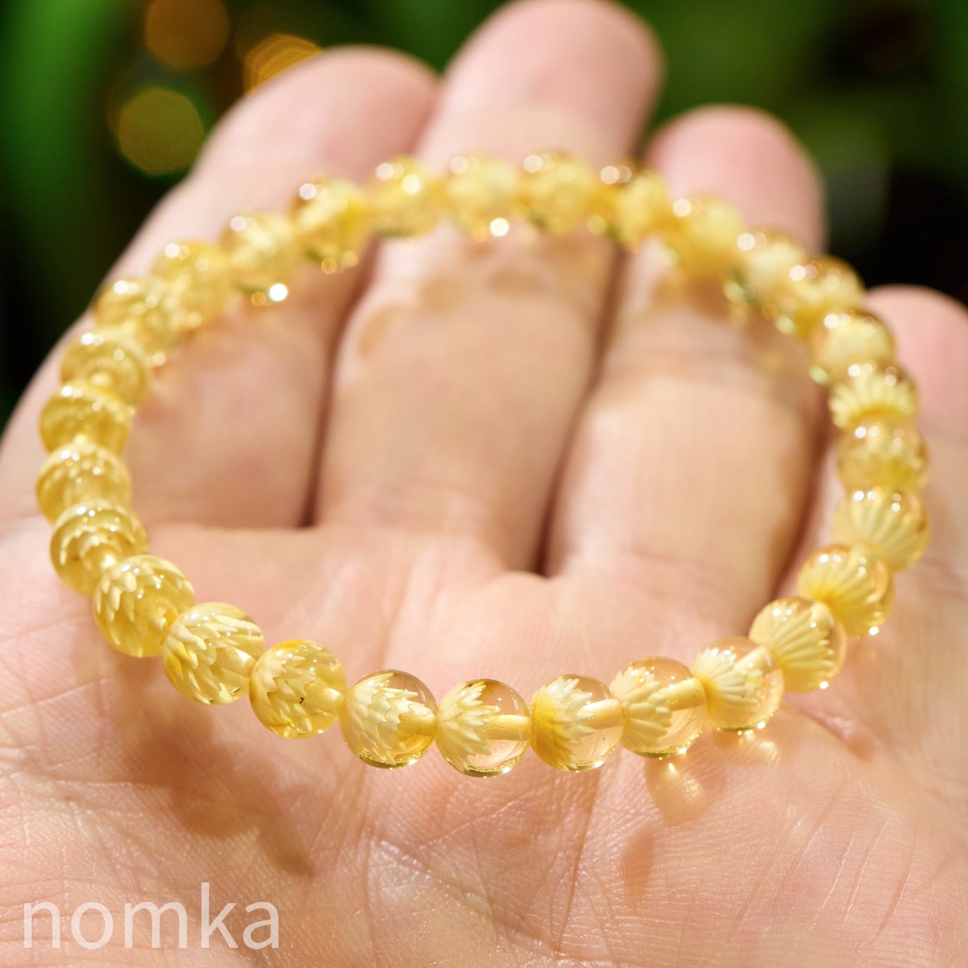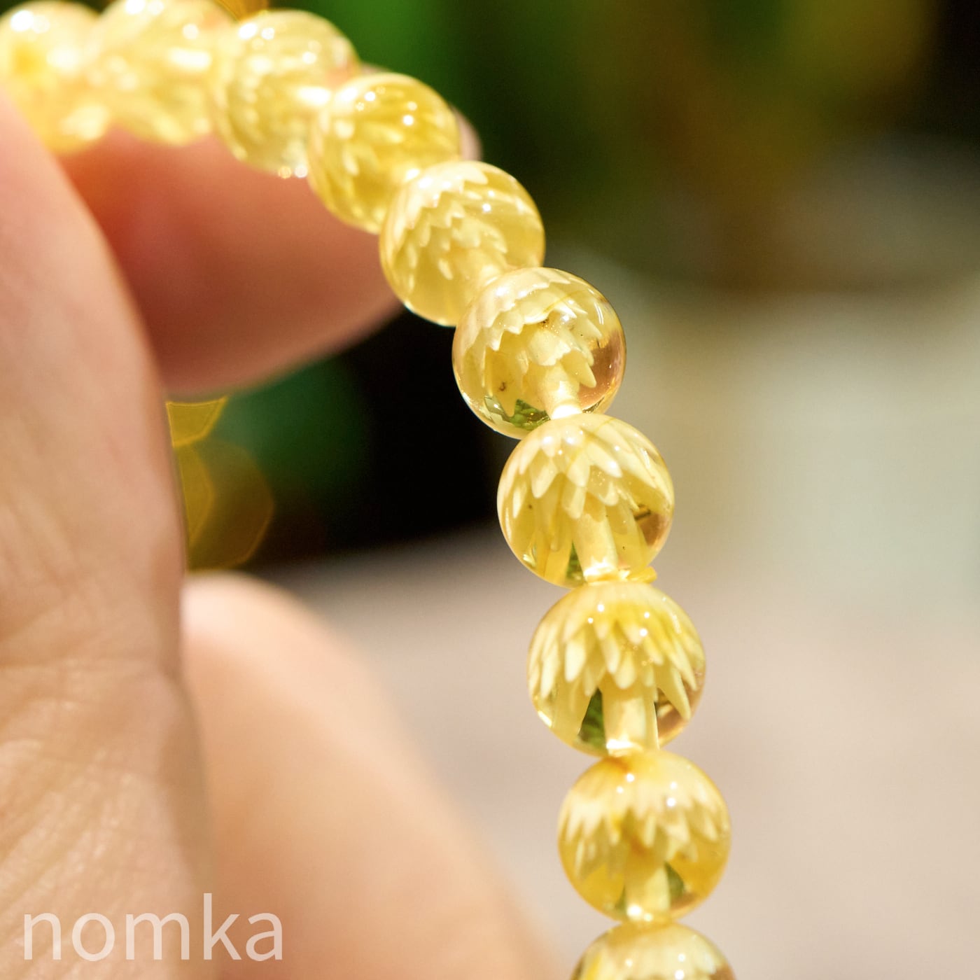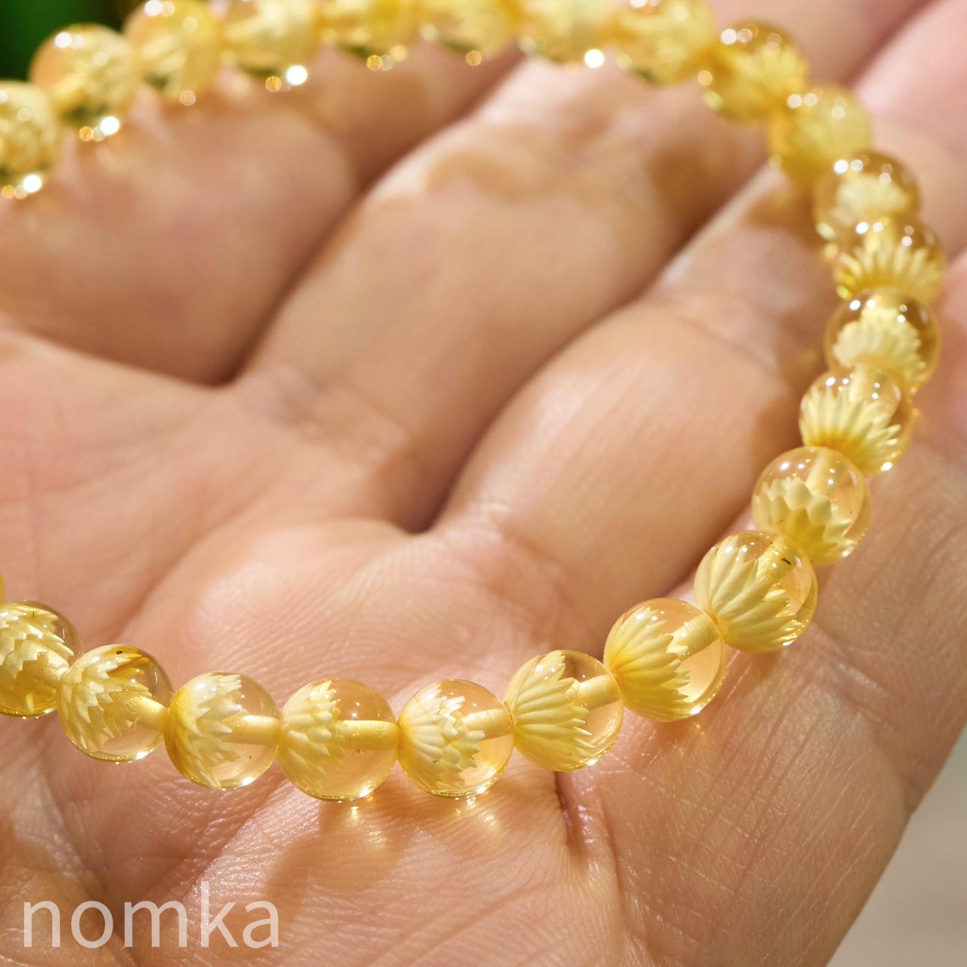 【光を纏う、聖なる花】バルト海産 レモンカラーアンバー(花彫刻) 一連ブレスレット (6.5mm珠/約17m)