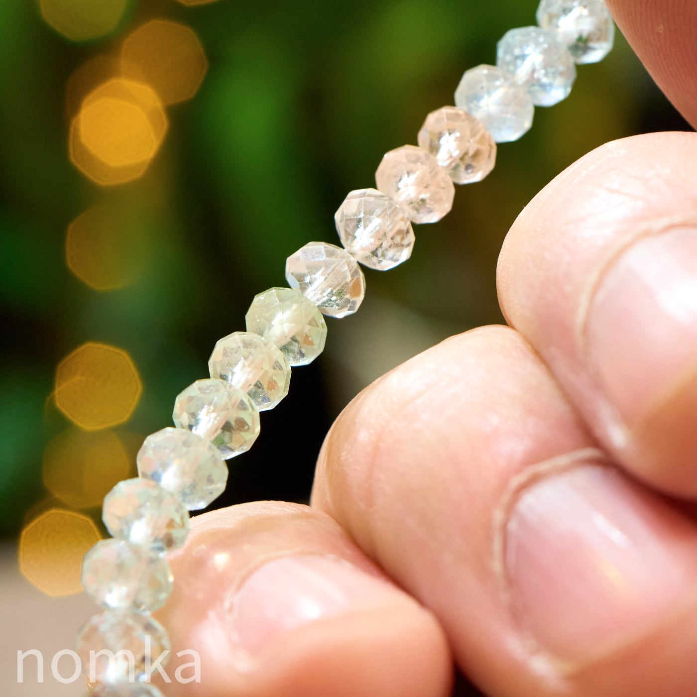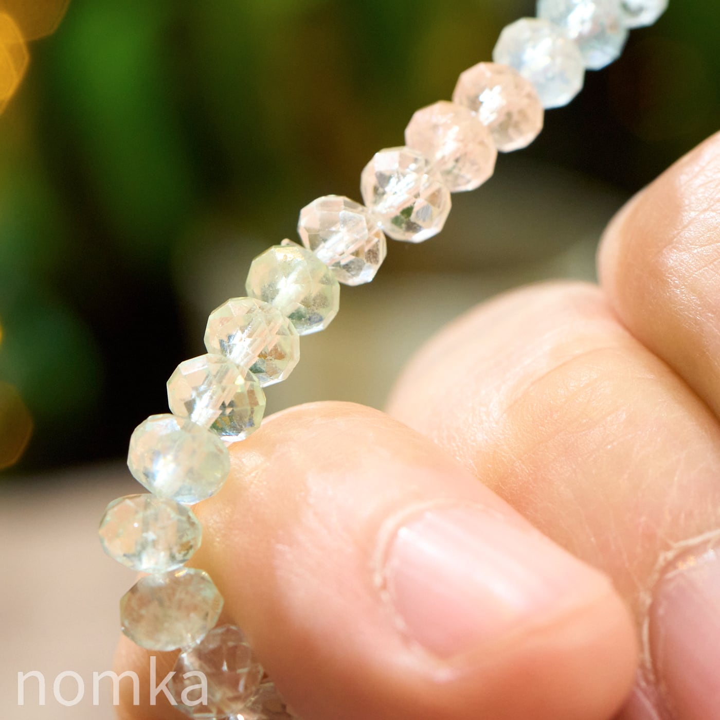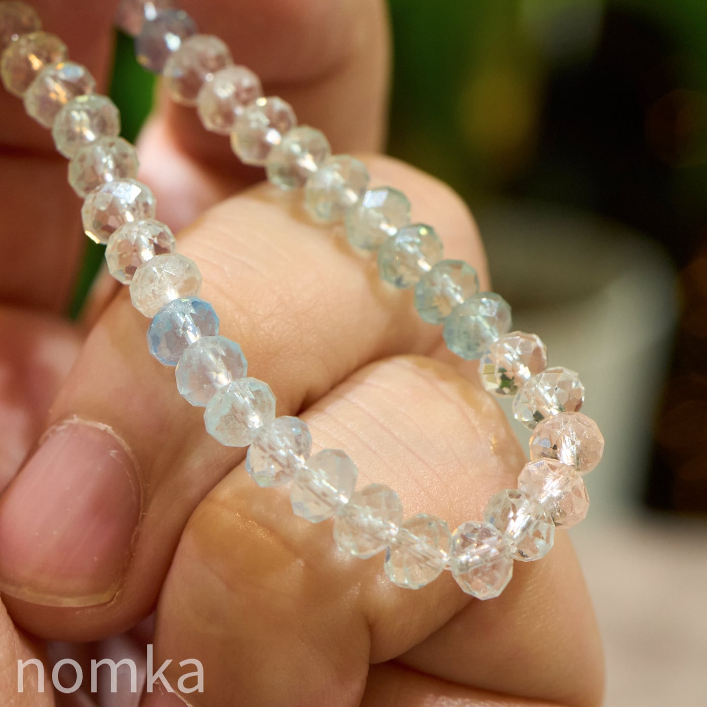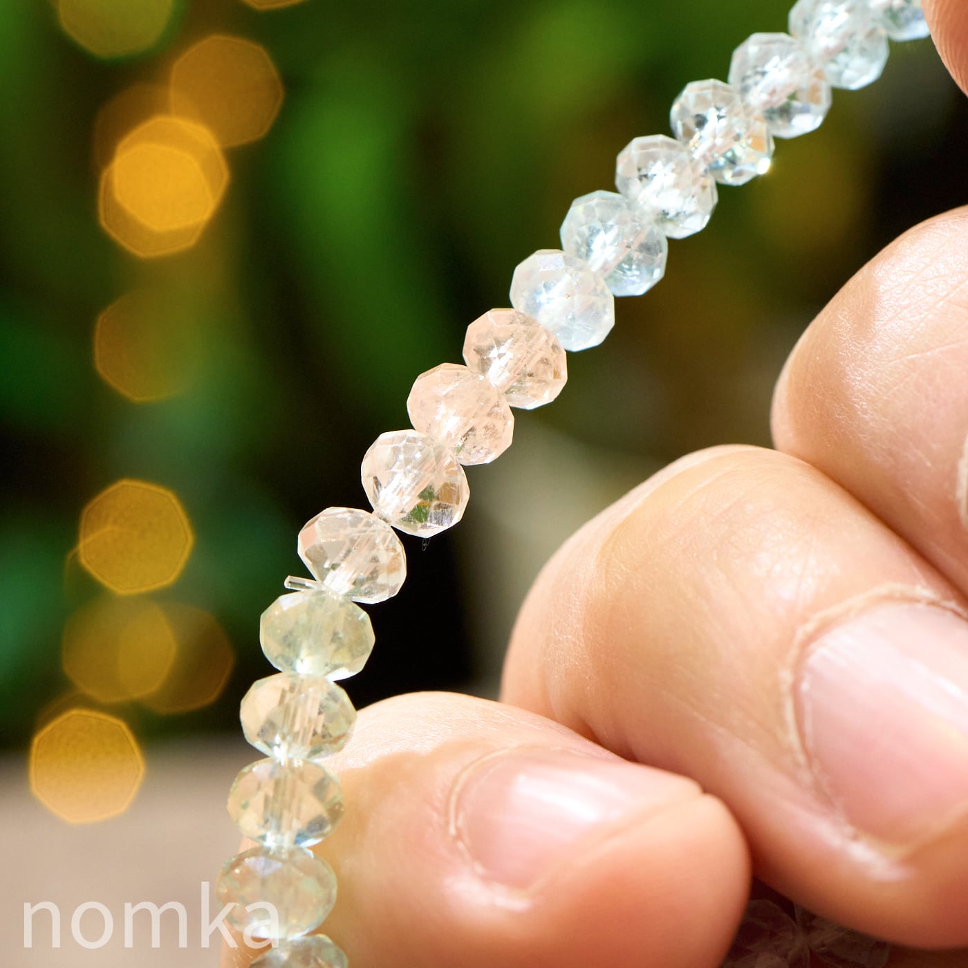 肌にのせると同化してしまいそうなほど一点の曇りもないクリアな質感が、この石のクオリティの高さを物語っています。精巧なボタンカットが施された一粒一粒が、光を細やかに反射し、手元を動かすたびにキラキラと繊細な光の華を散らします。