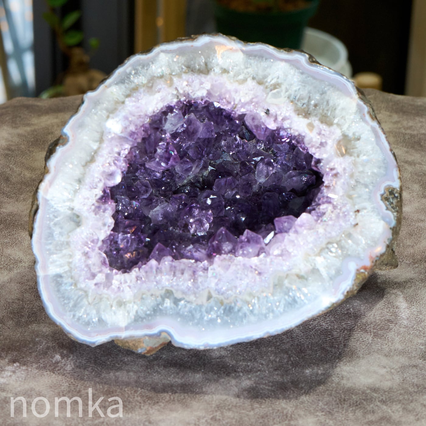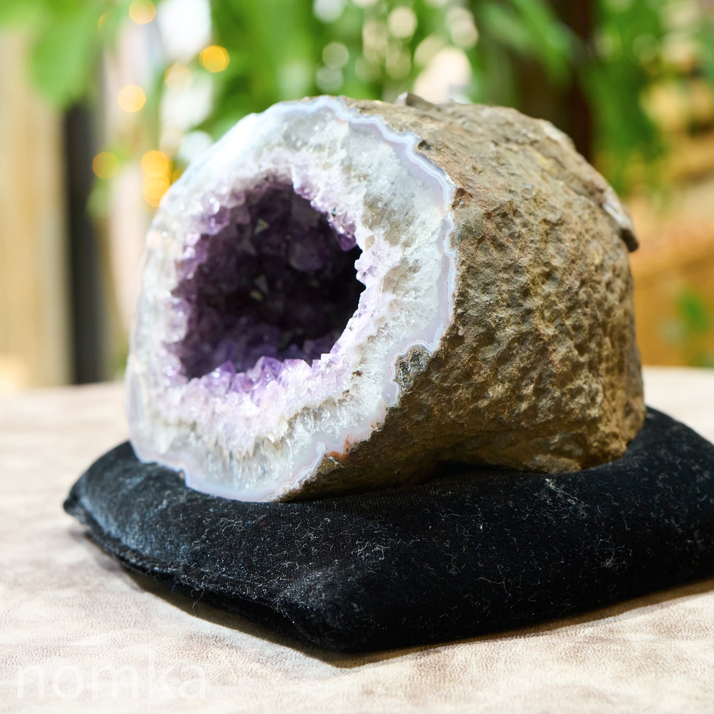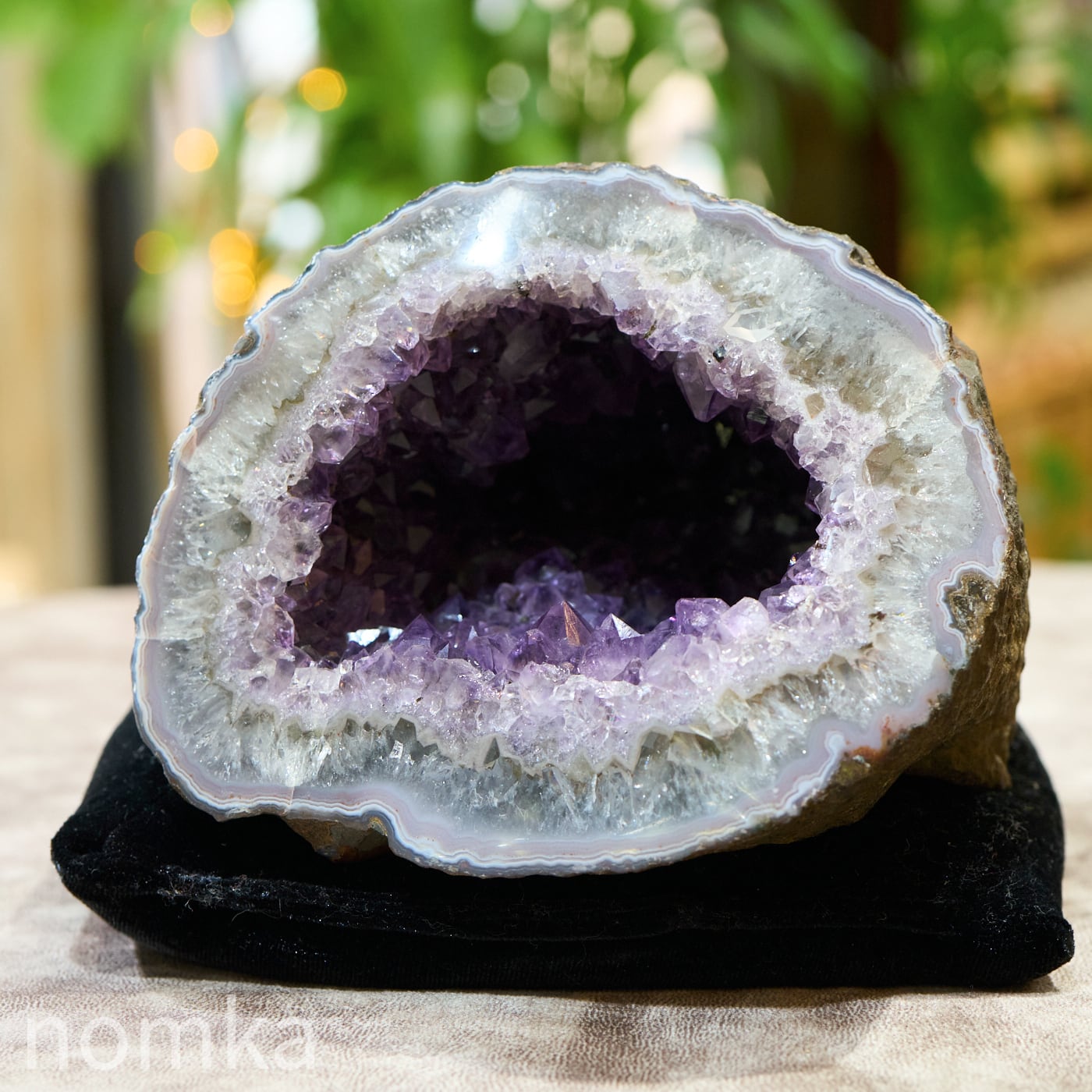 この個体の特徴は、なんといってもその「奥行き」です。約14cmという深さがあるため、空間の気をたっぷりと吸い込み、浄化して溜め込む力が非常に強いのが魅力です。 濃い紫の結晶が密集した内部は、まるで光を放つ洞窟のよう。