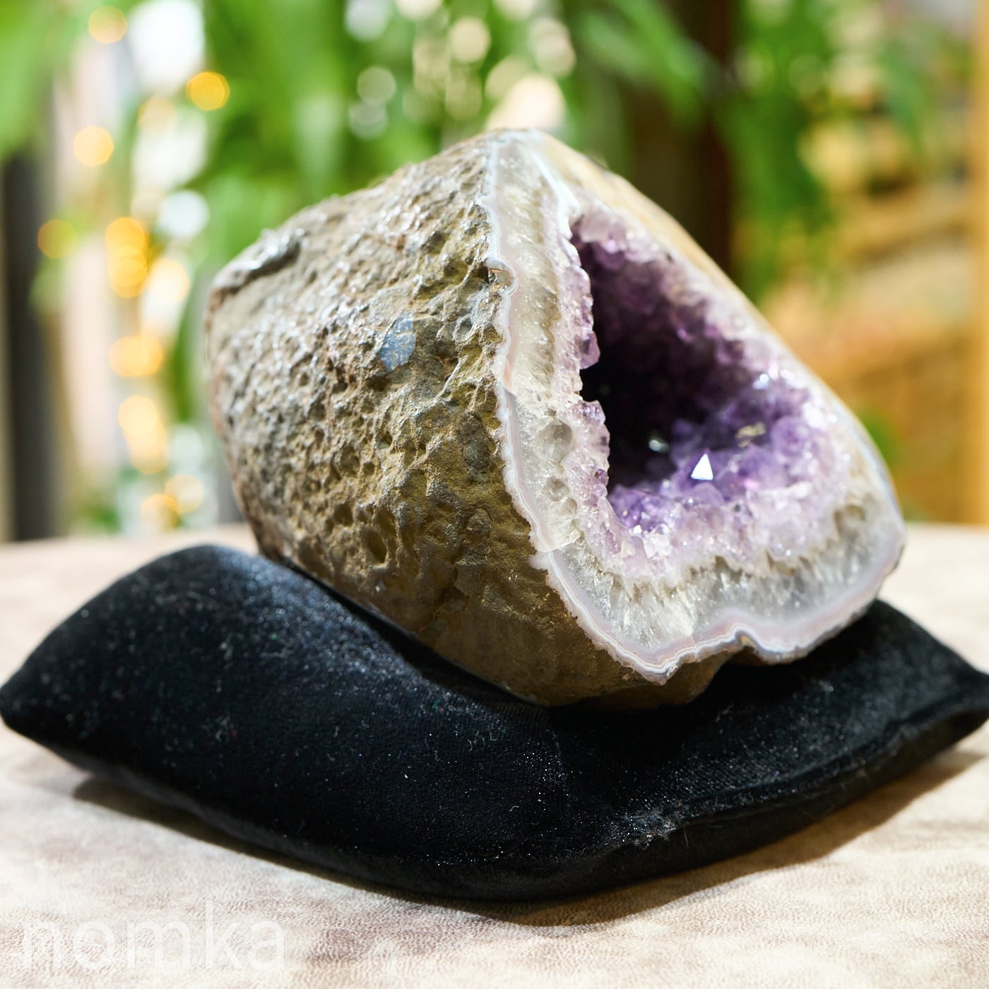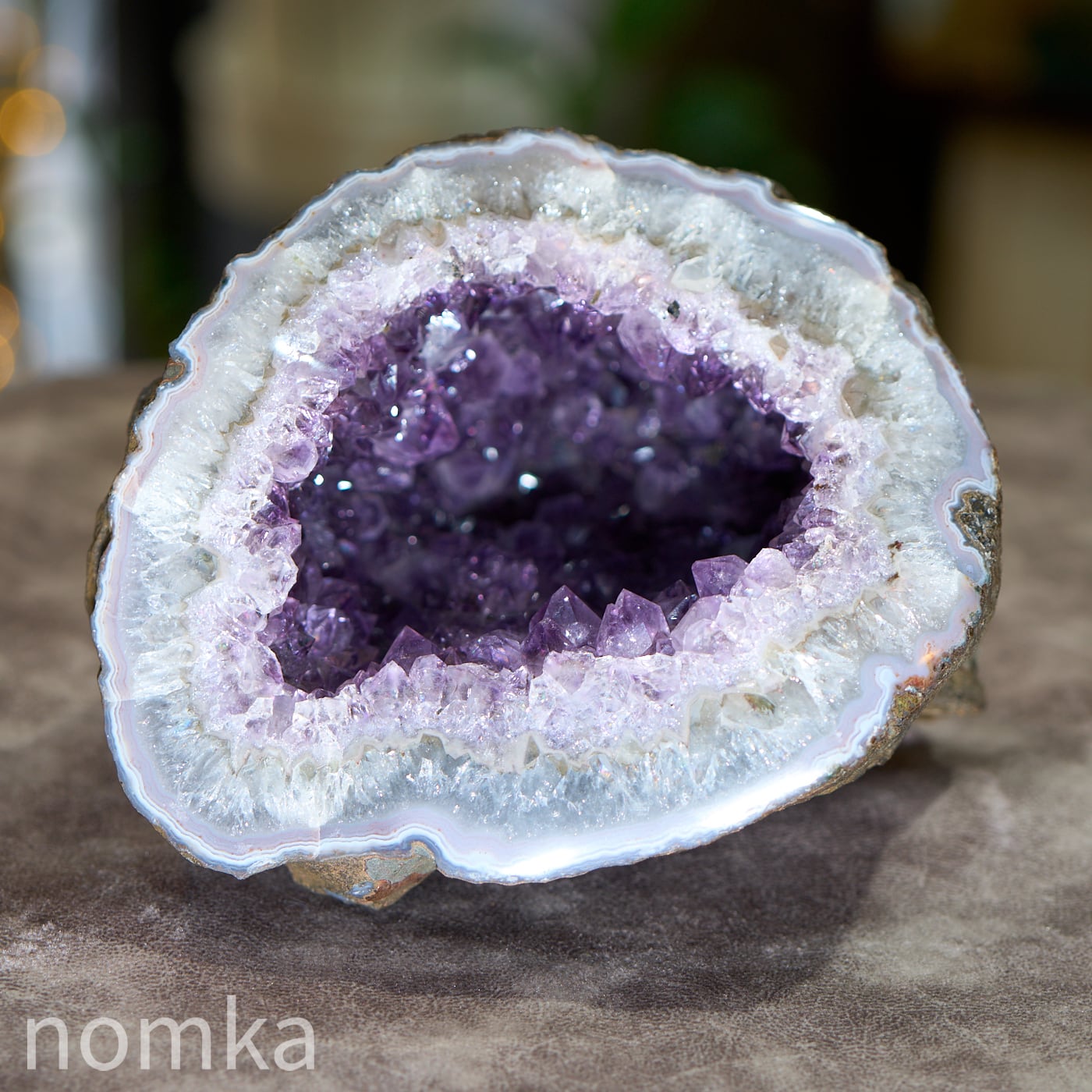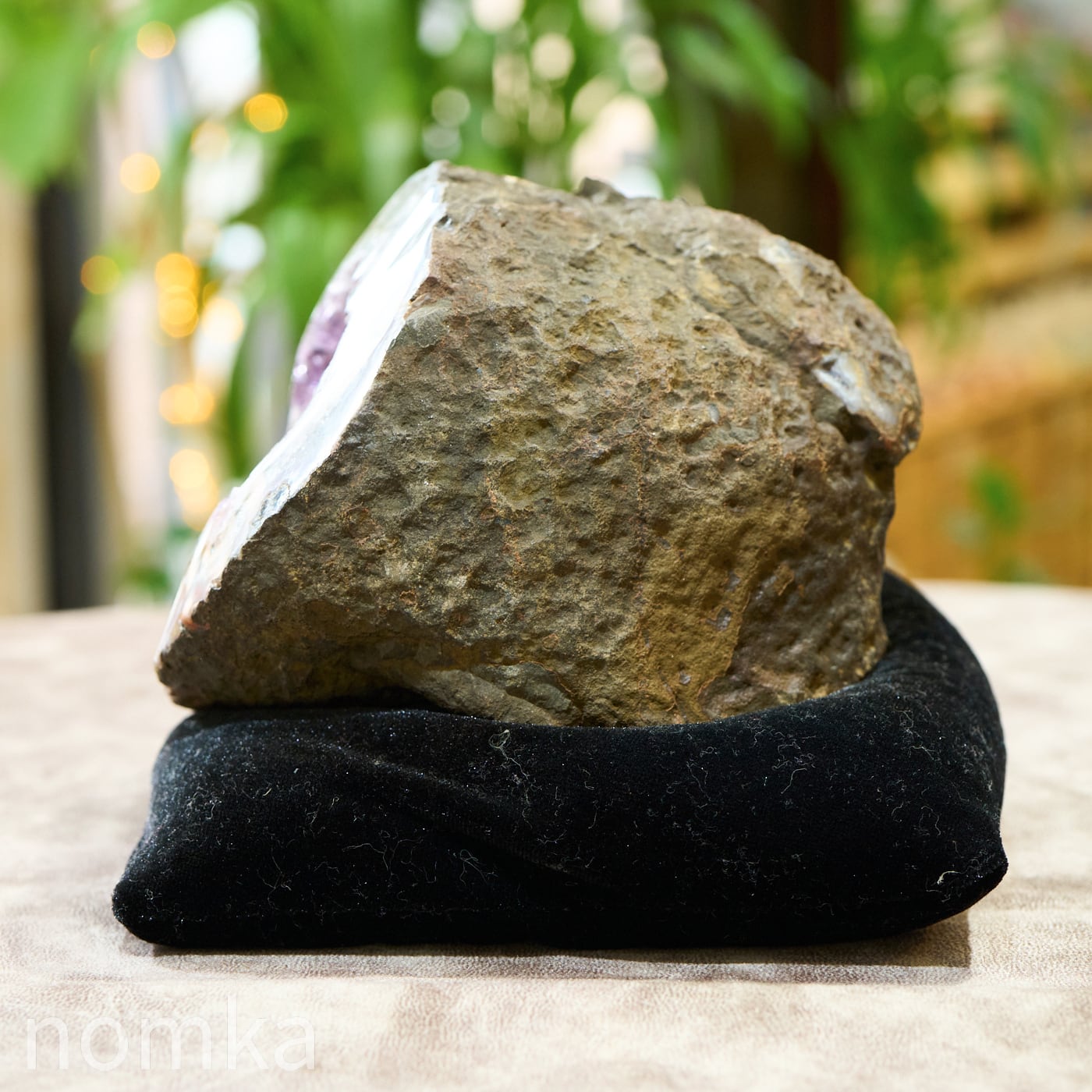この個体の特徴は、なんといってもその「奥行き」です。約14cmという深さがあるため、空間の気をたっぷりと吸い込み、浄化して溜め込む力が非常に強いのが魅力です。 濃い紫の結晶が密集した内部は、まるで光を放つ洞窟のよう。