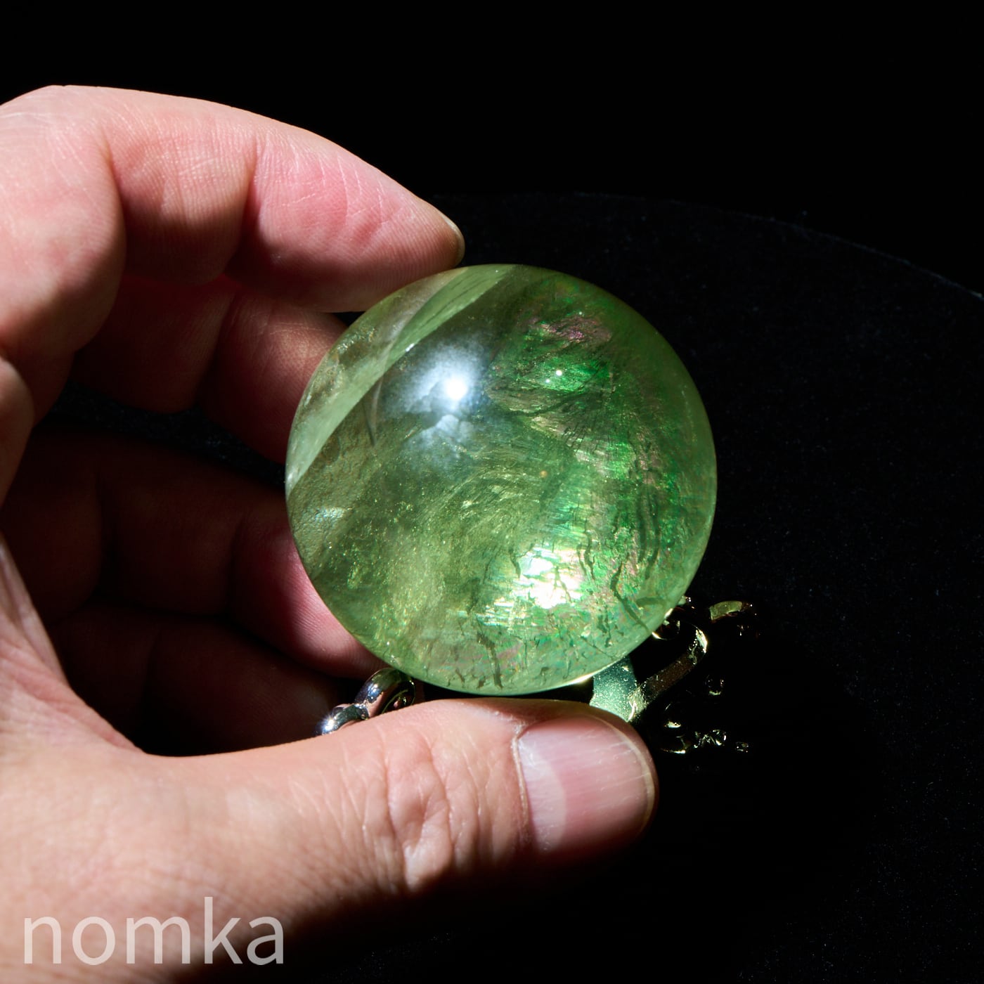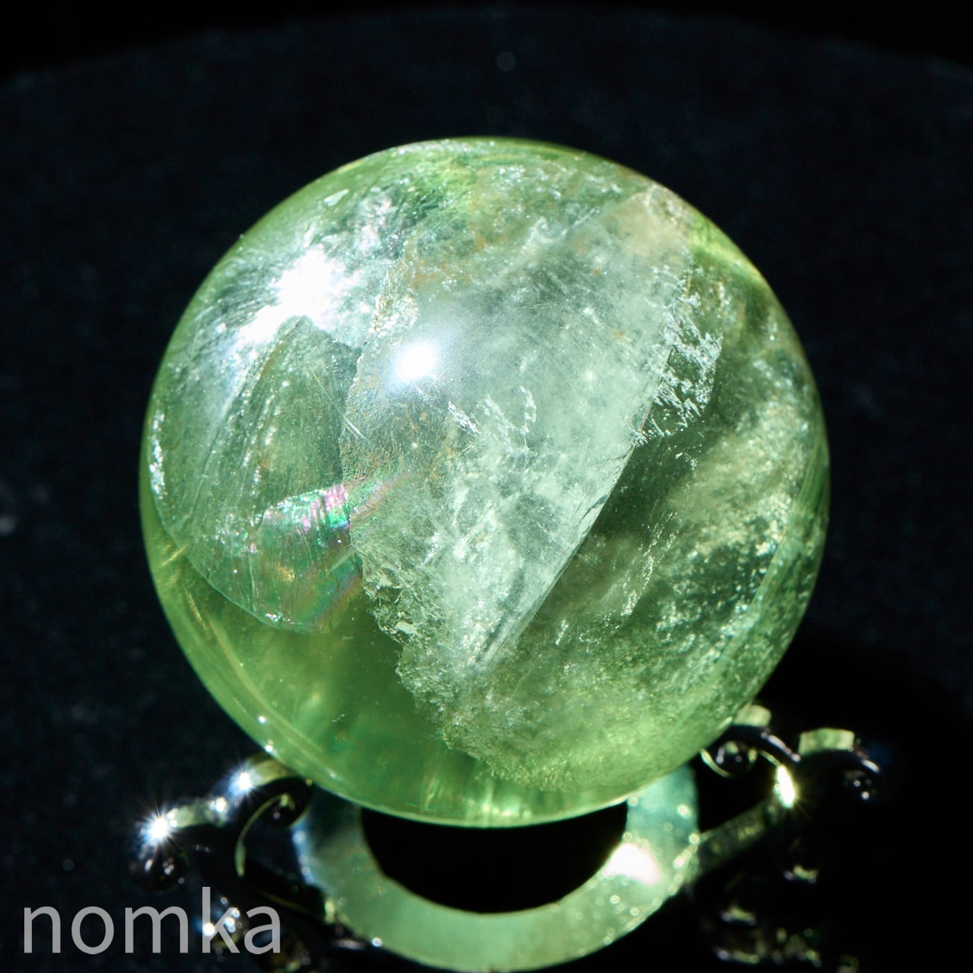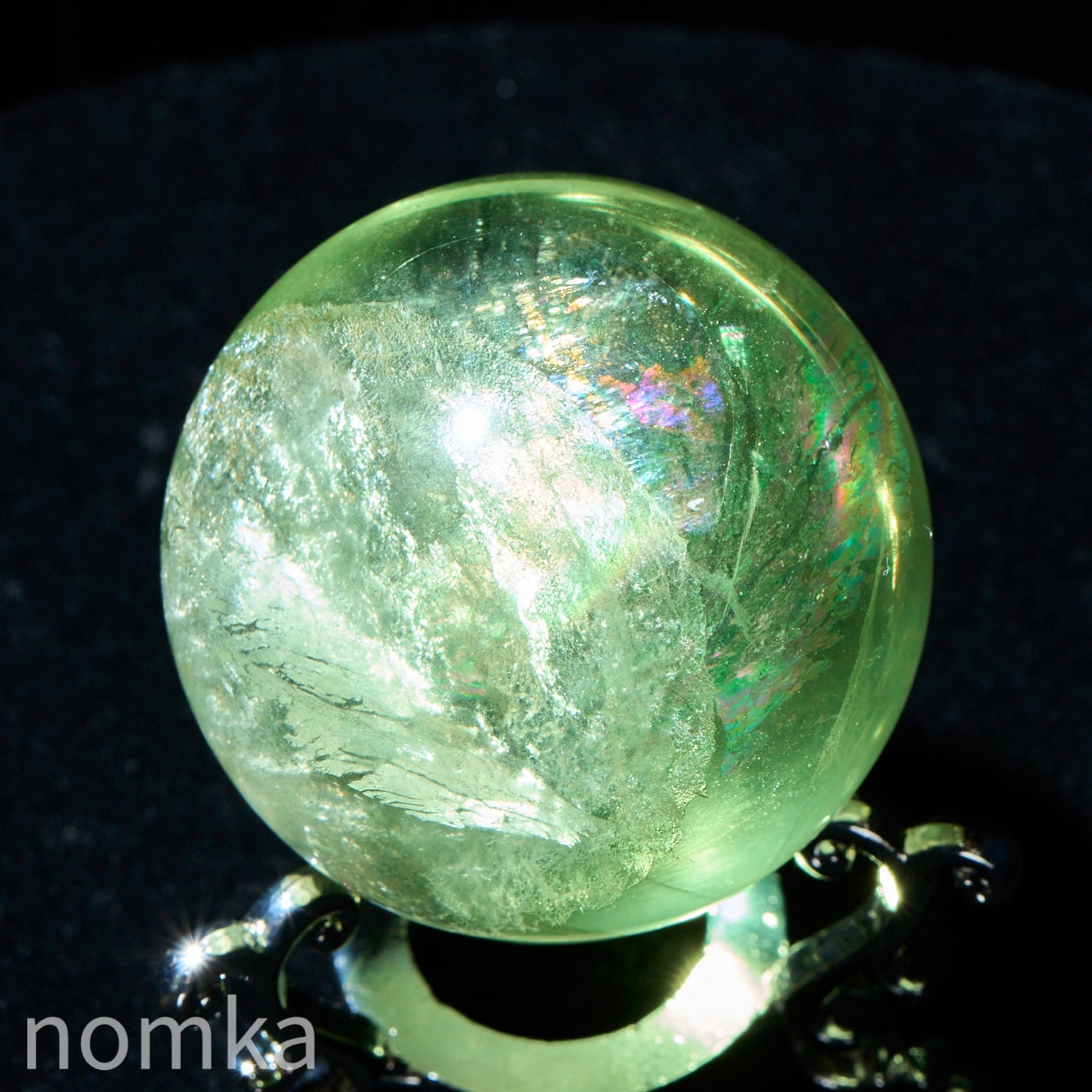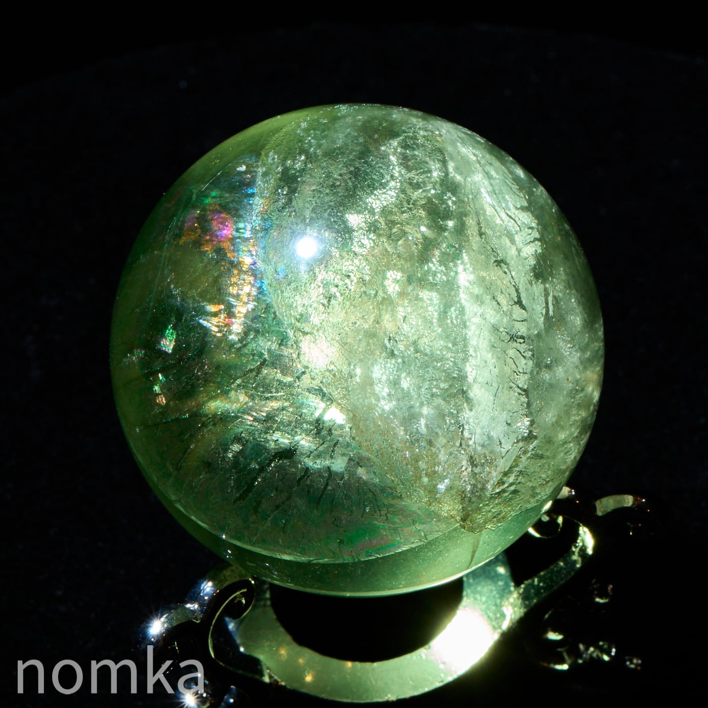 ひとたび光を纏えば、瑞々しいマスカットグリーンの中に、驚くほど鮮やかな「虹」が次々と浮かび上がります。中国産の高品質(AAAグレード)グリーンフローライトから、手のひらで心地よい重みを感じる45.5mmのスフィアが届きました。