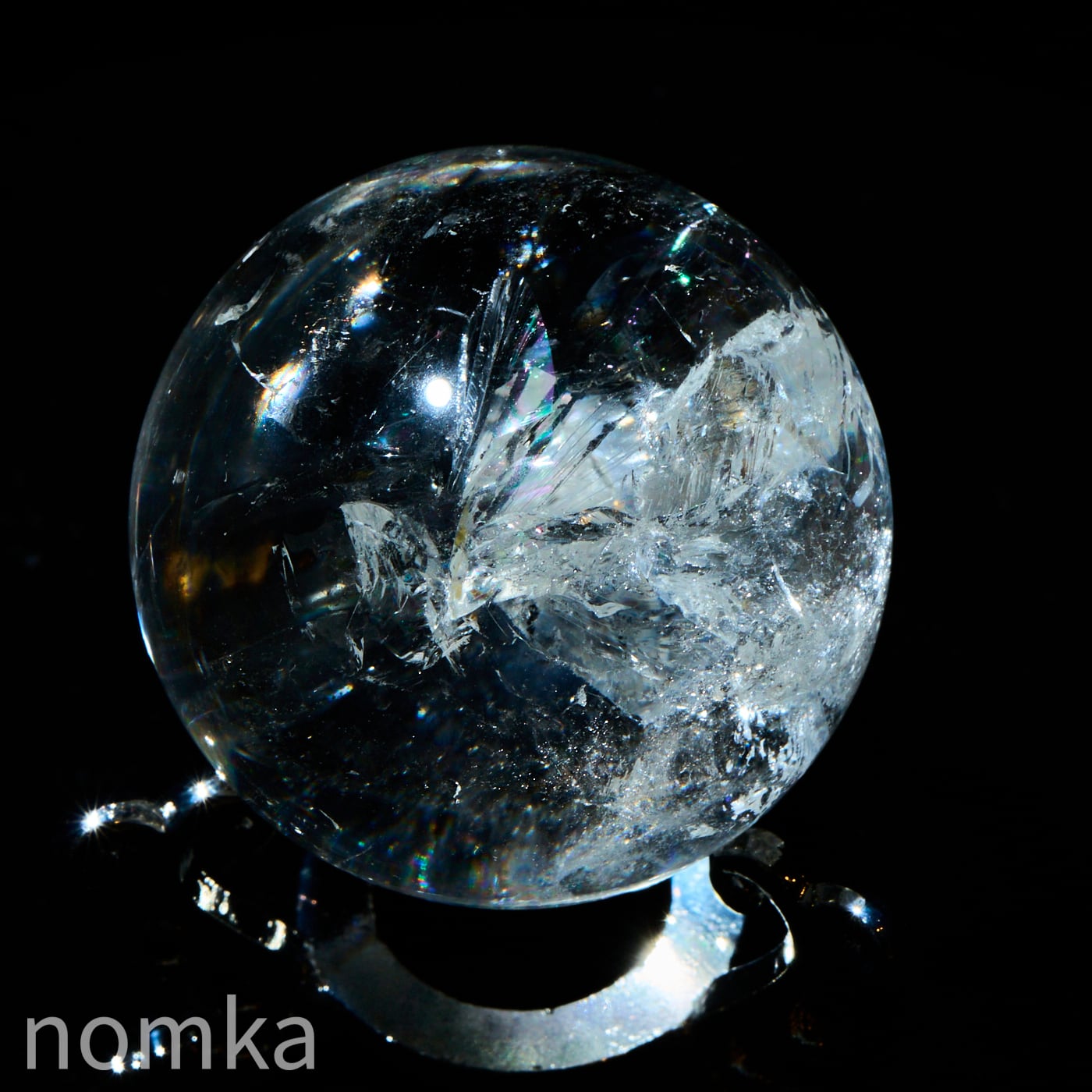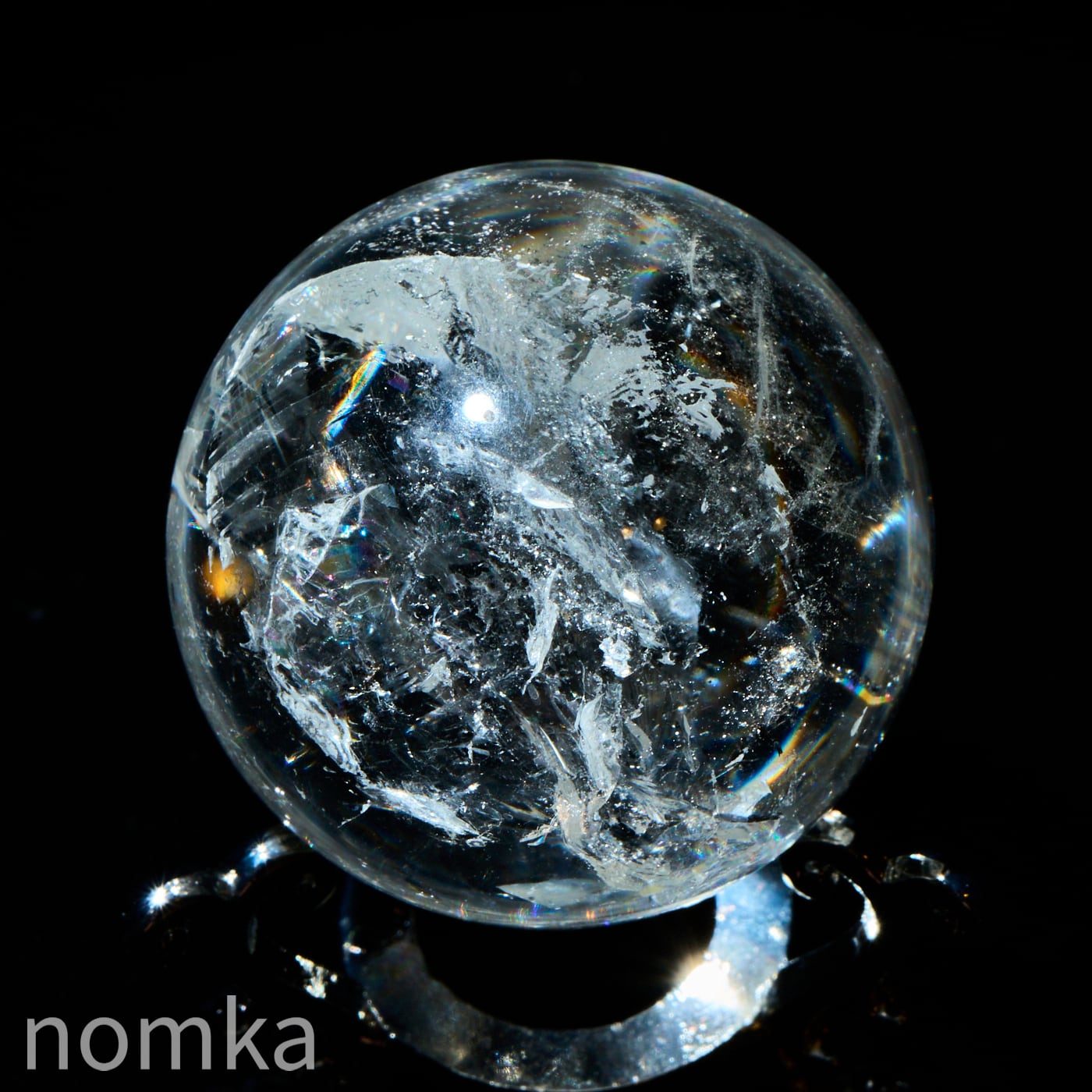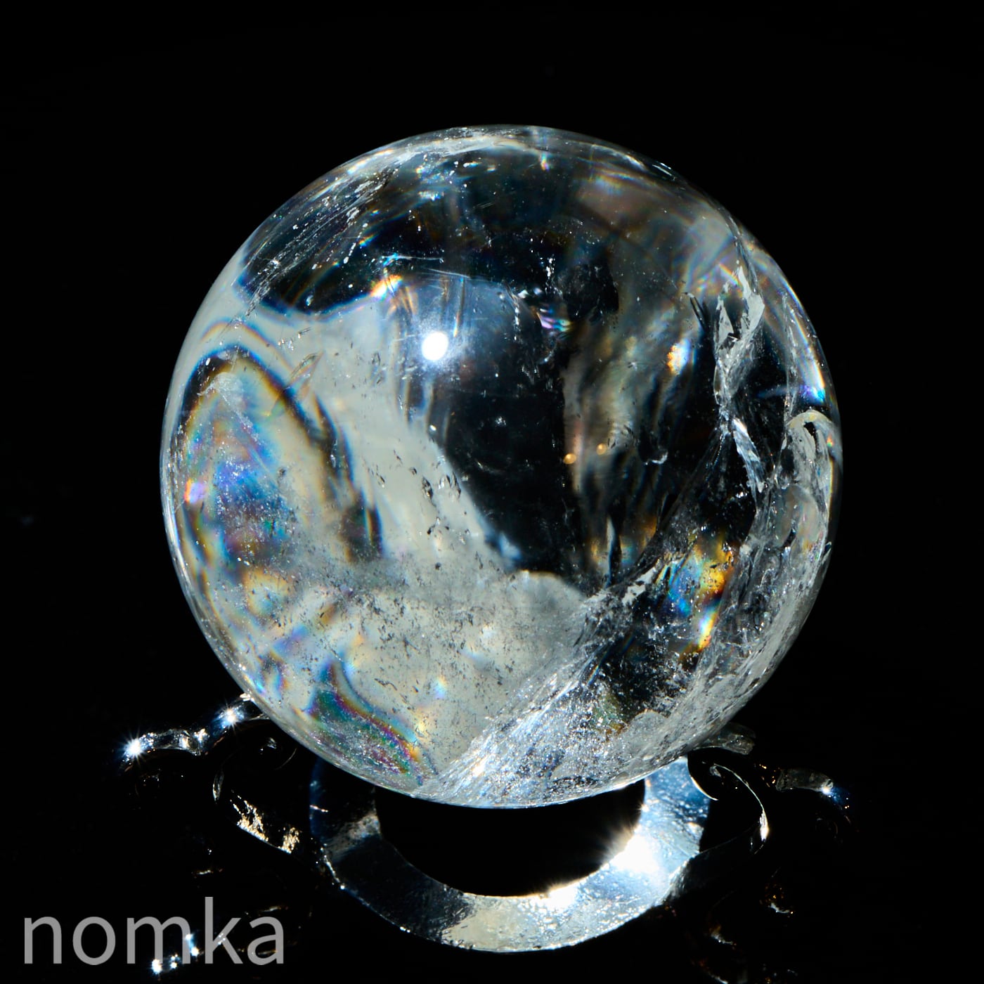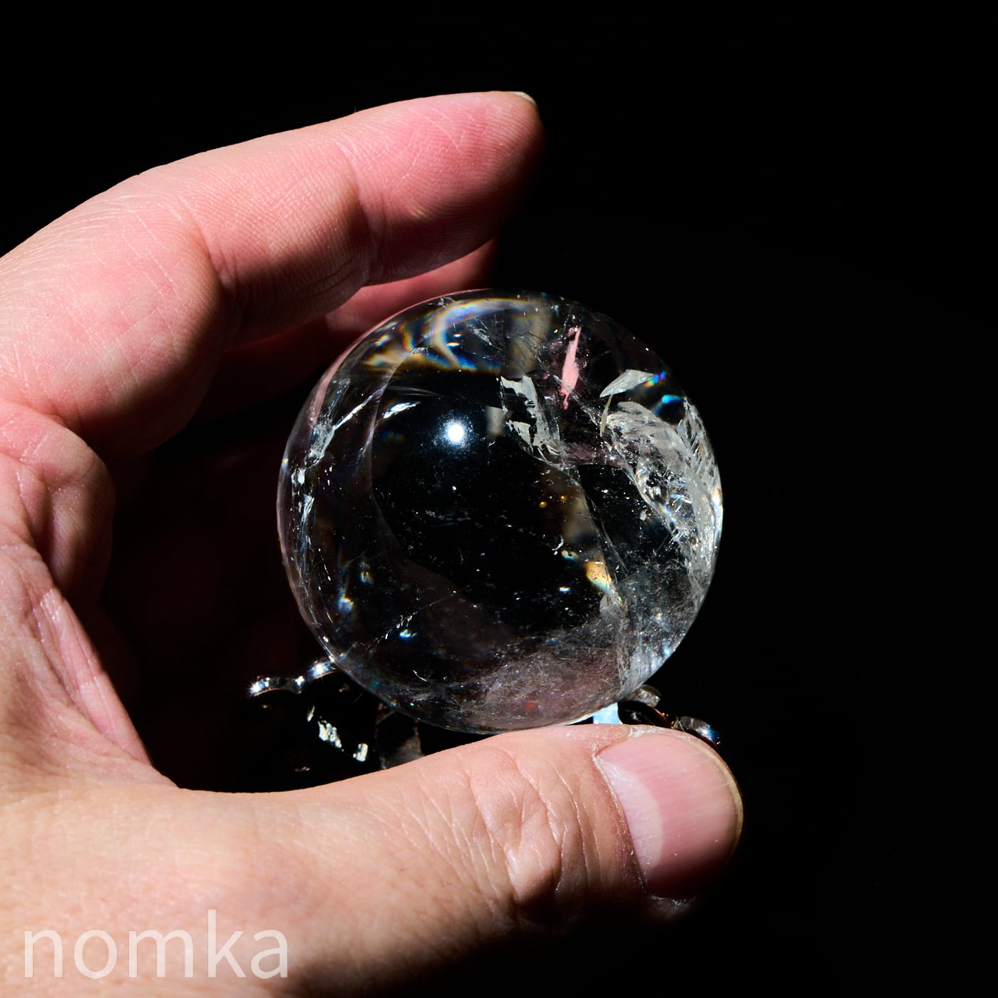 付属のランプに乗せると、透明度の高い水晶内部に刻まれたクラックやインクルージョンが光を複雑に乱反射させ、まるで銀河の渦を眺めているような、言葉にできないほど神秘的な光景が広がります。