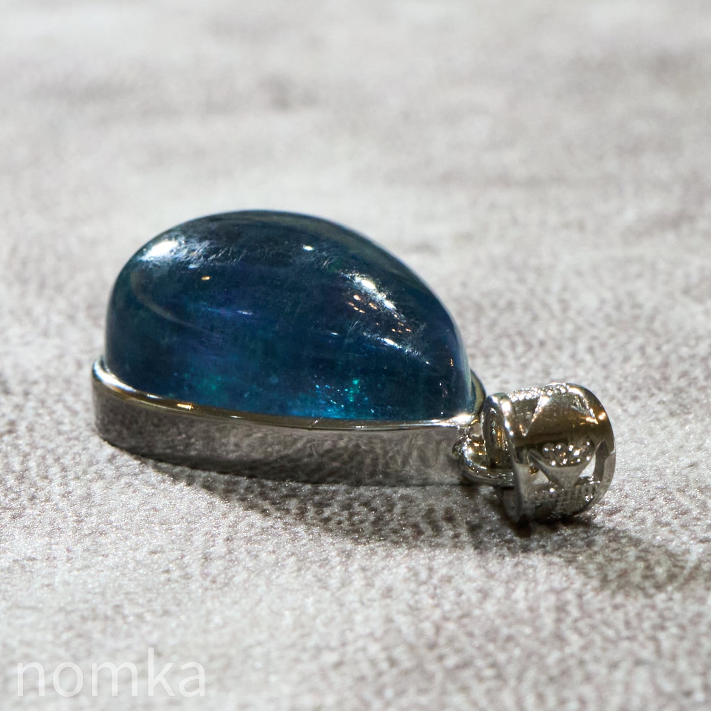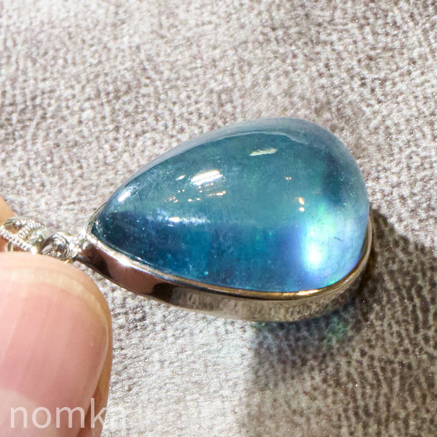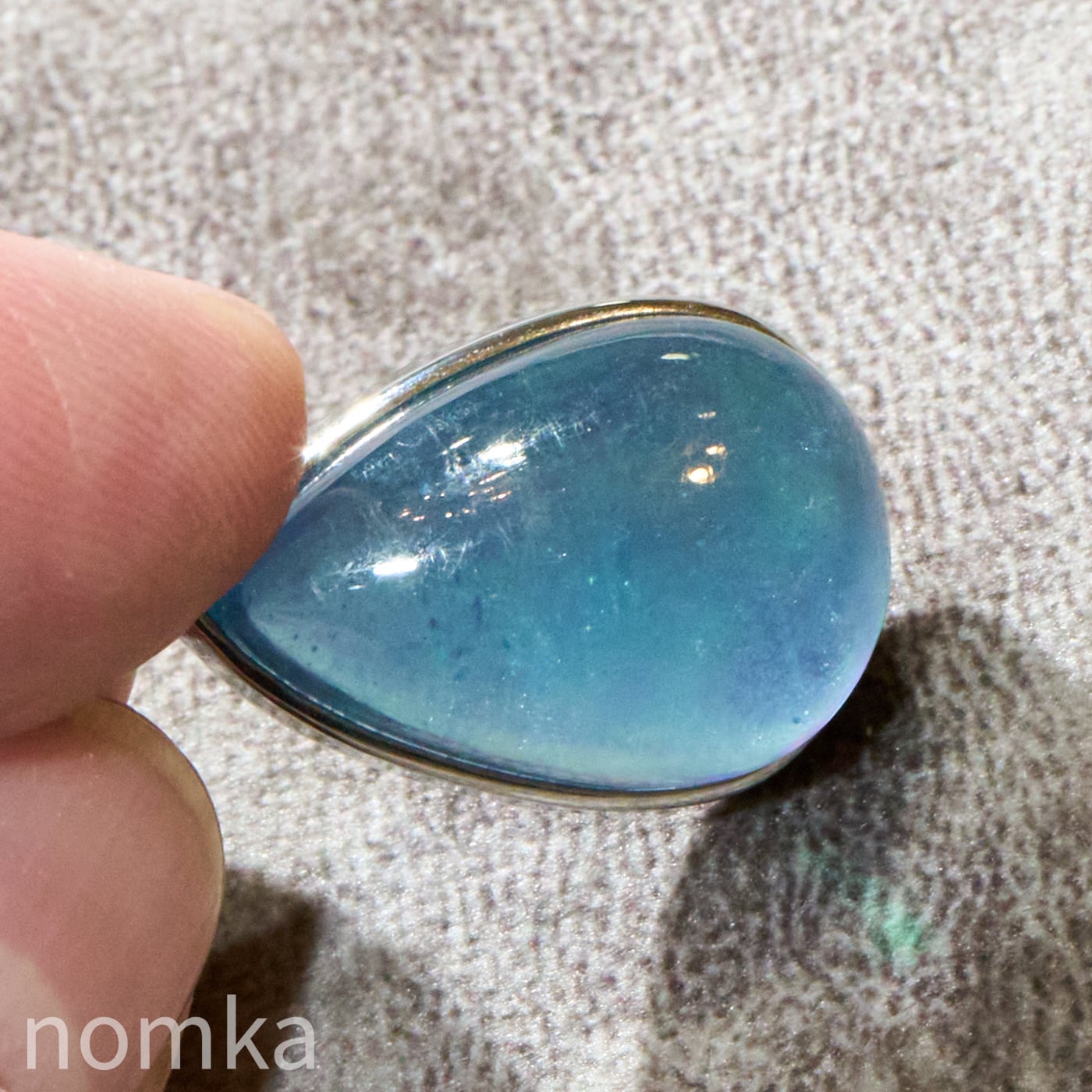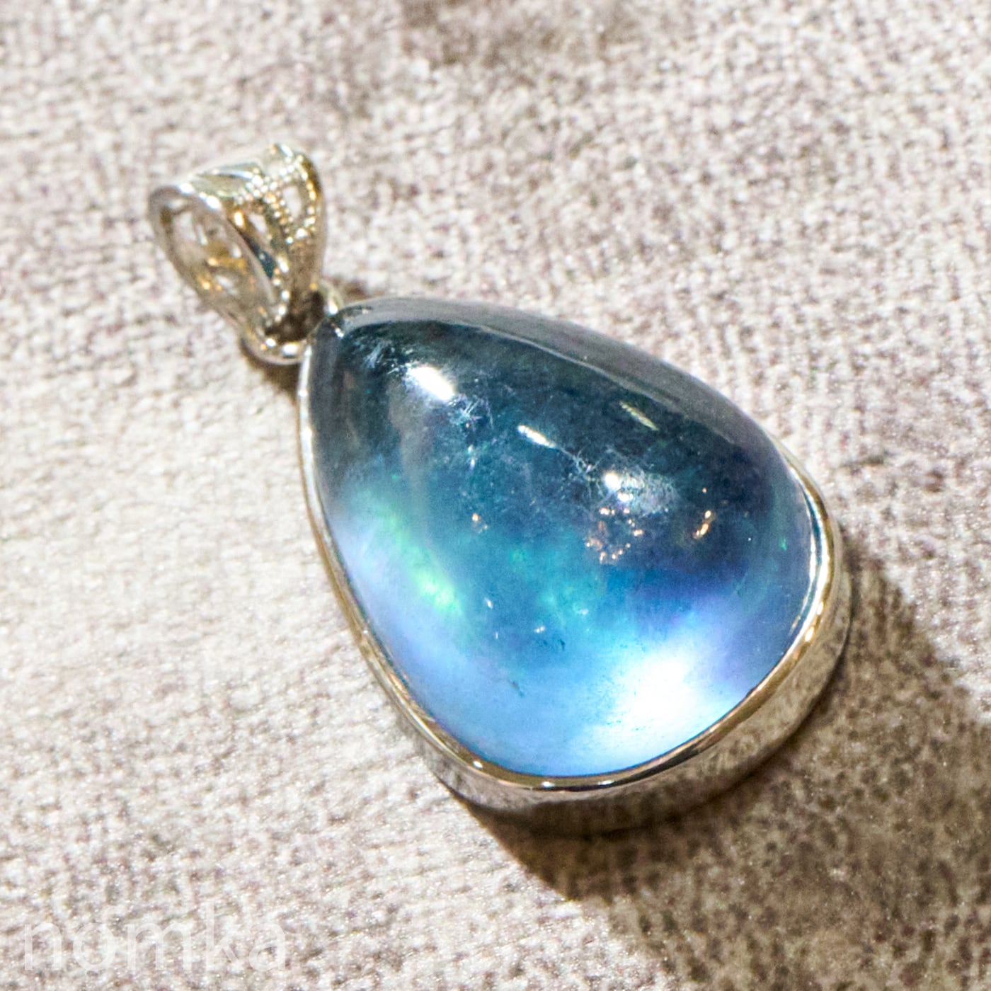 30mmを超える圧倒的な存在感を放つ大粒のペアシェイプ(しずく型)にカット。表面は滑らかなカボション仕上げとなっており、石の内部に広がる幻想的なインクルージョンや、水底を覗き込むような奥行きのある表情を存分に堪能できます。