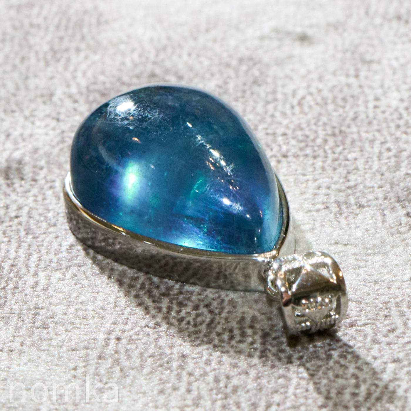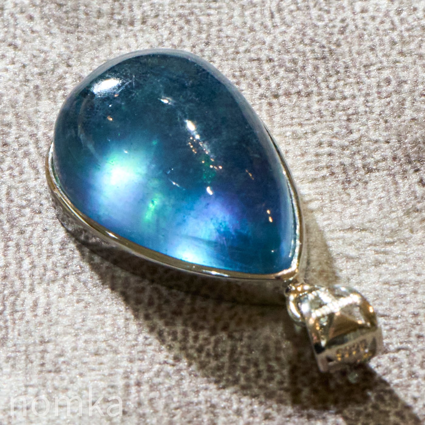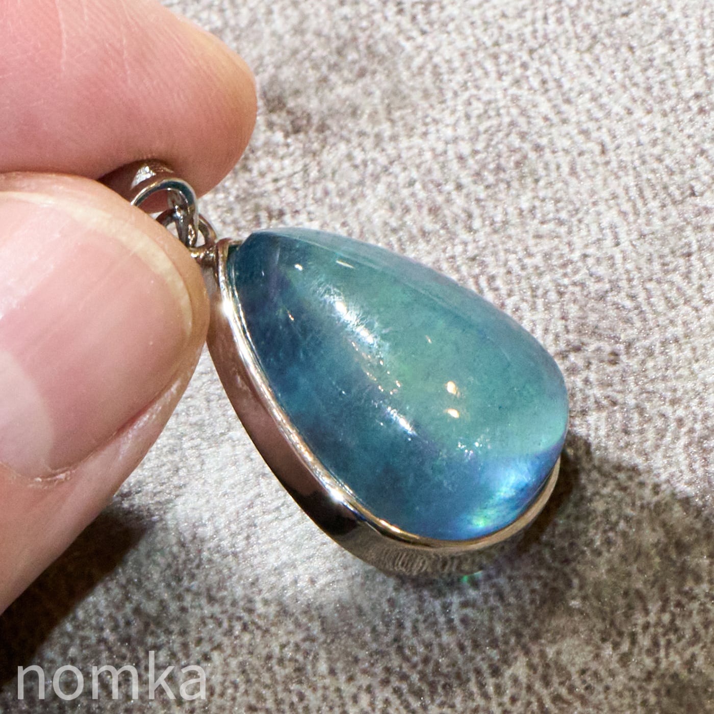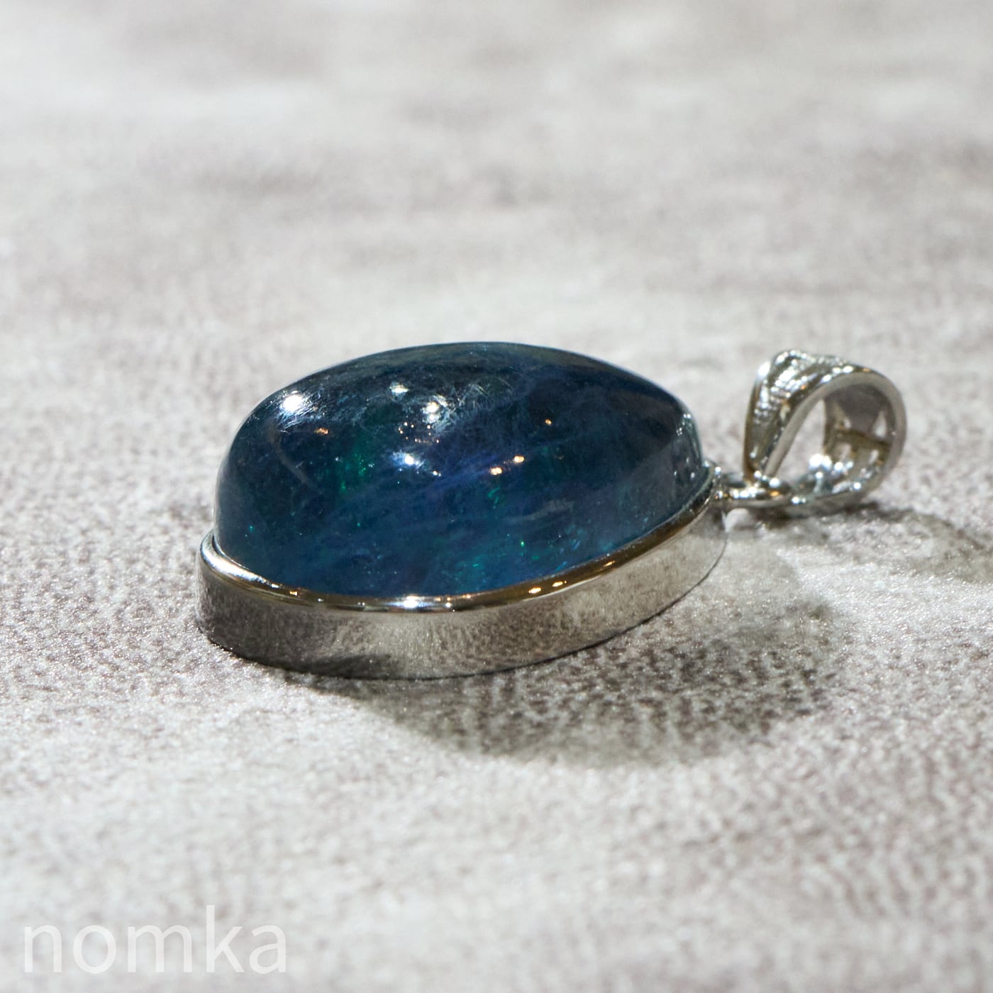 30mmを超える圧倒的な存在感を放つ大粒のペアシェイプ(しずく型)にカット。表面は滑らかなカボション仕上げとなっており、石の内部に広がる幻想的なインクルージョンや、水底を覗き込むような奥行きのある表情を存分に堪能できます。